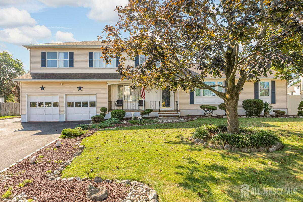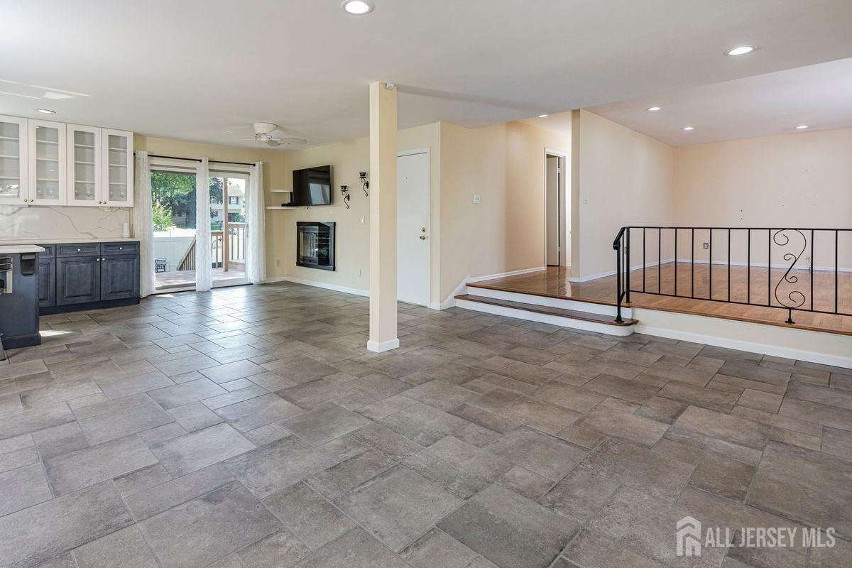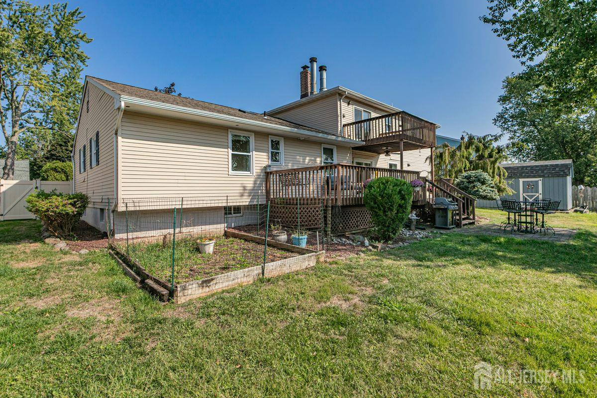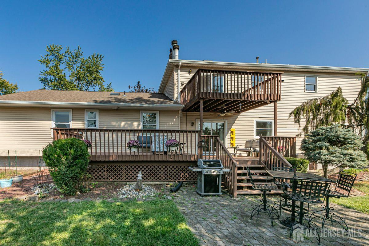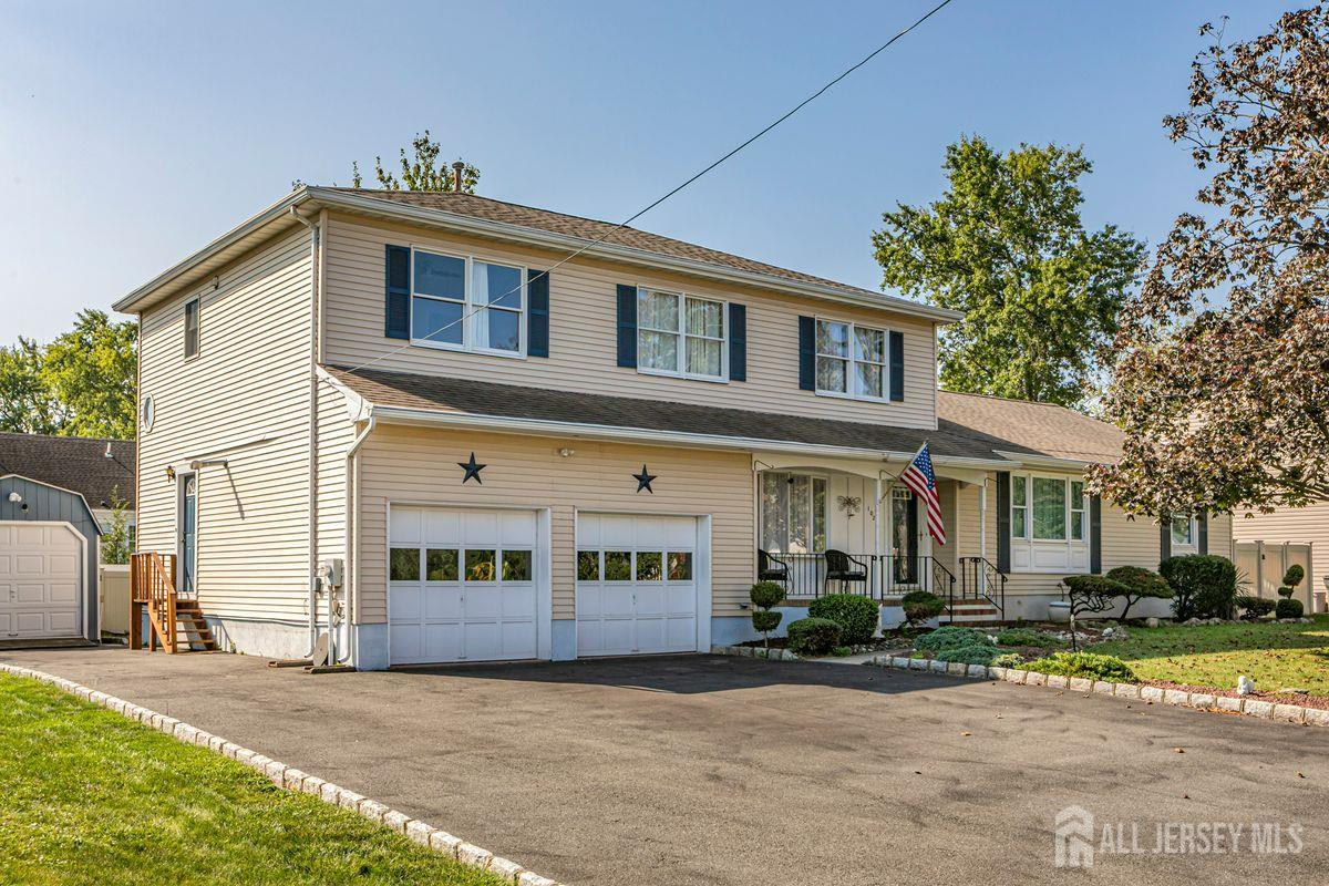 On a tastefully landscaped lot, this north-facing, sun-filled home offers two distinct living areas for flexible living arrangements and/or extended stays. The main level welcomes with three spacious bedrooms, a fully renovated kitchen, and a dining nook warmed by a fireplace. The primary suite features a private bath, while a second full bath serves the remaining bedrooms. A finished lower level adds even more room to relax. Upstairs, a separate two-bedroom layout includes a bright living room, updated kitchen, dining area with a fireplace, an accessible bathroom, and an elevated deck overlooking the sunny backyard. Both levels share access to a mudroom entry from the two-car garage and a convenient laundry area. Enjoy outdoor living with a generous yard, patio, and storage shed all bathed in afternoon sunlight thanks to the home's ideal orientation. Located just minutes from I-287 and four miles to Edison Station with NJ Transit and Amtrak service, this property offers convenience and versatility in one inviting package.