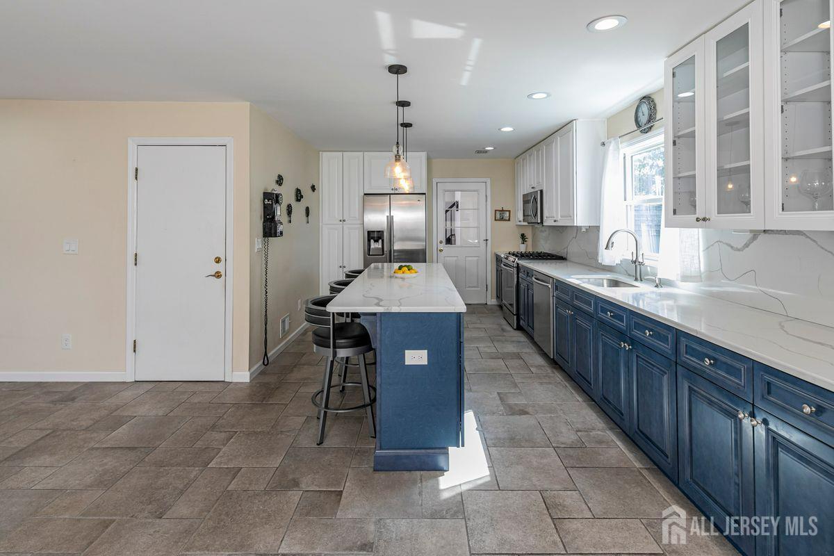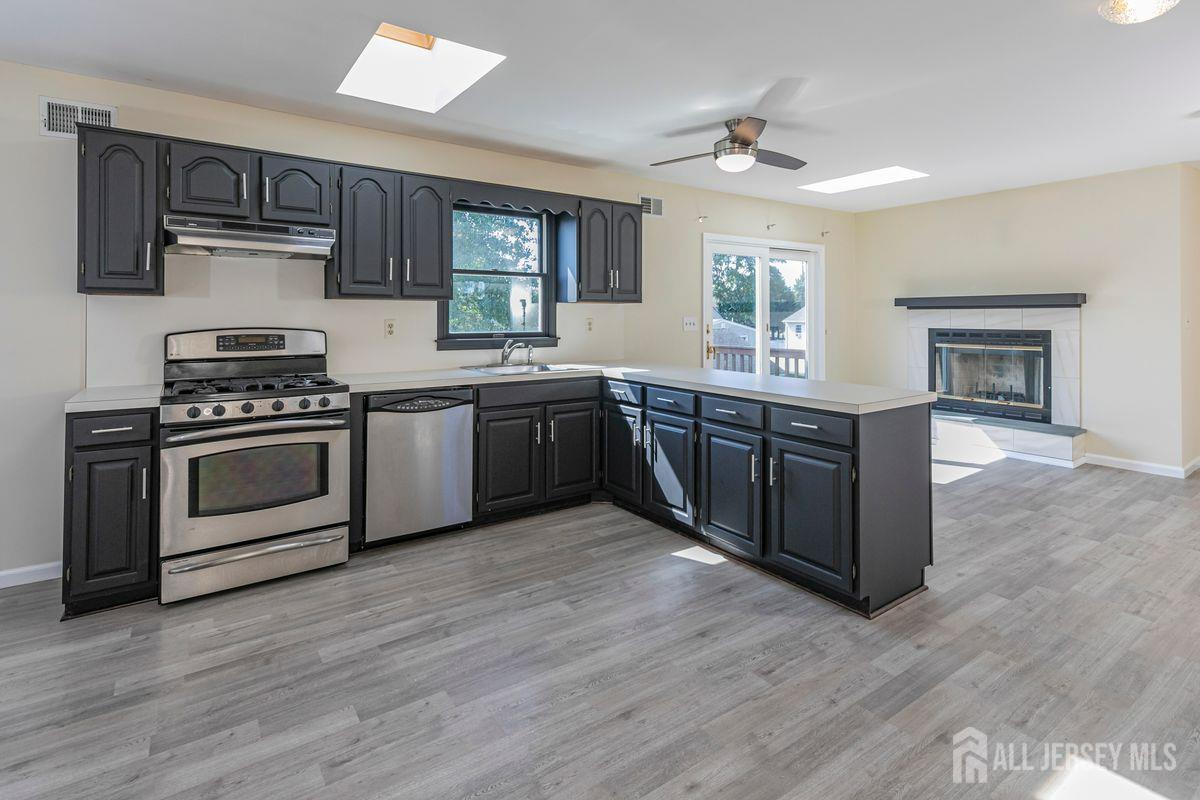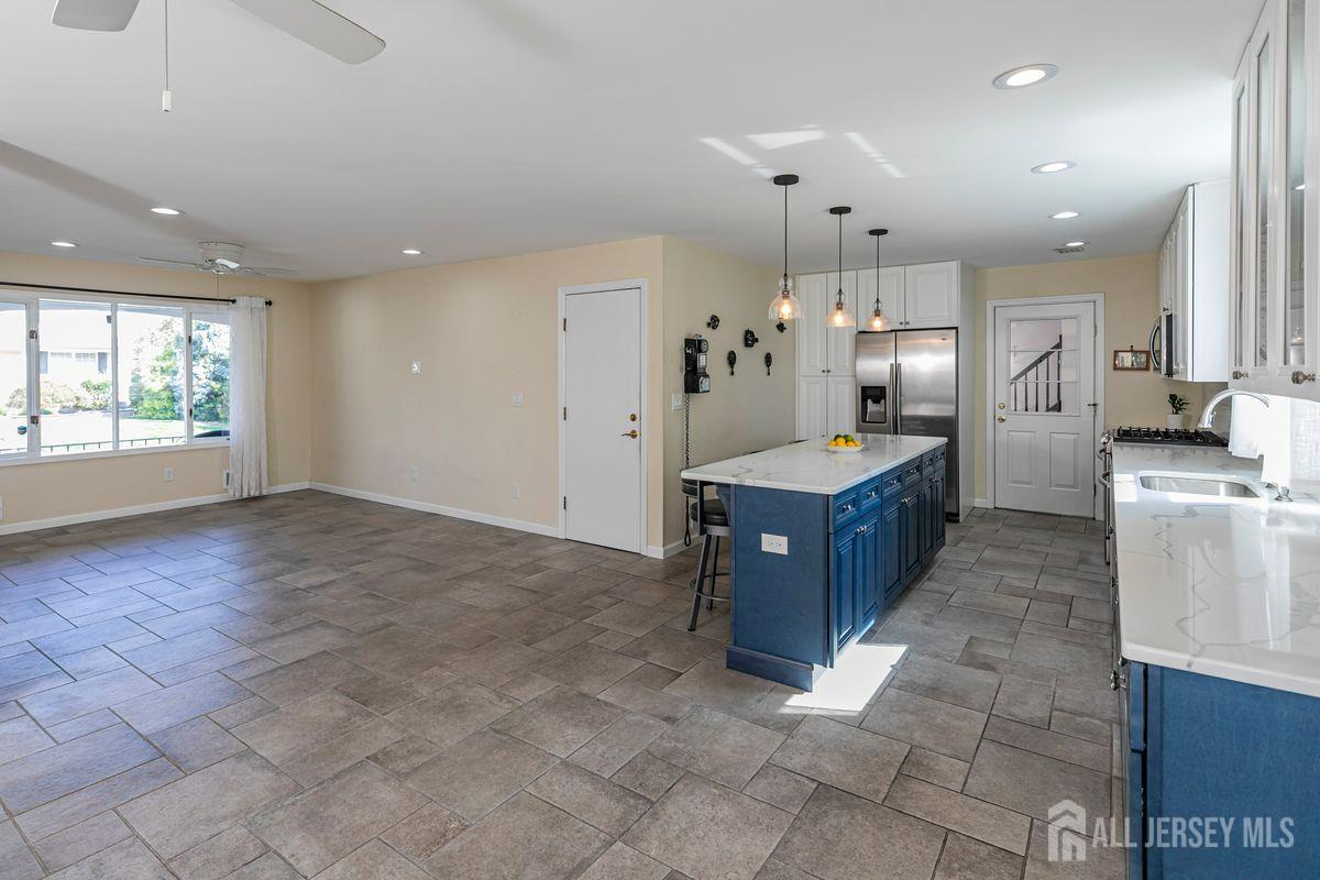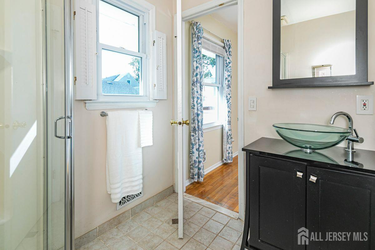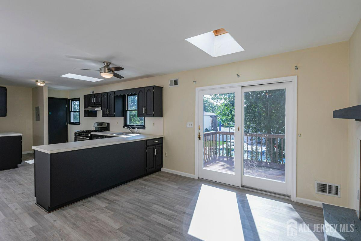 On a tastefully landscaped lot, this north-facing, sun-filled home offers two distinct living areas for flexible living arrangements and/or extended stays. The main level welcomes with three spacious bedrooms, a fully renovated kitchen, and a dining nook warmed by a fireplace. The primary suite features a private bath, while a second full bath serves the remaining bedrooms. A finished lower level adds even more room to relax. Upstairs, a separate two-bedroom layout includes a bright living room, updated kitchen, dining area with a fireplace, an accessible bathroom, and an elevated deck overlooking the sunny backyard. Both levels share access to a mudroom entry from the two-car garage and a convenient laundry area. Enjoy outdoor living with a generous yard, patio, and storage shed all bathed in afternoon sunlight thanks to the home's ideal orientation. Located just minutes from I-287 and four miles to Edison Station with NJ Transit and Amtrak service, this property offers convenience and versatility in one inviting package.