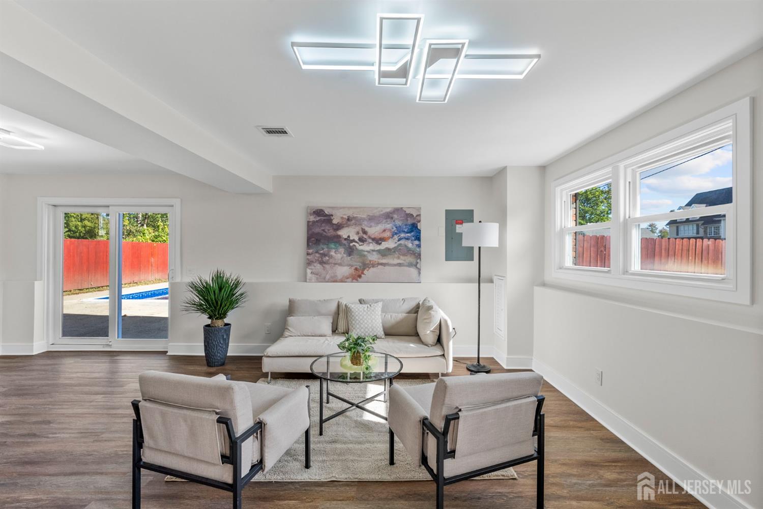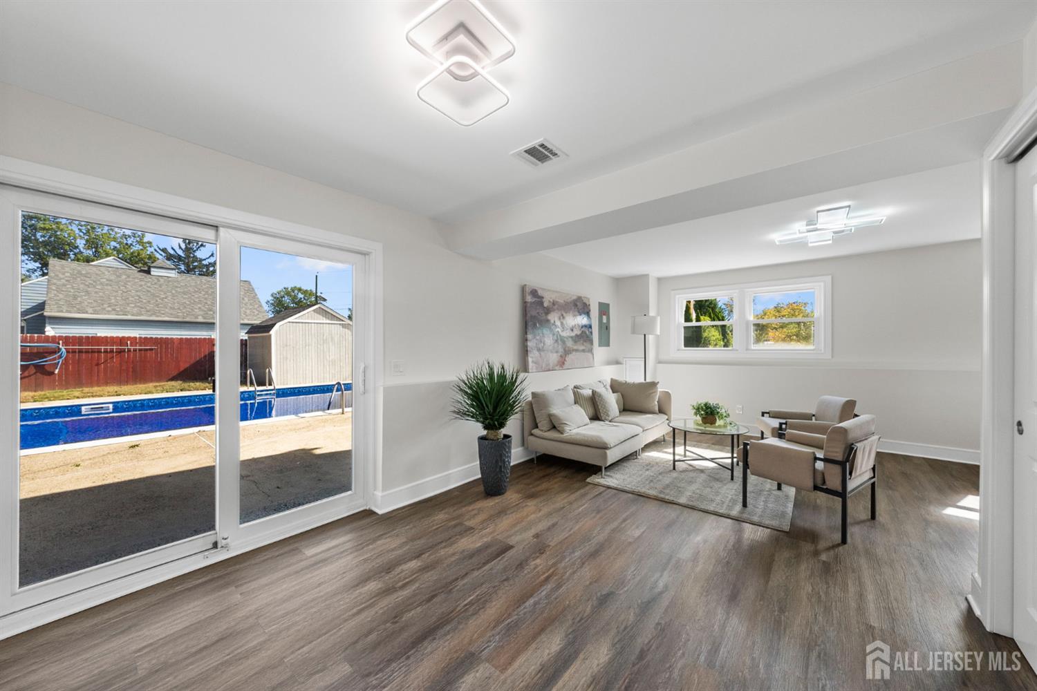 Welcome to this beautifully redesigned Bi-Level home offering modern comfort, style, and functionality. Every detail has been thoughtfully updated inside and out! The upper level features three spacious bedrooms, a full bath, and a bright open-concept layout with a seamless flow between the kitchen, dining, and living areas. The kitchen showcases elegant cabinets, a center island, and all-new stainless steel appliances. The lower level includes two additional bedrooms, a full bath, a cozy sitting area, laundry room, den, and a large living room, offering flexible space for guests or home office. Step outside to your private backyard oasis with a full patio surrounding the pool, plus an additional rear patio ideal for outdoor dining and summer entertaining. The fenced-in yard, driveway for four cars, and storage shed add both convenience and charm. Enjoy peace of mind knowing every system has been upgraded! New HVAC, new hot water heater, new trim and doors, refinished hardwood floors upstairs, luxury vinyl plank flooring downstairs, and fresh paint throughout. Additional perks include solar panels for energy efficiency and lower utility costs. This turn-key home perfectly blends modern finishes with functional living. Ready for you to move right in and enjoy!