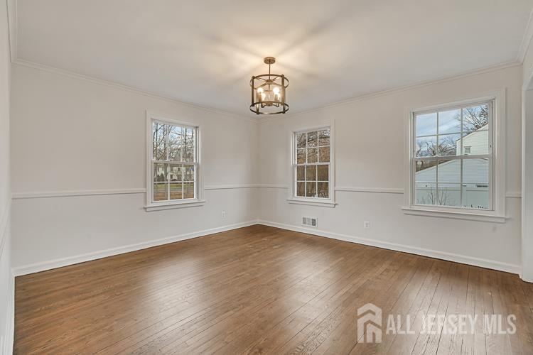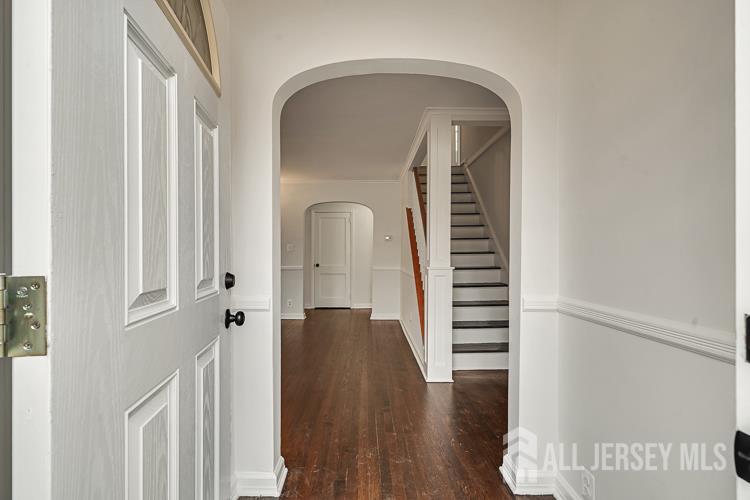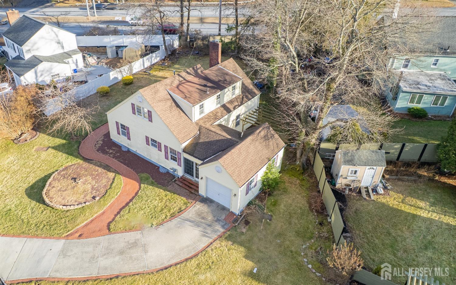 Located in a highly sought-after neighborhood, this well-maintained 1954-built 3-bedroom, 2 full bath home offers timeless architectural character with thoughtful updates and a peaceful lakefront view. A welcoming foyer with an arched entrance leads to the living room, featuring crown molding, chair rail accents, and a classic brick-faced wood-burning fireplace. The formal dining room showcases original details and a built-in cupboard, adding charm and functionality. The remodeled kitchen includes wood cabinetry, granite countertops, a tumbled marble backsplash, tile flooring, and access to a breezeway connecting to a one-car garage and extra-long driveway. A bright Florida room offers additional living space overlooking the expansive backyard. The main level features a first-floor bedroom and full bath, while the second floor includes two additional bedrooms, including a primary with a generous closet. The partially finished basement offers a family room, laundry area, and large storage/workshop space. Outdoor living is enhanced by a wood deck with pergola, overlooking the lake. Conveniently located near shopping, schools, and major highways including Route 130 and Route 1, this home blends classic charm with everyday comfortan exceptional opportunity to make it your own.