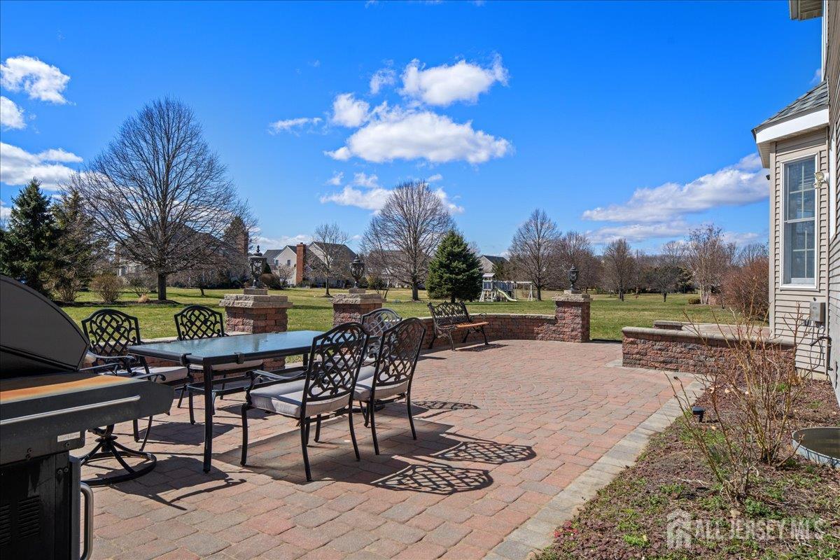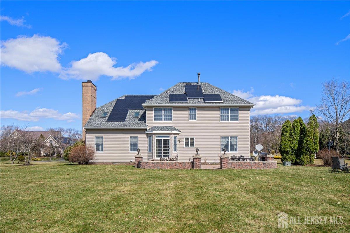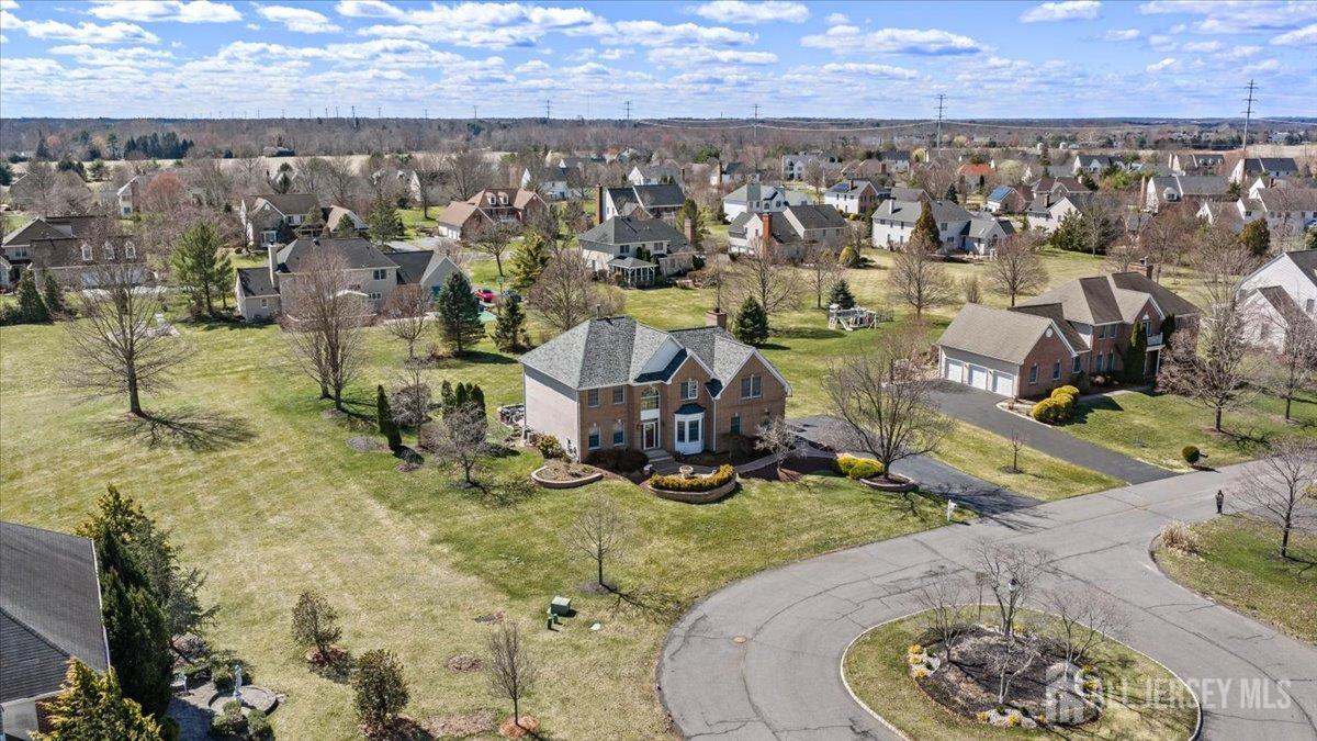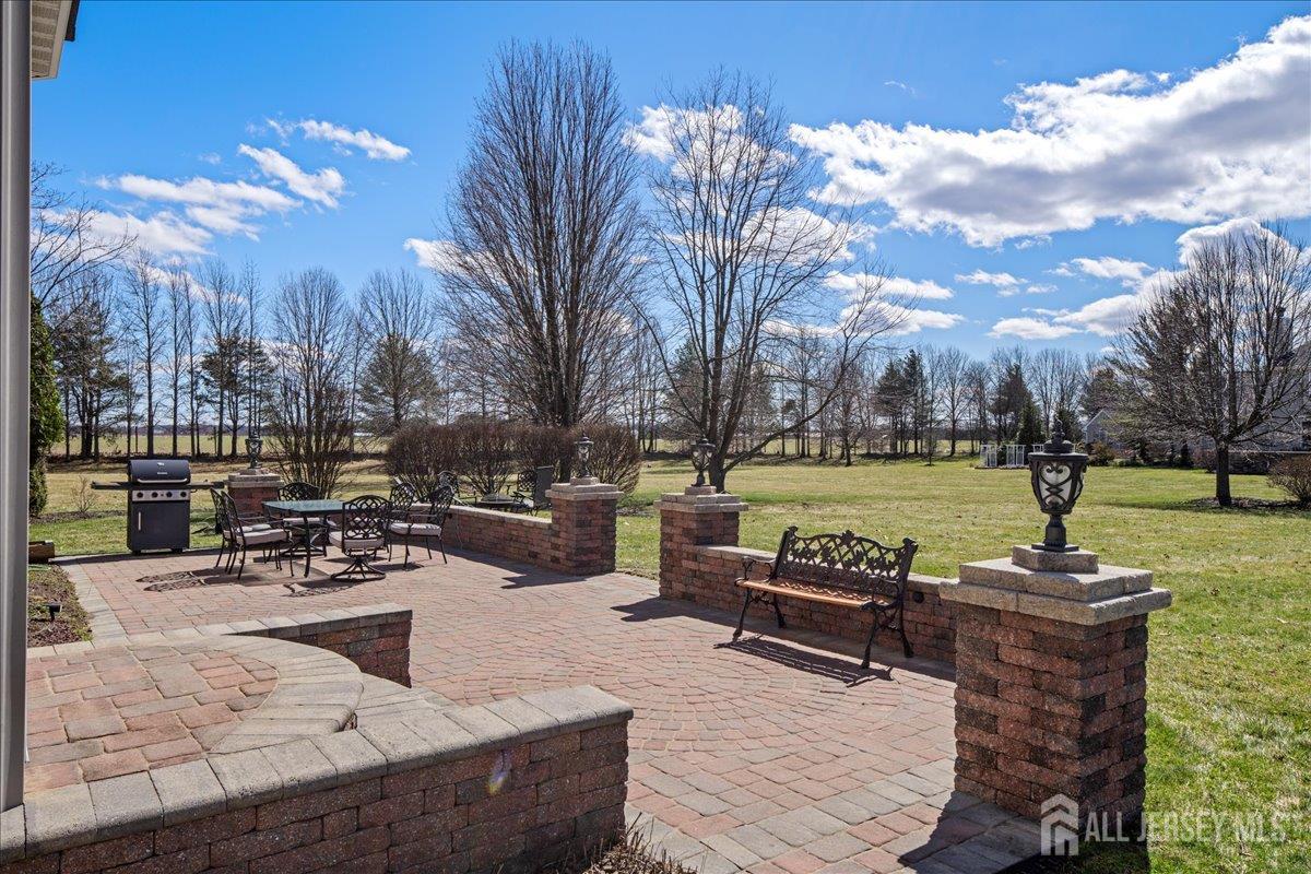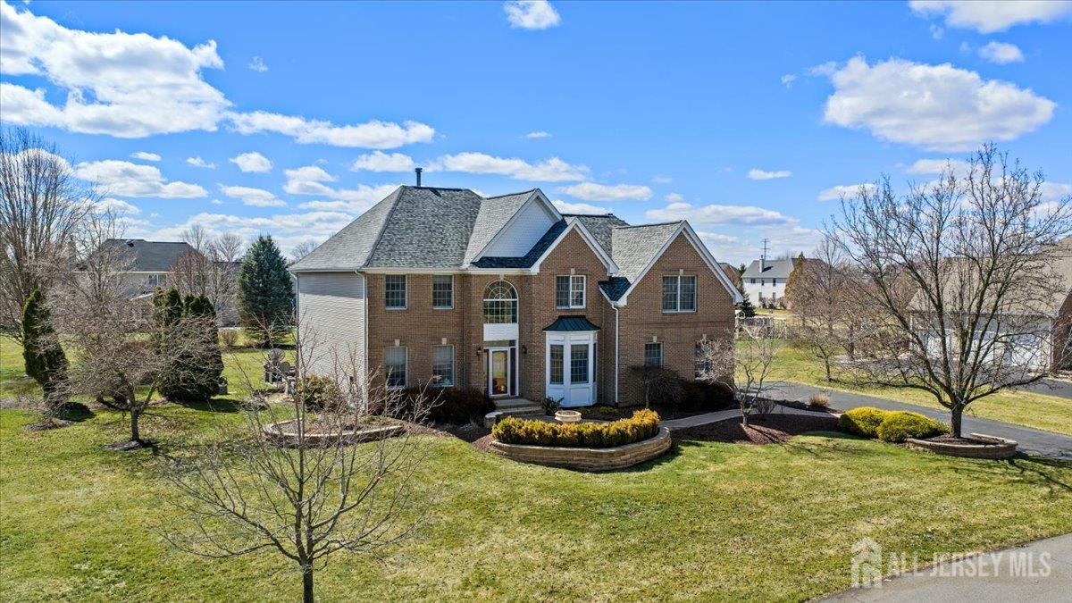 Tucked away at the end of a quiet cul-de-sac in The Crossing at Grover's Mill, 11 Briardale Court is a stunning blend of elegance and modern comfort. This coveted northeast-facing residence sits on a generous one-acre lot in a neighborhood embraced by open land and farmland, yet just minutes from top-rated West Windsor-Plainsboro High School North and Community Middle School. A charming paver walkway leads to the gracious entrance, where a dramatic two-story foyer welcomes you with an air of sophistication, setting the tone for the exceptional craftsmanship found throughout. The formal living room flows seamlessly into the adjoining dining room, creating an ideal stage for stylish entertaining and memorable gatherings. The heart of the home is the open-concept kitchen and family room, designed for effortless everyday living. Blue granite countertops, a contemporary tile backsplash, stainless steel appliances, and recessed lighting define the kitchen, while a center island with a built-in cooktop and a built-in wine rack elevate both form and function. The sunlit breakfast area features sliding glass doors opening to a stunning red brick patio with ambient lighting perfect for al fresco dining. The adjacent family room, graced with rich Brazilian hardwood floors, captivates with soaring vaulted ceilings, skylights, and a cozy gas fireplace, while a convenient back staircase adds to the home's thoughtful design. A first-floor office, powder room, and mud/laundry and storage complete the main level. Upstairs, the primary suite is a true sanctuary. An upgraded tray ceiling crowns the spacious retreat, which features a private sitting area and a spa-inspired en suite bath with a Jacuzzi soaking tub, separate shower, dual vanity, and a privacy door for added seclusion. Three additional spacious bedrooms share a beautifully appointed hall bath with dual sinks. The finished basement is an entertainer's dream offering a large recreation room, a fully equipped home theater, a dedicated exercise area with an adjacent full bath and steam shower, a functional wet bar, and a cedar closet. A TV console adds the finishing touch to this spectacular lower level. Additional highlights include a side-entrance two-car garage, a driveway with ample parking, Tesla solar panels for energy efficiency, and recessed lighting throughout. Only a few minutes drive from Princeton Junction commuter train. The brick-facing exterior lends timeless curb appeal, while the expansive one-acre lot provides the privacy and space today's buyers desire. Experience luxury, comfort, and tranquility in one of Plainsboro's most sought-after communities 11 Briardale Court is ready to welcome you home.