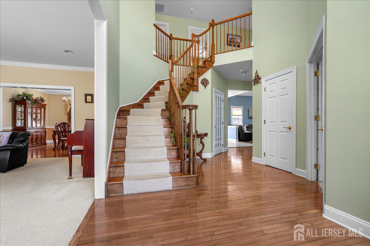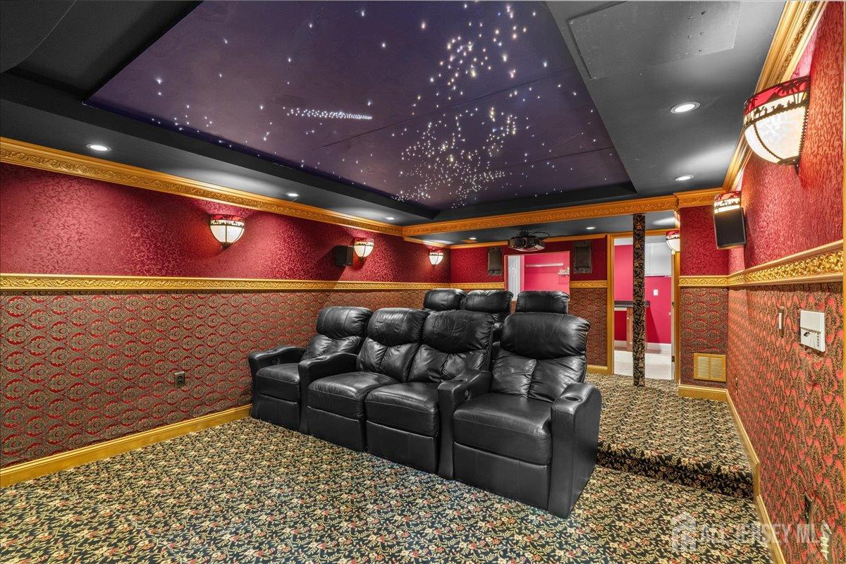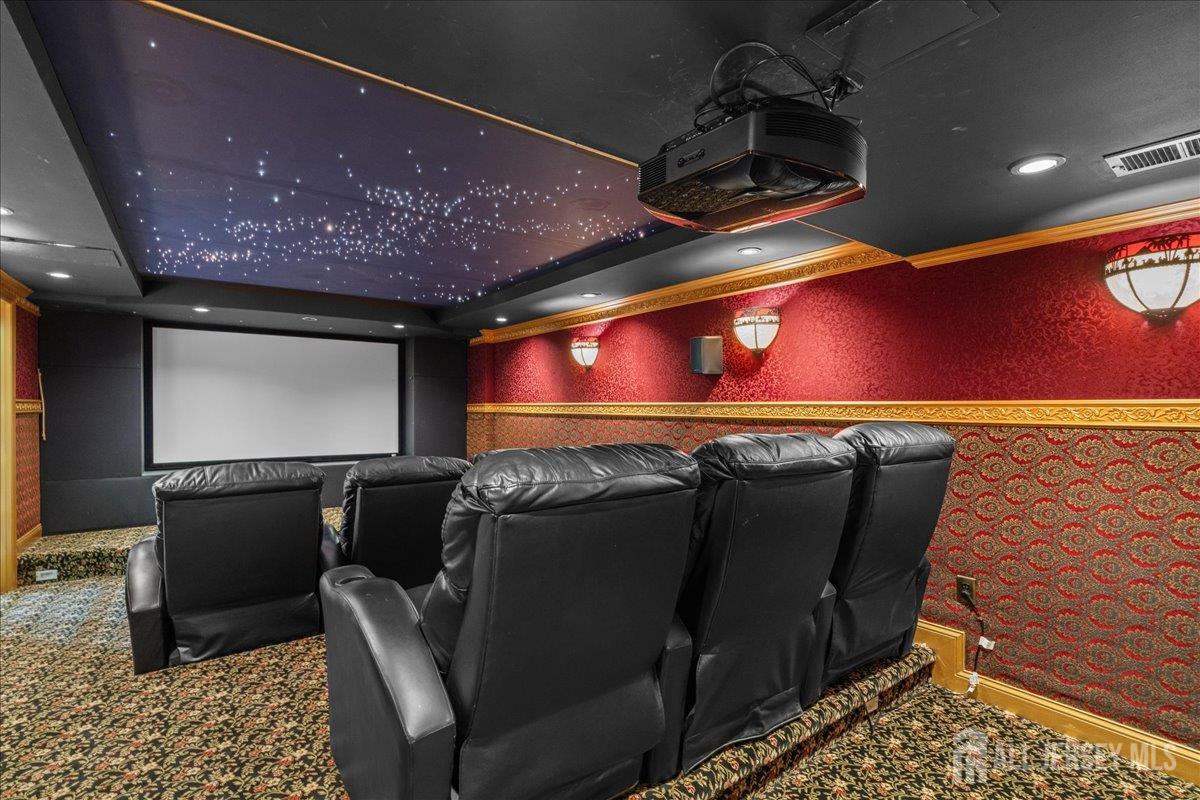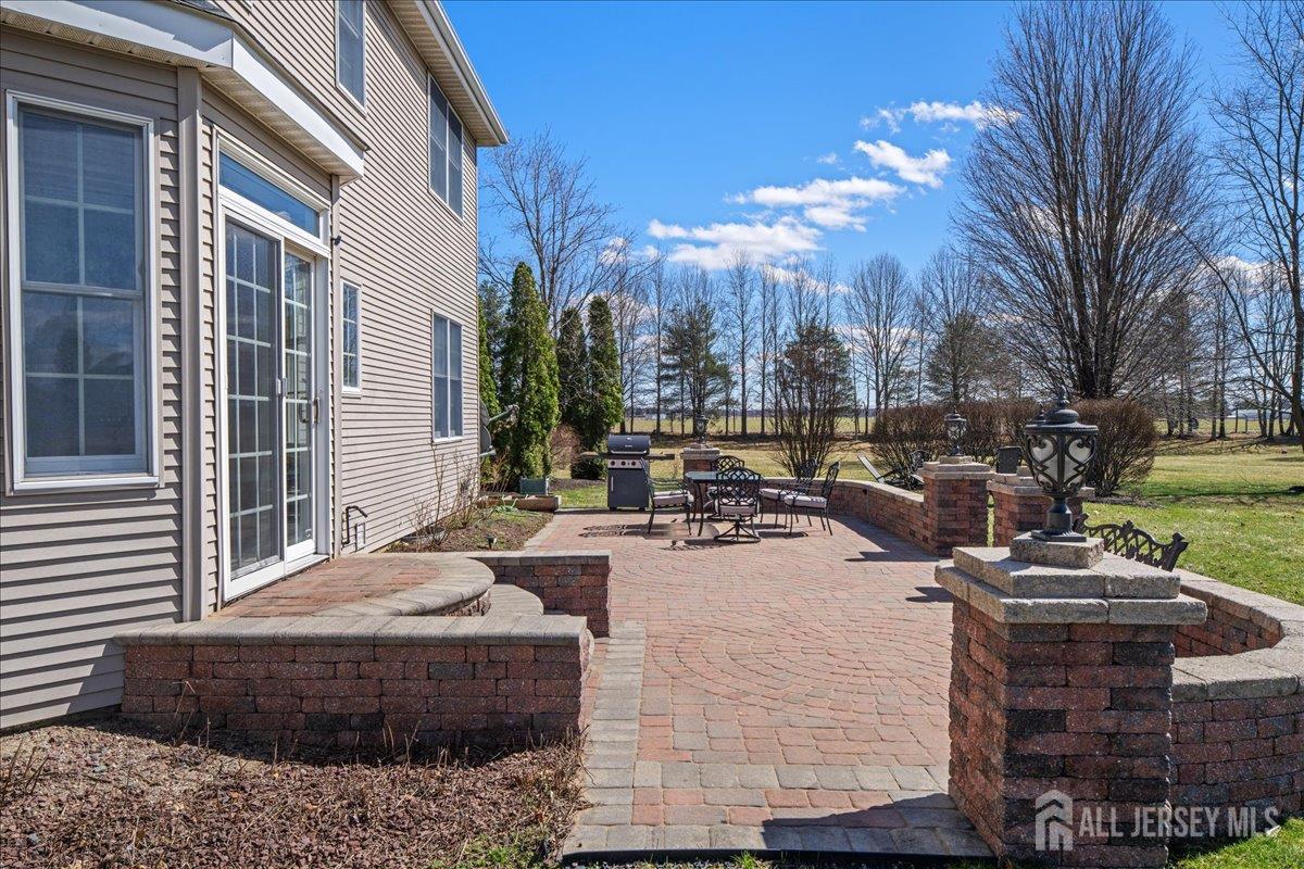 Tucked away at the end of a quiet cul-de-sac in The Crossing at Grover's Mill, 11 Briardale Court is a stunning blend of elegance and modern comfort. This coveted northeast-facing residence sits on a generous one-acre lot in a neighborhood embraced by open land and farmland, yet just minutes from top-rated West Windsor-Plainsboro High School North and Community Middle School. A charming paver walkway leads to the gracious entrance, where a dramatic two-story foyer welcomes you with an air of sophistication, setting the tone for the exceptional craftsmanship found throughout. The formal living room flows seamlessly into the adjoining dining room, creating an ideal stage for stylish entertaining and memorable gatherings. The heart of the home is the open-concept kitchen and family room, designed for effortless everyday living. Blue granite countertops, a contemporary tile backsplash, stainless steel appliances, and recessed lighting define the kitchen, while a center island with a built-in cooktop and a built-in wine rack elevate both form and function. The sunlit breakfast area features sliding glass doors opening to a stunning red brick patio with ambient lighting perfect for al fresco dining. The adjacent family room, graced with rich Brazilian hardwood floors, captivates with soaring vaulted ceilings, skylights, and a cozy gas fireplace, while a convenient back staircase adds to the home's thoughtful design. A first-floor office, powder room, and mud/laundry and storage complete the main level. Upstairs, the primary suite is a true sanctuary. An upgraded tray ceiling crowns the spacious retreat, which features a private sitting area and a spa-inspired en suite bath with a Jacuzzi soaking tub, separate shower, dual vanity, and a privacy door for added seclusion. Three additional spacious bedrooms share a beautifully appointed hall bath with dual sinks. The finished basement is an entertainer's dream offering a large recreation room, a fully equipped home theater, a dedicated exercise area with an adjacent full bath and steam shower, a functional wet bar, and a cedar closet. A TV console adds the finishing touch to this spectacular lower level. Additional highlights include a side-entrance two-car garage, a driveway with ample parking, Tesla solar panels for energy efficiency, and recessed lighting throughout. Only a few minutes drive from Princeton Junction commuter train. The brick-facing exterior lends timeless curb appeal, while the expansive one-acre lot provides the privacy and space today's buyers desire. Experience luxury, comfort, and tranquility in one of Plainsboro's most sought-after communities 11 Briardale Court is ready to welcome you home.