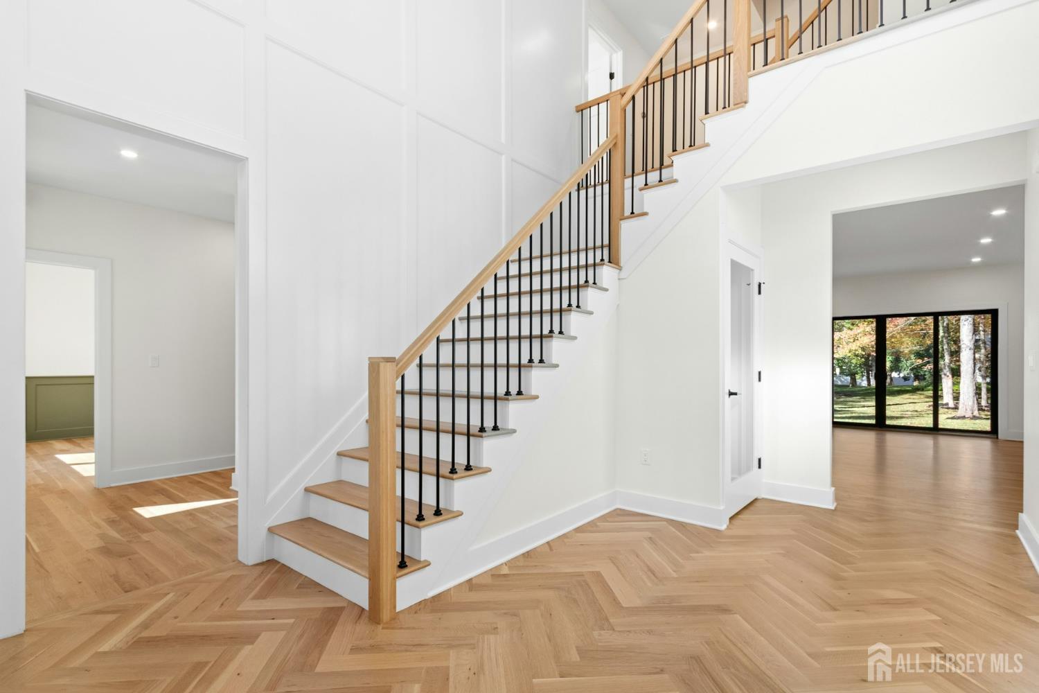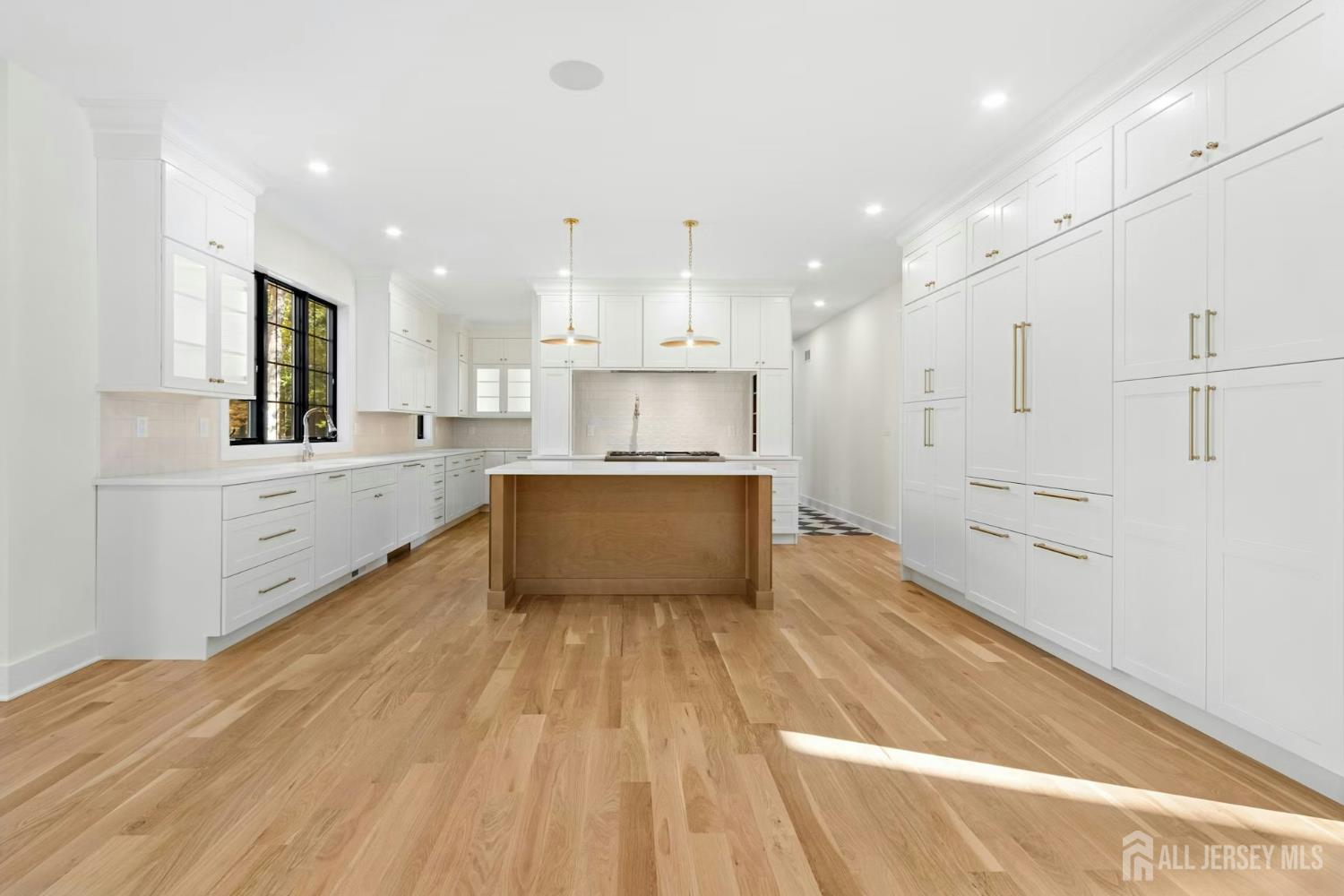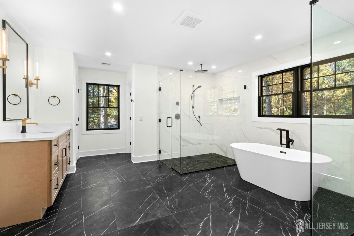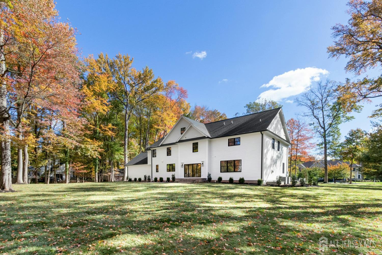 Welcome to a residence that redefines custom living. This brand-new 7,500+ square foot estate set on a level .95 acre lot is not just a house...it's a statement of vision, timeless design, and craftsmanship. Perfectly situated in one of Scotch Plains' most desirable neighborhoods, this home seamlessly blends modern sophistication with classic architectural elegance. Step inside through the grand double doors into a soaring two-story foyer filled with natural light and extraordinary attention to detail. The main level features an open-concept layout centered around a state-of-the-art chef's kitchen with Thermador appliances, quartz countertops and custom cabinetry. An adjoining prep kitchen is ideal for entertaining, storage, and simply keeping the main kitchen pristine. The en suite bedroom on this main level provides flexibility for guests, an au pair, or multigenerational living. Upstairs, the luxurious primary suite includes a spa-like bath with heated floors, and two individual walk-in showers...a rare indulgence. Two bedrooms are connected by a Jack & Jill bath while the remaining bedroom enjoys a private bath. The finished attic with full bath provides options for a second office, gym, or teen retreat. You will find a sprawling entertainment area in the basement anchored by a custom bar, a full bath, and a bedroom with an oversized egress window. Enjoy an ideal canvas for refined outdoor living and prepare to design the ultimate outdoor entertaining space. With the paver patio, full irrigation system, and fresh sod, the foundation for your dream outdoor oasis awaits. The interior details are both refined and enduring: 4 white oak flooring, white oak wood beam ceilings, extensive custom millwork, Andersen 400 Series black windows, hand-selected designer lighting, Sonos sound system, Nest thermostats, Kohler fixtures, and unique exquisite tile selections.This home provides for a wonderfully elevated lifestyle - a truly extraordinary opportunity in Scotch Plains.