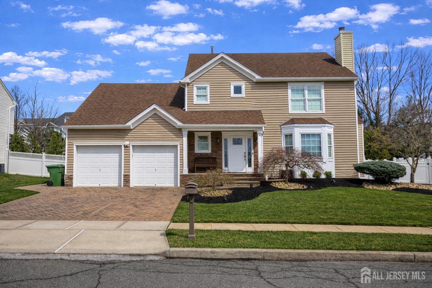 Beautiful 4 bedroom, 3.5 bath side hall colonial built in 1994 featuring attractive stone front accents with a paver driveway and a paver walkway on a beautiful cul-de-sac. The first level offers a spacious living room with a wood burning fireplace, a large formal dining room and an oversized eat in kitchen with white cabinetry, a center island and stainless steel appliances included. Double french doors lead to a large 22x12 trex deck overlooking a paver walkway that wraps around to a patio and basketball court with net that will remain with the home. The fully fenced in yard with white vinyl fencing also includes a storage shed. Just off the kitchen is a bright family room with laminate wood floors, vaulted ceilings, 2 skylights and built in wall to wall shelving for storage and TV access. The second level features an open hallway that overlooks the impressive two story family room below, creating an airy and spacious feel while allowing natural light to flow throughout the home, also boasts 4 generously sized bedrooms, including a primary suite with an updated stall shower, dressing area, and walk in closet. A full main bathroom with tub/shower has newer vanity that services the additional bedrooms. A separate laundry room is perfect for easy access to the main living space, The fully finished basement offers excellent additional living space with a full bath, kitchenette area, recreation/exercise room, storage room, and access to the backyard. This well maintained offers space, comfort and great indoor-outdoor living. Additional features include roof replaced in 2016, front and back sprinklers, hardwood floors on staircase/Lr/Dr and hallway in 2nd level/ring doorbell with Wifi/some rooms freshly painted. a 2 car garage with openers. This is a must see Gem!!
