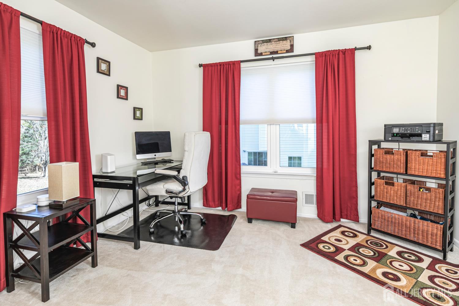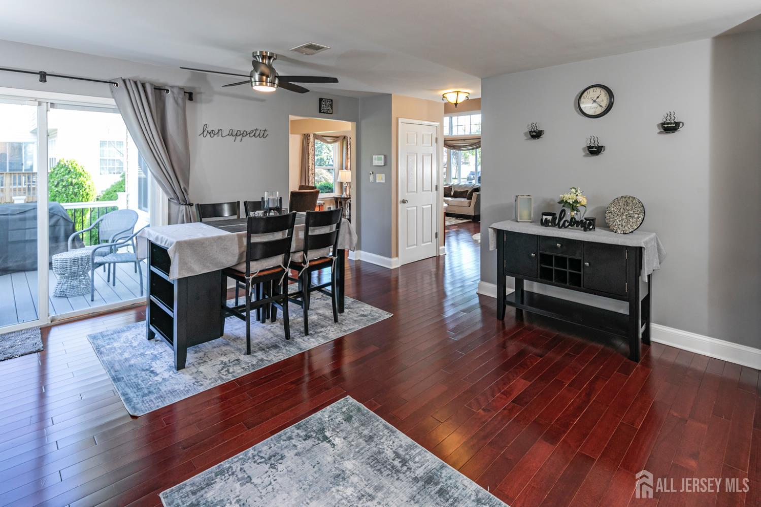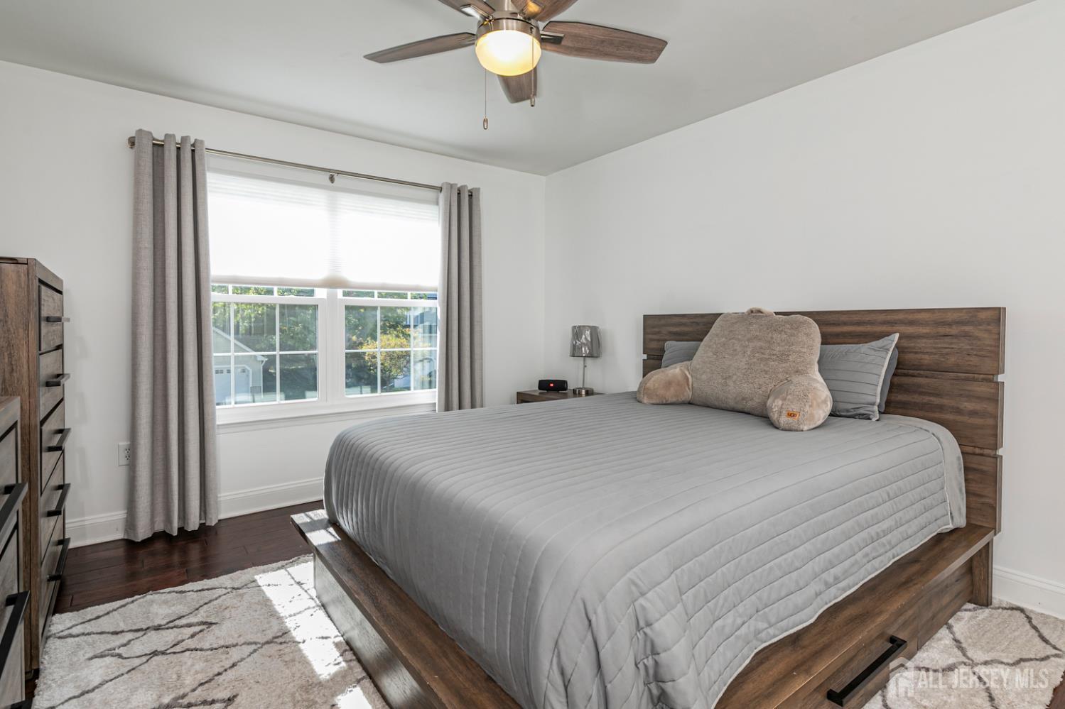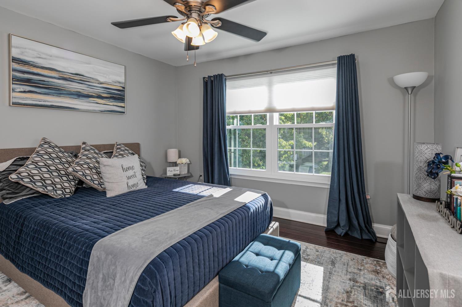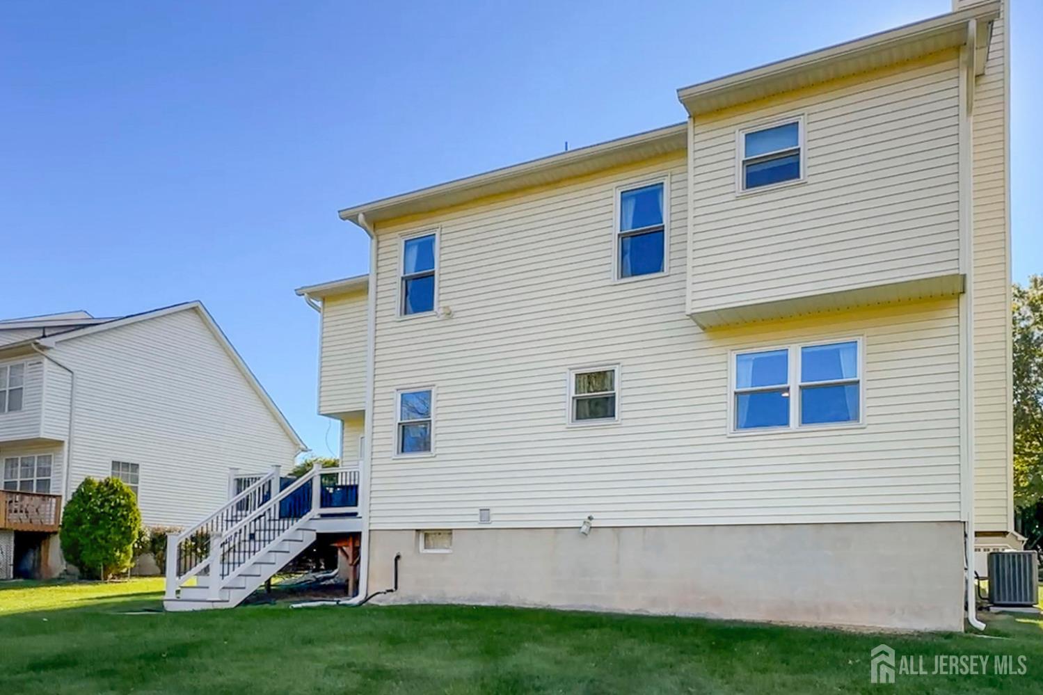 Nestled on a cul de sac this Beekman Manor home is perfect. The Flexible floor plan is comfortable thanks to a warm modern palette and hardwood floors. Replaced windows let in loads of light, especially in the two-story foyer and open entertaining rooms. The roomy, eat-in kitchen equipped with stainless steel appliances flows out to a new, no-maintainance deck, overlooking the park like yard, perfect for sipping morning coffee in the fresh air. A fireplace and recessed lighting let you customize the mood in the adjoining family room. You'll find the powder room and laundry conveniently tucked away near the garage. Head downstairs to the finished basement which offers plenty of storage and is perfect for play time or a workout that can be squeezed into a hectic schedule. Upstairs, double doors introduce the primary suite, offering a large closet, with a newly renovated bathroom and modern vessel sinks, backed by hexagonal tile, a big soaking tub, and a separate shower behind frosted glass. A neutrally tiled hall bath serves three more bedrooms. With a prime lot, ample indoor space and smart improvements, this home is the perfect spot for your next chapter. A short distance to the Greenbrook elementary school in a Blue Ribbon school district. Close to Rt 1, 27, Turnpike, Parkway and all major roads, great restaurants and shopping. Improvements to the home are: Newer W/D, microwave, refrigerator, Newly renovated primary bath, main bath re-grouted, replaced windows, custom shades through out,newer front door, deck, epoxy garage floor, newer HVAC,new hot water heater, newer roof, extra insulation between garage and second bath for increased efficiency. App controlled - Ring ready,security system, front door key pad,motion lights-driveway and patio door. Primary bedroom virtually staged.