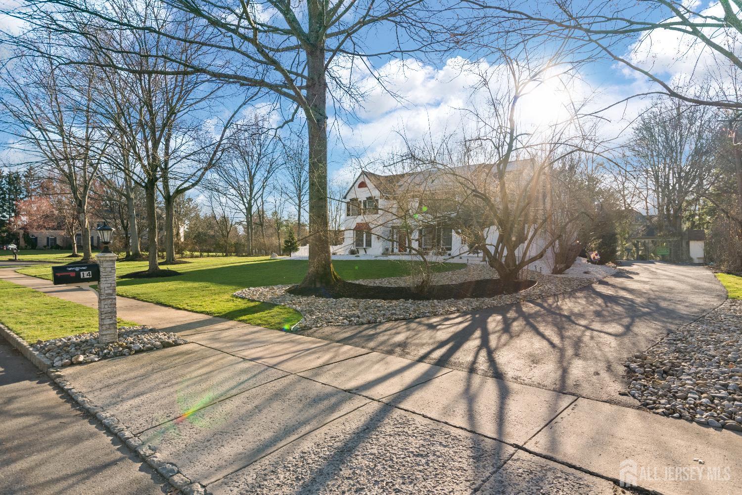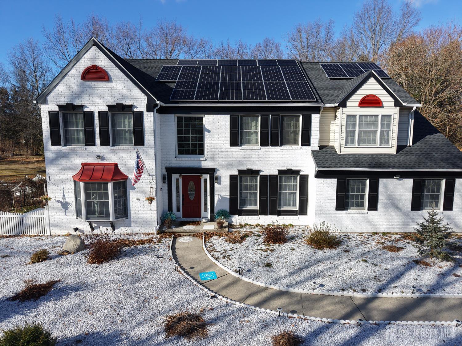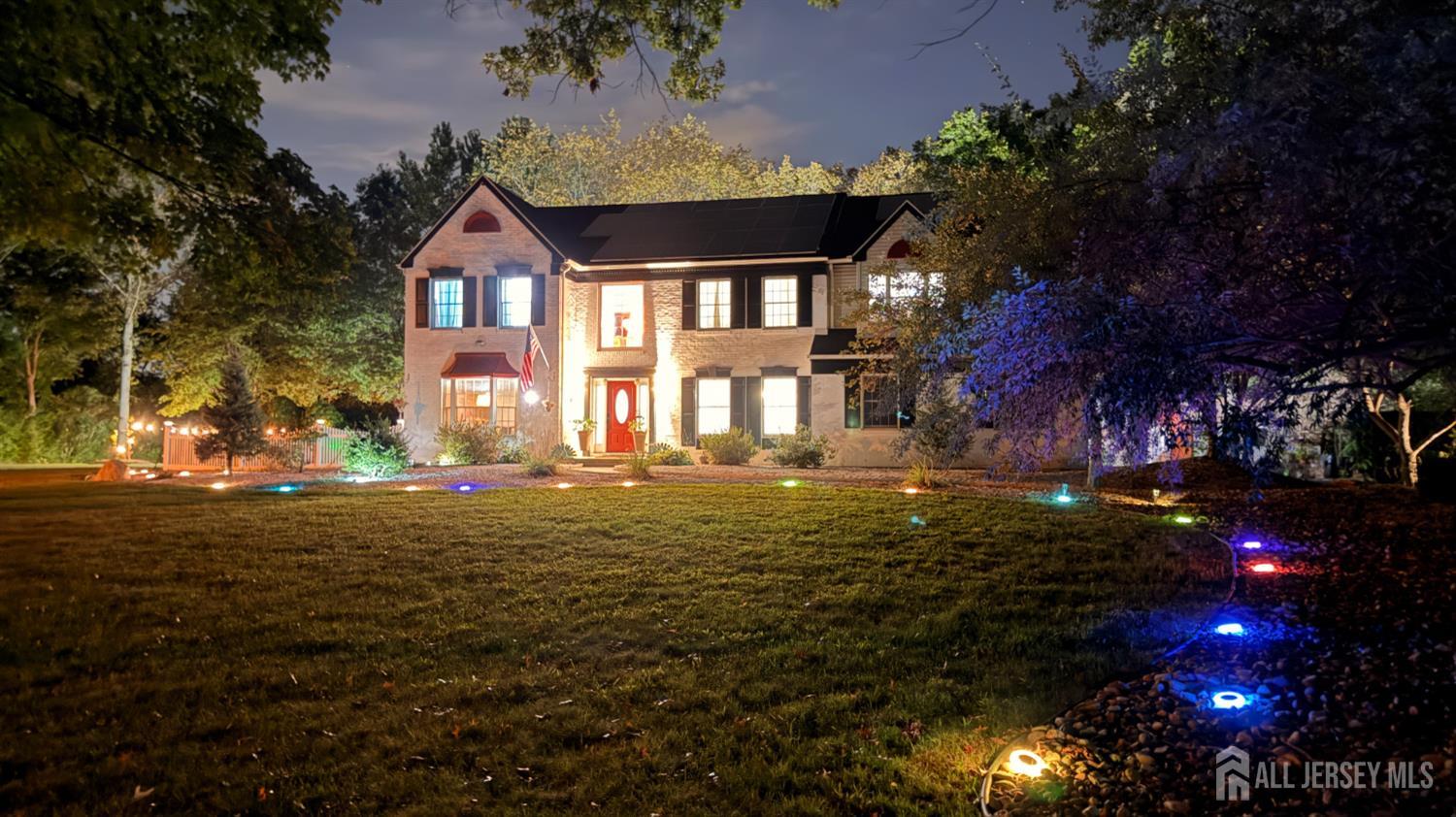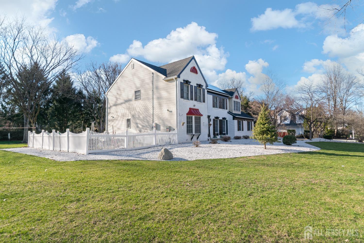 Sophistication and ambiance come together masterfully in this home creating an unparalleled combination of visual excellence. This Beautiful 5-bedroom, 3.5-bath brick-front Colonial is nestled on a private cul-de-sac of just 16 custom homes in the highly desirable West Windsor-Plainsboro School District. The gourmet kitchen features upgraded cabinetry, granite countertops, a tiled backsplash, stainless steel appliances, wine fridge, and ceramic tile flooring. The adjacent breakfast area includes custom built-in seating, recessed lighting, and beautiful views of the private, tree-lined backyard. A dramatic two-story foyer with hardwood floors welcomes you and opens to a formal living room with a bay window and a dining room with chair rail and crown molding. The expansive family room features vaulted ceilings, two skylights, hardwood floors, and a brick fireplace, creating a bright and inviting space perfect for relaxing or entertaining. The first-floor office with recessed lighting and French doors leading to the family room is ideal for a work-from-home setup. Nearby, the laundry room leads to a private first-floor bedroom with a full bathroom and separate entrance, perfect for guests, extended family. Upstairs, you will find four generously sized bedrooms with hardwood flooring and ceiling fans. The hallway bathroom was tastefully updated in 2021 with a double quartz vanity and shower/tub combination. The expansive primary suite offers hardwood flooring, a sitting area, and a large big closet with custom built-in shelving. The updated primary bath features quartz counters, a shower, and a Jacuzzi tub overlooking the serene backyard. The fully finished basement provides an exercise area, recreation space, ample storage, and convenient outdoor access through concrete stairs and Bilco doors. Step outside to enjoy the newly built large patio, perfect for outdoor entertaining, relaxing, and enjoying the peaceful backyard setting. Additional highlights include a new solar panel system for energy efficiency, central vacuum, new gutters (2022), A/C (2020), furnace (2020), and water heater (2019).