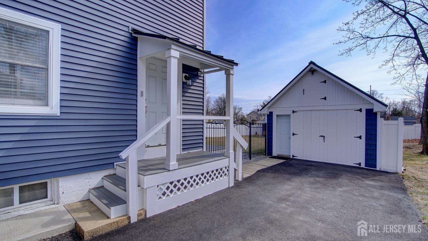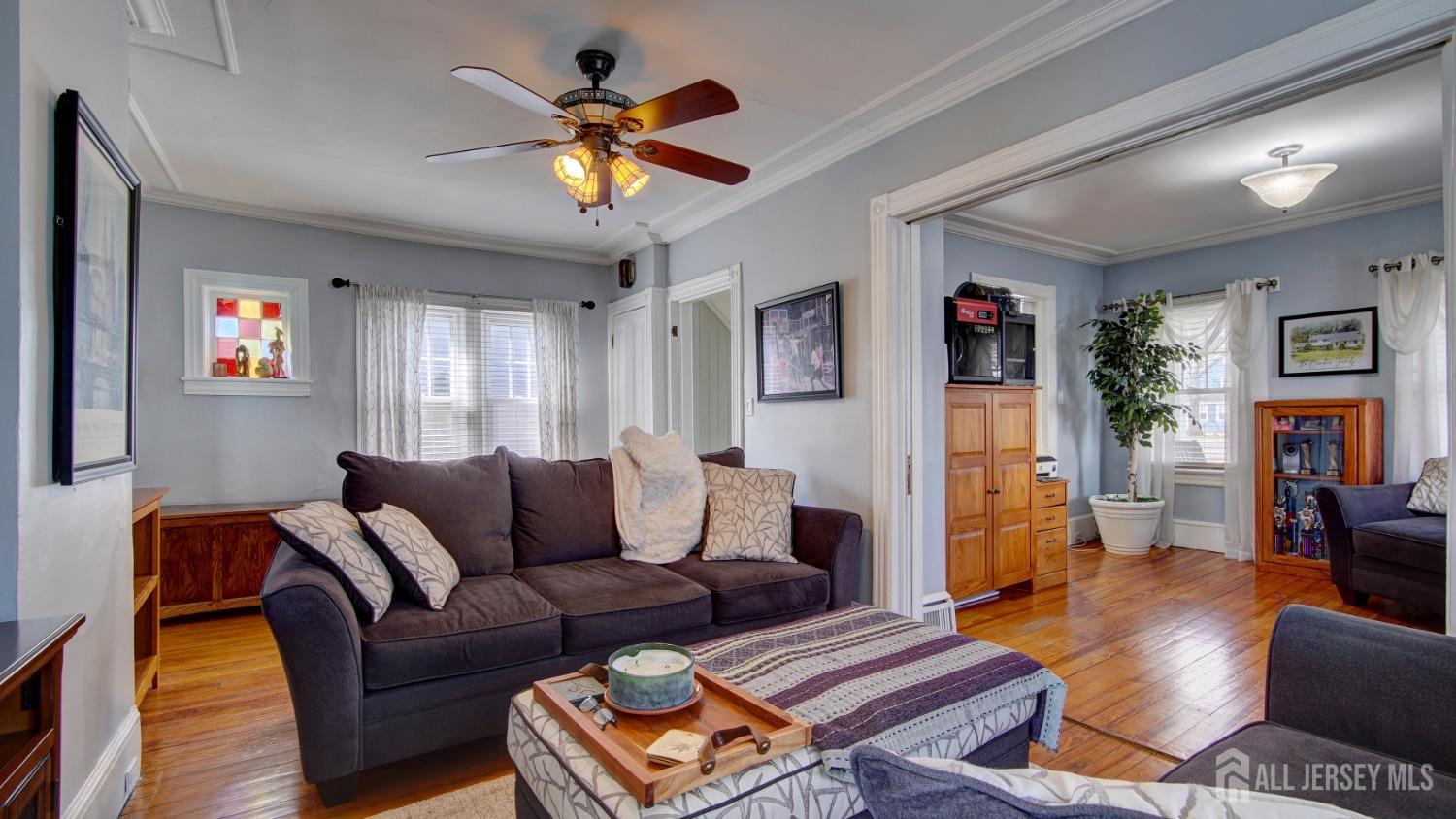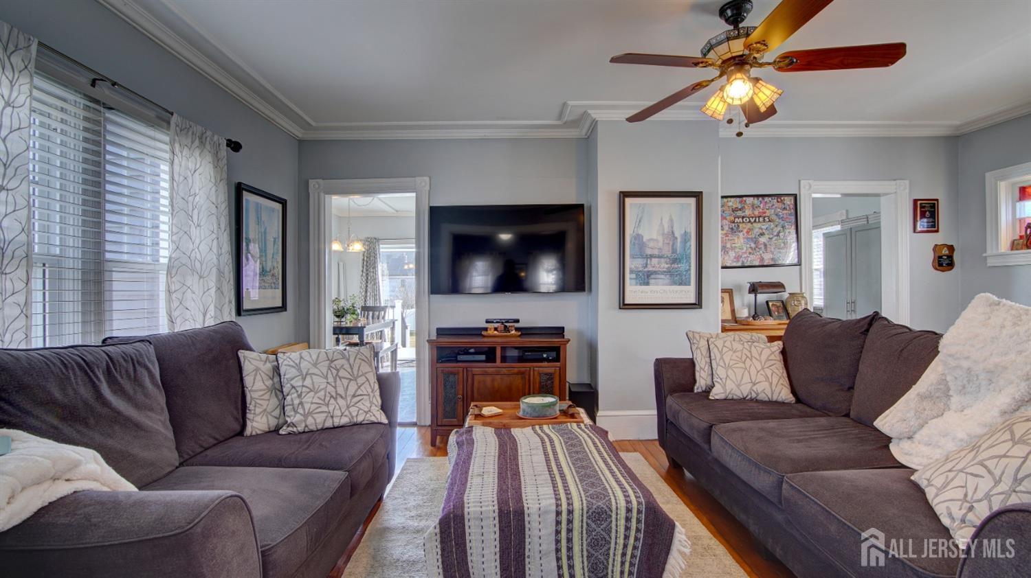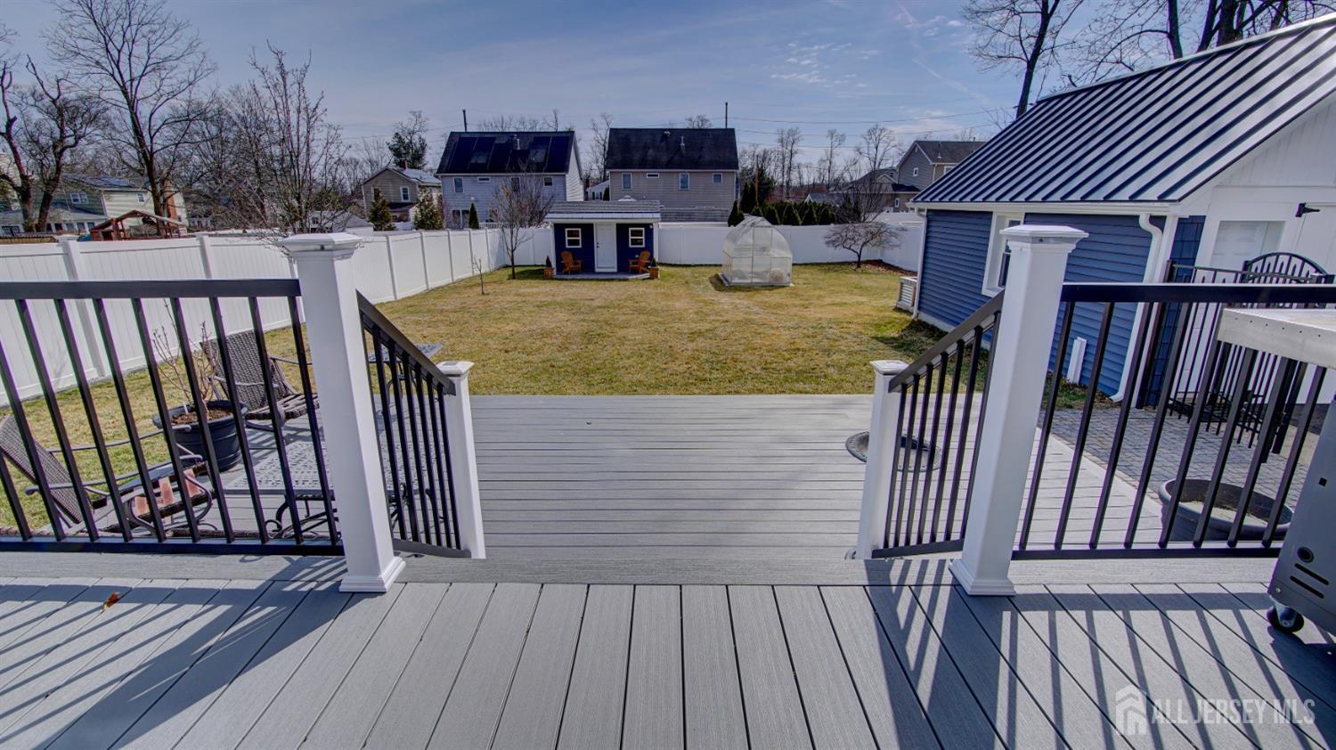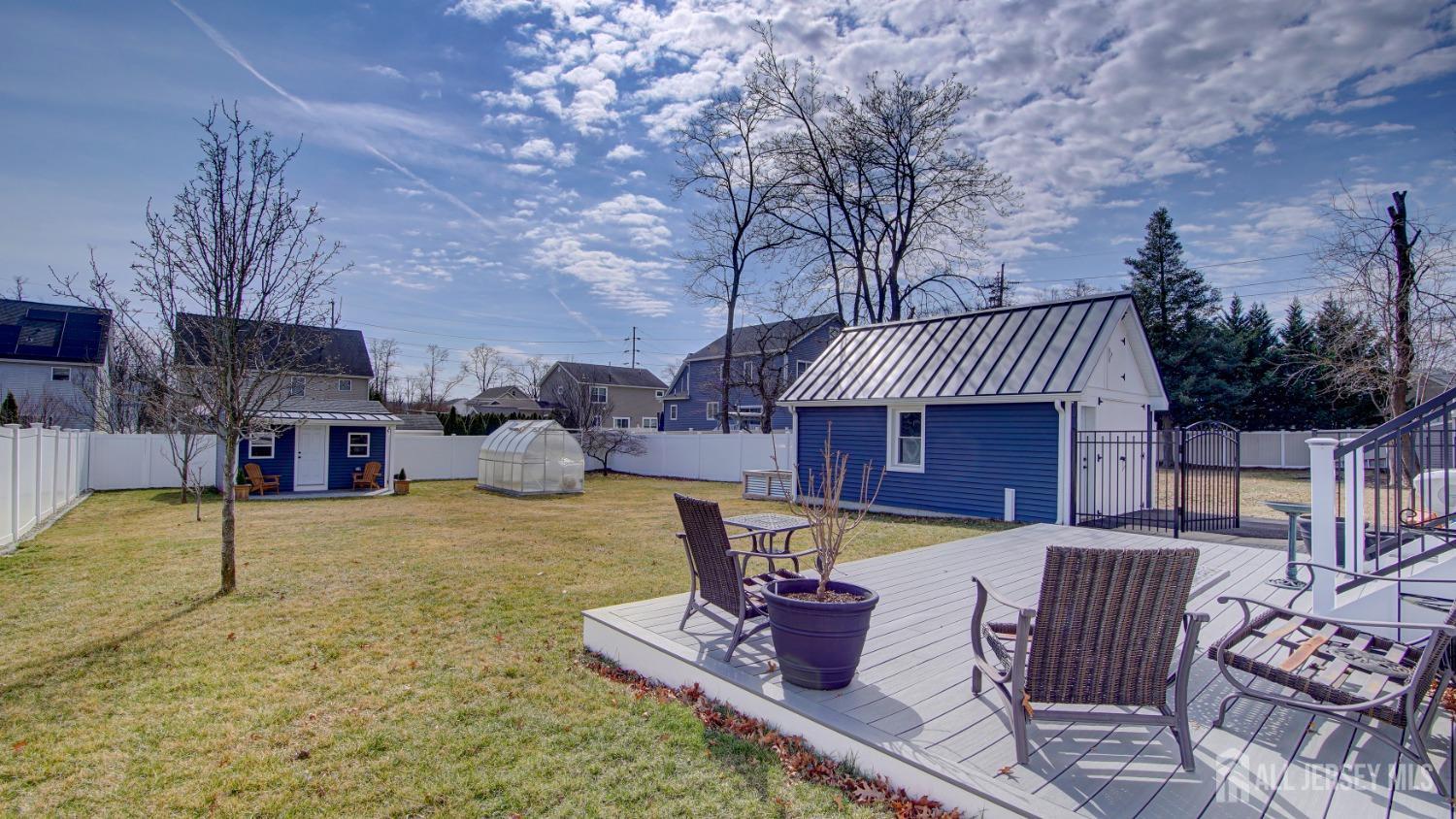 Welcome to this beautifully designed 3 bedrm 2.5 bath Colonial featuring a mix of modern updates & classic charm. Upon entering, step into the foyer w/elegant hardwood floors, leading into the formal living room, w/HW floors. This space is illuminated by side windows, overhead lighting, & finished w/crown molding, creating a sophisticated atmosphere. The spacious family room boasts HW floors, crown molding & decorative molding around the doorways. With light pouring in from windows on either side, this room is perfect for both relaxation & entertaining. The kitchen has been thoughtfully renovated & offers stunning quartz countertops, wood cabinets & a stylish tile backsplash. The newer SS appliances include a double oven, overhead fan & DW. The kitchen also features an undermount sink, casement windows over the sink, & see-through cabinets for additional appeal. A brand new refrigerator, ceiling fan, & a sliding glass door leading to the backyard completes this kitchen. The dining area also has decorative molding & an abundance of natural light, w/windows on either side. Adjacent to the kitchen, the laundry room offers its own dedicated space w/tile floors, overhead lighting, & window. It also features a pantry/storage closet. A door from the laundry room leads to a covered deck that leads down to the driveway. Upstairs, you'll find a continuation of the HW floors in the foyer. Bedrm 2 is outfitted w/laminate flooring & 3 windows, offering ample natural light. This room also features a WIC, crown molding, & overhead lighting. Bedrm 3 is similarly equipped w/ laminate flooring, overhead lighting, a closet, & a built-in desk area. The full bath has tile floors, recessed lighting & tub-shower combo. The primary suite,(a 400 sq ft addition), is an impressive retreat w/vaulted ceilings, recessed lighting & speaker system for surround sound. 2 windows bring in natural light, & the suite also features double closets w/ built-in organizers. The primary bath has a maple vanity, tile floors, & a step-in shower w/clear glass doors. A spacious linen closet adds to the bathroom's functionality. The unfinished basement offers plenty of storage w/ an area for the furnace & HWH (5 yrs). Outside, you'll find a beautifully landscaped fenced yard w/ a 2-tier deck, paver pathways near the garage, & a vinyl fence. The garage, which has barn doors & electric, offers ample space & includes a side entry door. Both the garage roof & siding are new. Additional outdoor features include a new shed w/ electric & dusk-to-dawn lighting, as well as a greenhouse w/electric. The home also features a lovely covered sitting porch w/ recessed lighting, concrete walkways to the driveway & sidewalk, and an asphalt driveway w/ room for up to 4 cars. The property includes an underground sprinkler system for easy lawn maintenance.Located near shopping, restaurants,major roadways,and NJ bus stops. Pier Village a short distant away.