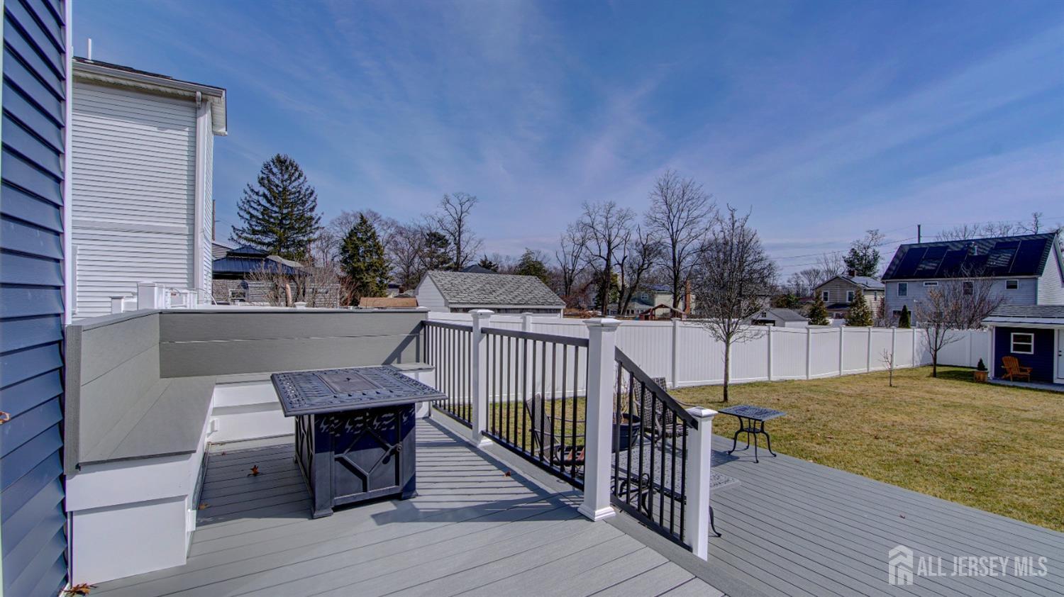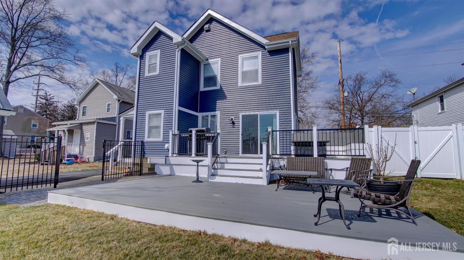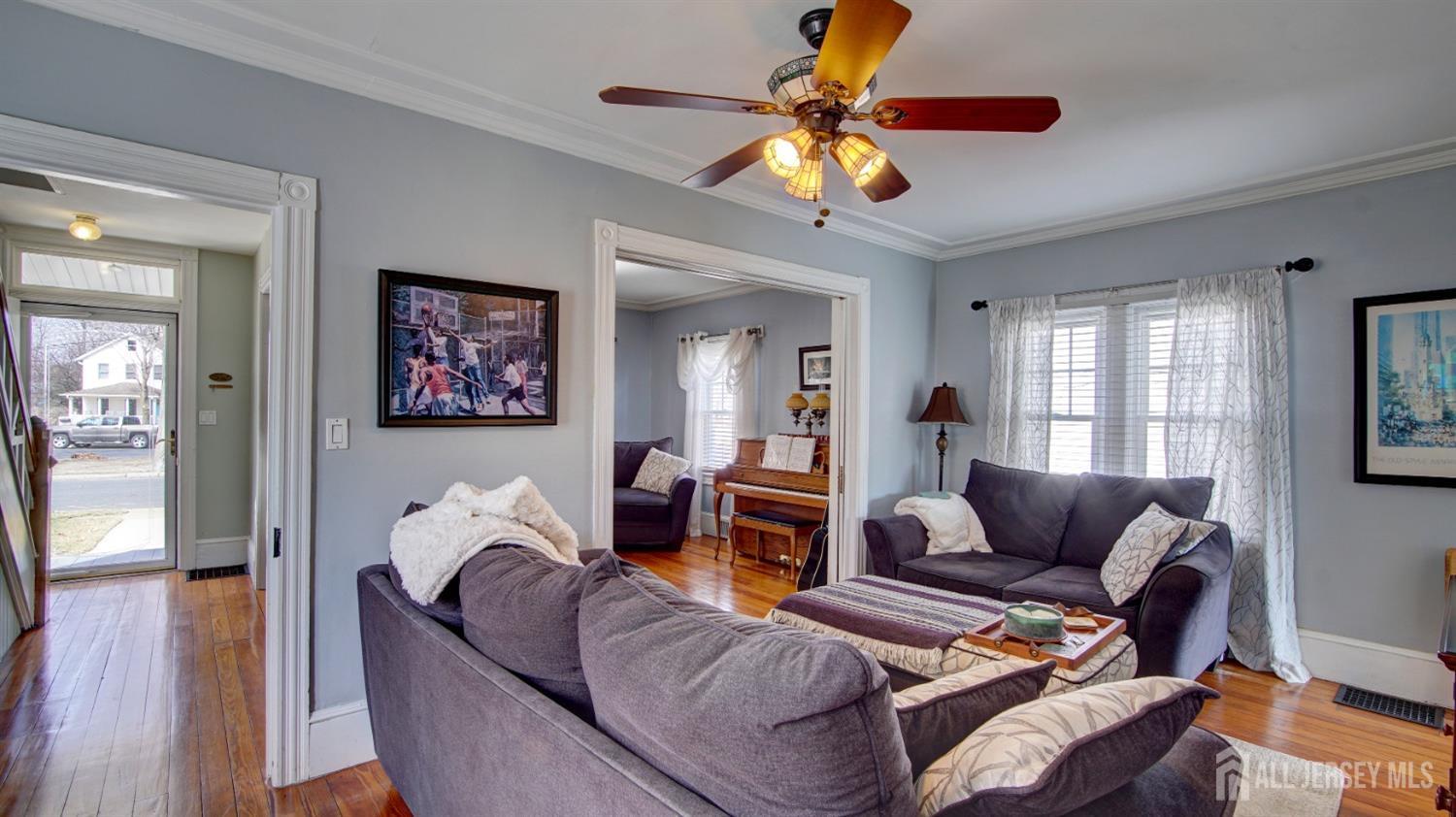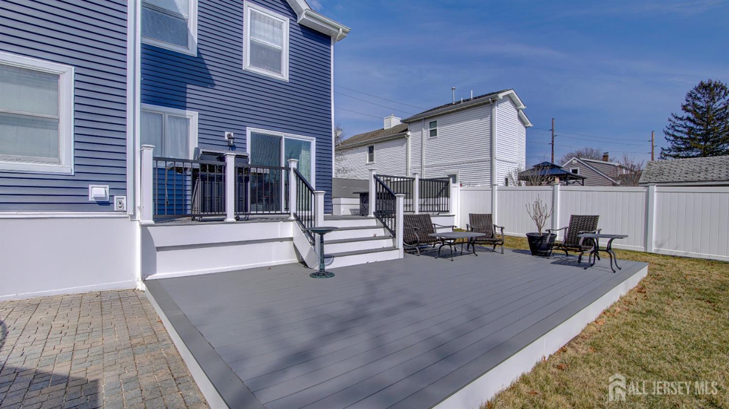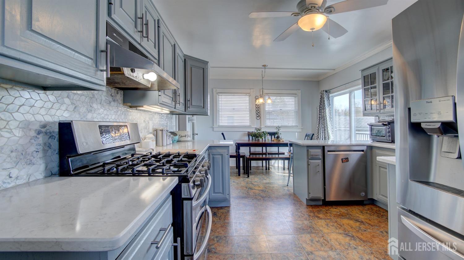 Welcome to this beautifully designed 3 bedrm 2.5 bath Colonial featuring a mix of modern updates & classic charm. Upon entering, step into the foyer w/elegant hardwood floors, leading into the formal living room, w/HW floors. This space is illuminated by side windows, overhead lighting, & finished w/crown molding, creating a sophisticated atmosphere. The spacious family room boasts HW floors, crown molding & decorative molding around the doorways. With light pouring in from windows on either side, this room is perfect for both relaxation & entertaining. The kitchen has been thoughtfully renovated & offers stunning quartz countertops, wood cabinets & a stylish tile backsplash. The newer SS appliances include a double oven, overhead fan & DW. The kitchen also features an undermount sink, casement windows over the sink, & see-through cabinets for additional appeal. A brand new refrigerator, ceiling fan, & a sliding glass door leading to the backyard completes this kitchen. The dining area also has decorative molding & an abundance of natural light, w/windows on either side. Adjacent to the kitchen, the laundry room offers its own dedicated space w/tile floors, overhead lighting, & window. It also features a pantry/storage closet. A door from the laundry room leads to a covered deck that leads down to the driveway. Upstairs, you'll find a continuation of the HW floors in the foyer. Bedrm 2 is outfitted w/laminate flooring & 3 windows, offering ample natural light. This room also features a WIC, crown molding, & overhead lighting. Bedrm 3 is similarly equipped w/ laminate flooring, overhead lighting, a closet, & a built-in desk area. The full bath has tile floors, recessed lighting & tub-shower combo. The primary suite,(a 400 sq ft addition), is an impressive retreat w/vaulted ceilings, recessed lighting & speaker system for surround sound. 2 windows bring in natural light, & the suite also features double closets w/ built-in organizers. The primary bath has a maple vanity, tile floors, & a step-in shower w/clear glass doors. A spacious linen closet adds to the bathroom's functionality. The unfinished basement offers plenty of storage w/ an area for the furnace & HWH (5 yrs). Outside, you'll find a beautifully landscaped fenced yard w/ a 2-tier deck, paver pathways near the garage, & a vinyl fence. The garage, which has barn doors & electric, offers ample space & includes a side entry door. Both the garage roof & siding are new. Additional outdoor features include a new shed w/ electric & dusk-to-dawn lighting, as well as a greenhouse w/electric. The home also features a lovely covered sitting porch w/ recessed lighting, concrete walkways to the driveway & sidewalk, and an asphalt driveway w/ room for up to 4 cars. The property includes an underground sprinkler system for easy lawn maintenance.Located near shopping, restaurants,major roadways,and NJ bus stops. Pier Village a short distant away.