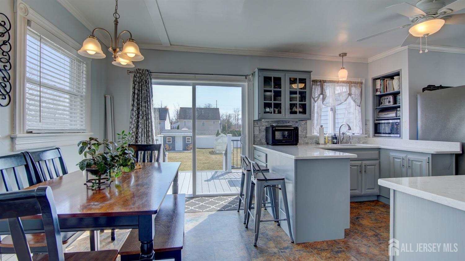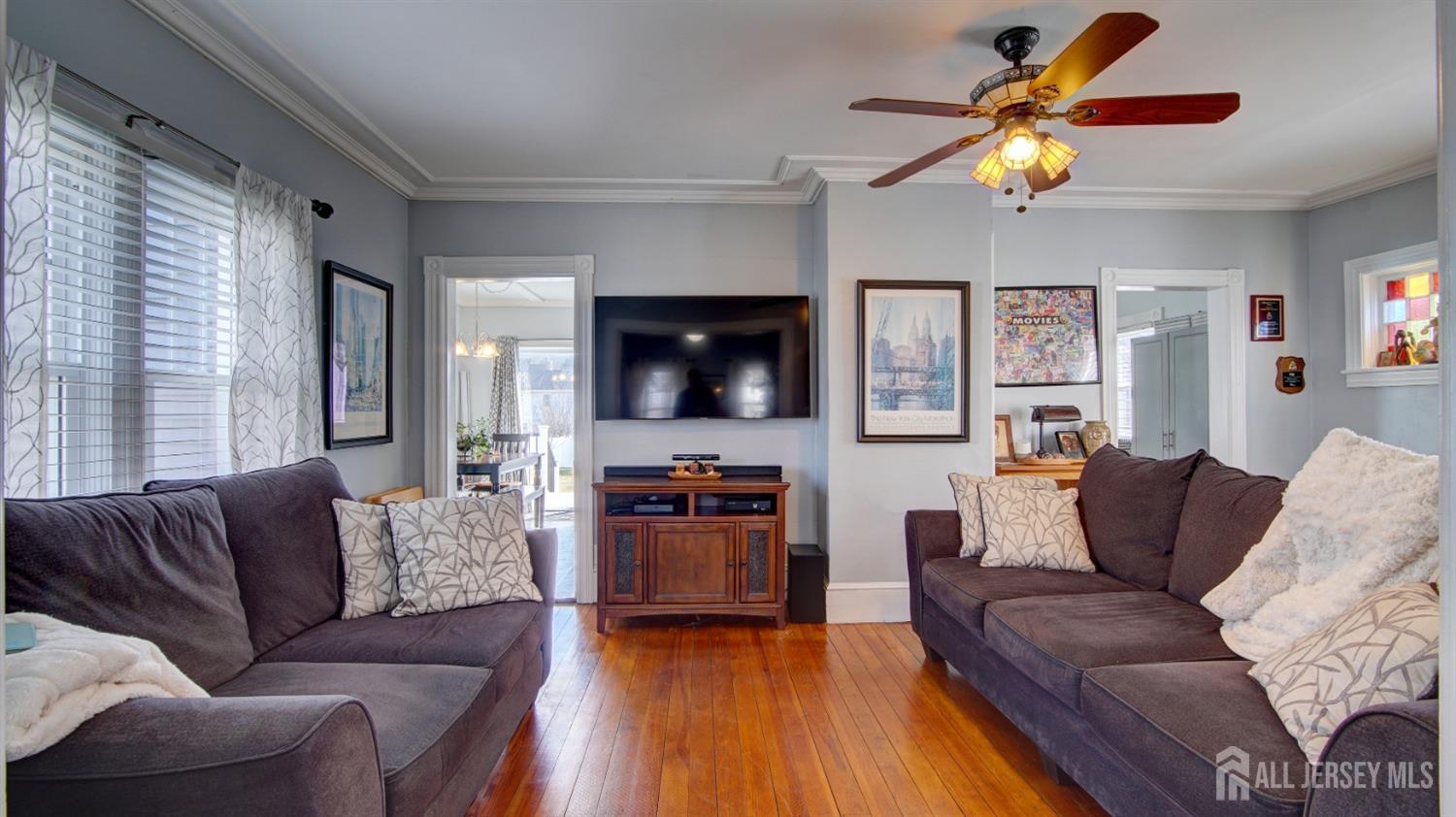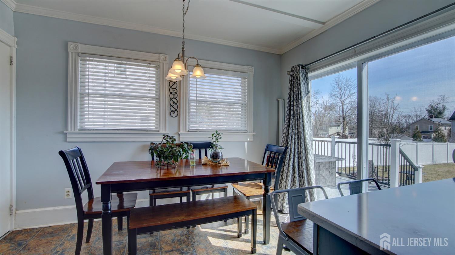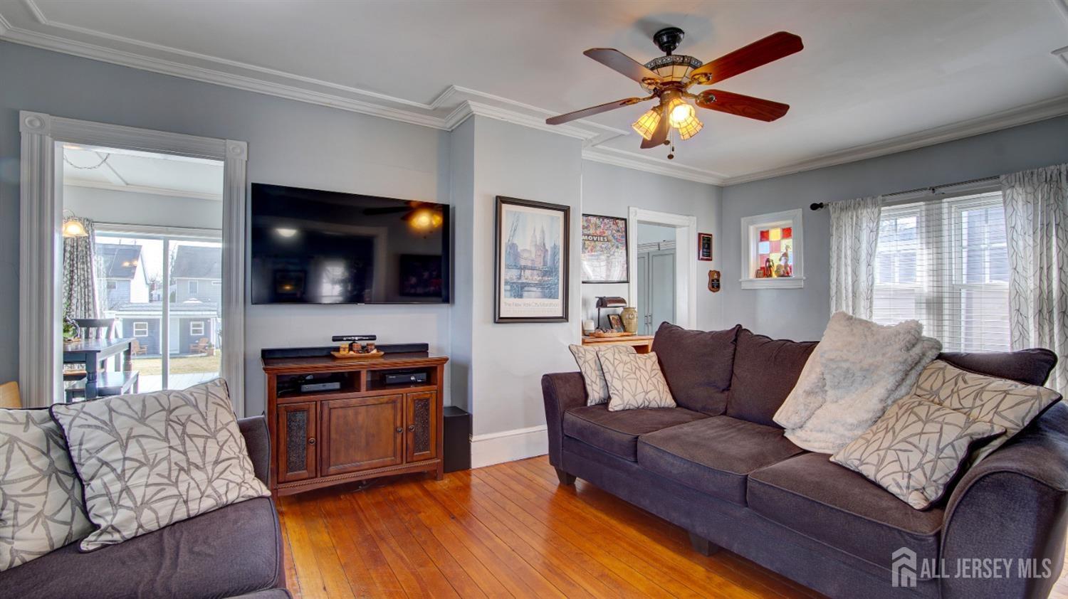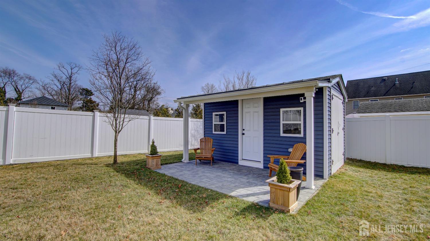 Welcome to this beautifully designed 3 bedrm 2.5 bath Colonial featuring a mix of modern updates & classic charm. Upon entering, step into the foyer w/elegant hardwood floors, leading into the formal living room, w/HW floors. This space is illuminated by side windows, overhead lighting, & finished w/crown molding, creating a sophisticated atmosphere. The spacious family room boasts HW floors, crown molding & decorative molding around the doorways. With light pouring in from windows on either side, this room is perfect for both relaxation & entertaining. The kitchen has been thoughtfully renovated & offers stunning quartz countertops, wood cabinets & a stylish tile backsplash. The newer SS appliances include a double oven, overhead fan & DW. The kitchen also features an undermount sink, casement windows over the sink, & see-through cabinets for additional appeal. A brand new refrigerator, ceiling fan, & a sliding glass door leading to the backyard completes this kitchen. The dining area also has decorative molding & an abundance of natural light, w/windows on either side. Adjacent to the kitchen, the laundry room offers its own dedicated space w/tile floors, overhead lighting, & window. It also features a pantry/storage closet. A door from the laundry room leads to a covered deck that leads down to the driveway. Upstairs, you'll find a continuation of the HW floors in the foyer. Bedrm 2 is outfitted w/laminate flooring & 3 windows, offering ample natural light. This room also features a WIC, crown molding, & overhead lighting. Bedrm 3 is similarly equipped w/ laminate flooring, overhead lighting, a closet, & a built-in desk area. The full bath has tile floors, recessed lighting & tub-shower combo. The primary suite,(a 400 sq ft addition), is an impressive retreat w/vaulted ceilings, recessed lighting & speaker system for surround sound. 2 windows bring in natural light, & the suite also features double closets w/ built-in organizers. The primary bath has a maple vanity, tile floors, & a step-in shower w/clear glass doors. A spacious linen closet adds to the bathroom's functionality. The unfinished basement offers plenty of storage w/ an area for the furnace & HWH (5 yrs). Outside, you'll find a beautifully landscaped fenced yard w/ a 2-tier deck, paver pathways near the garage, & a vinyl fence. The garage, which has barn doors & electric, offers ample space & includes a side entry door. Both the garage roof & siding are new. Additional outdoor features include a new shed w/ electric & dusk-to-dawn lighting, as well as a greenhouse w/electric. The home also features a lovely covered sitting porch w/ recessed lighting, concrete walkways to the driveway & sidewalk, and an asphalt driveway w/ room for up to 4 cars. The property includes an underground sprinkler system for easy lawn maintenance.Located near shopping, restaurants,major roadways,and NJ bus stops. Pier Village a short distant away.