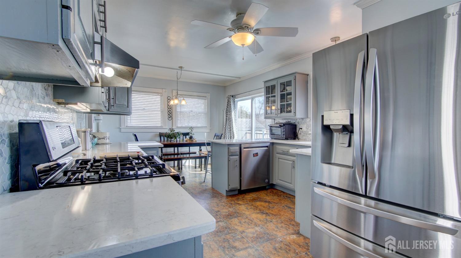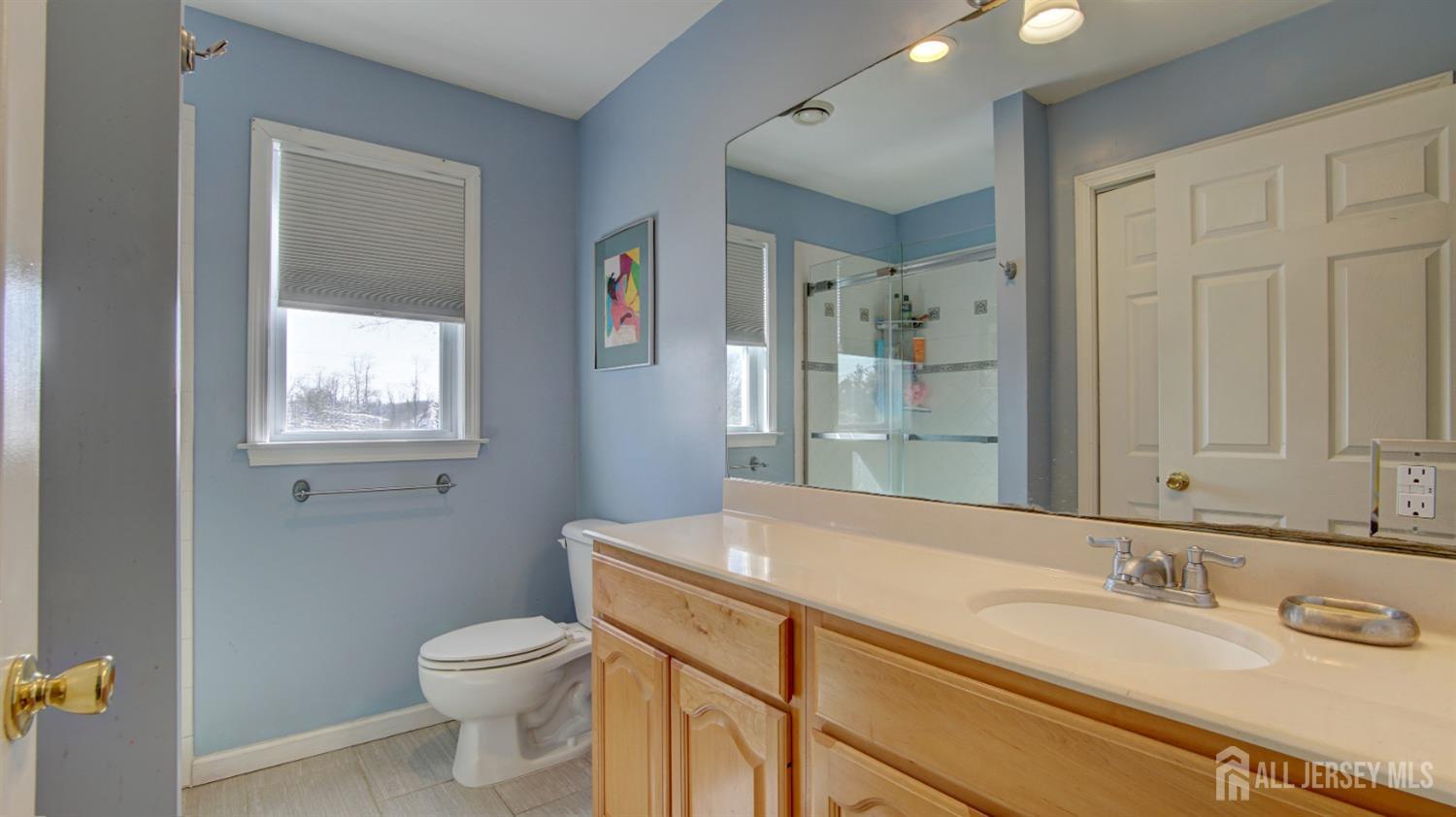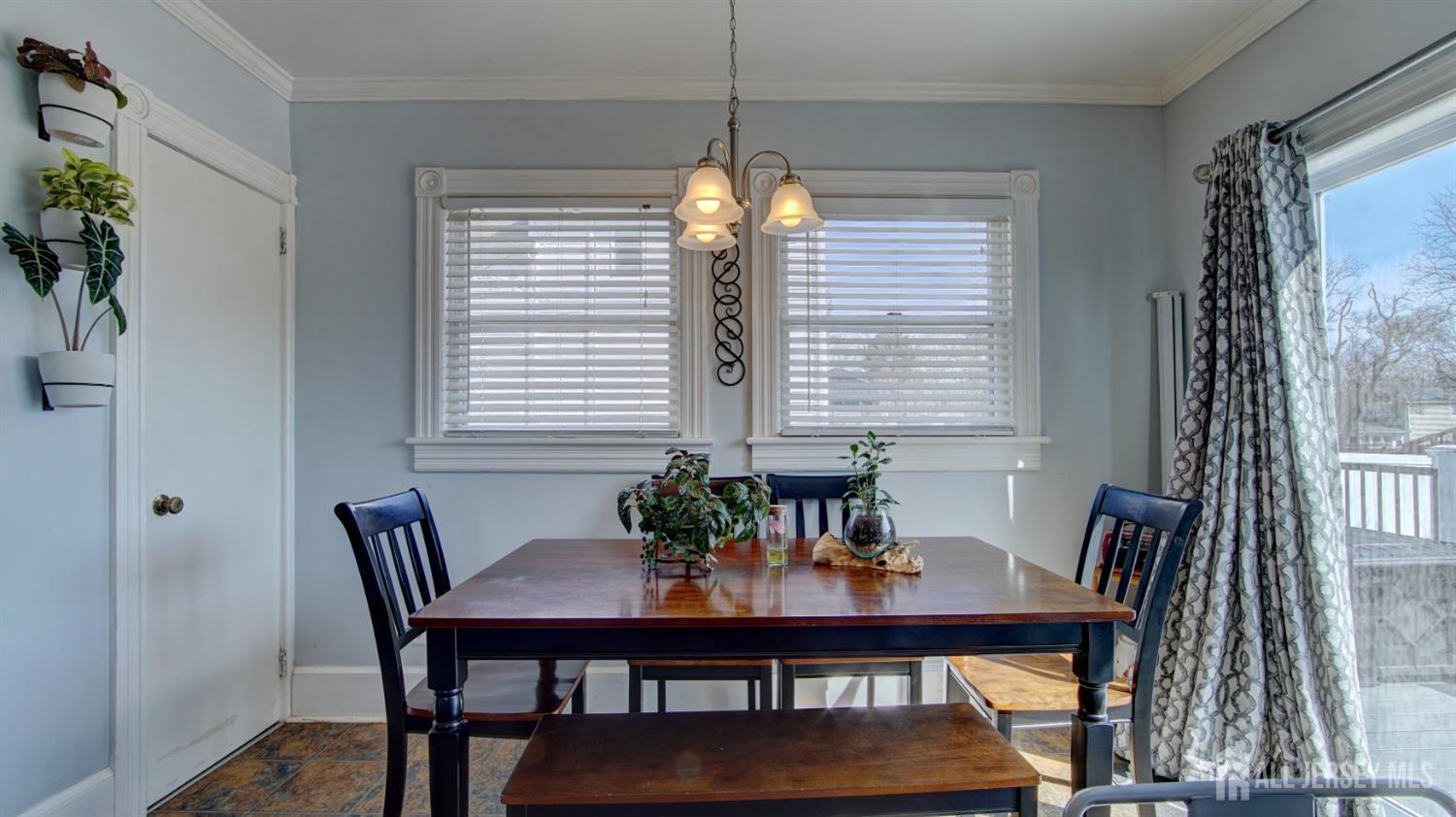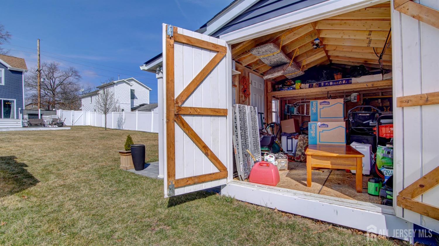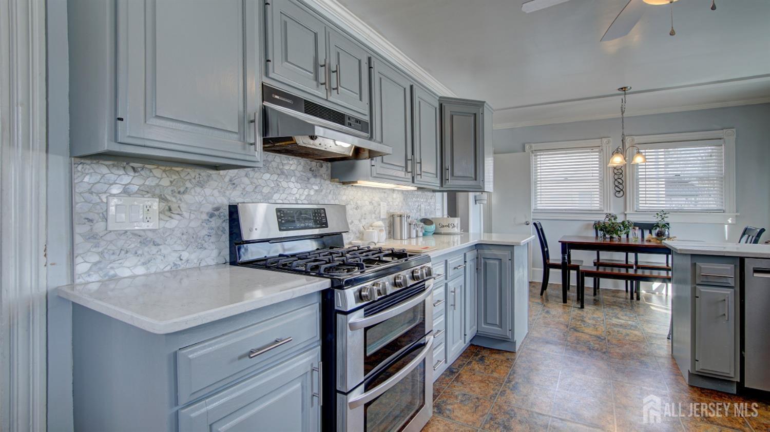 Welcome to this beautifully designed 3 bedrm 2.5 bath Colonial featuring a mix of modern updates & classic charm. Upon entering, step into the foyer w/elegant hardwood floors, leading into the formal living room, w/HW floors. This space is illuminated by side windows, overhead lighting, & finished w/crown molding, creating a sophisticated atmosphere. The spacious family room boasts HW floors, crown molding & decorative molding around the doorways. With light pouring in from windows on either side, this room is perfect for both relaxation & entertaining. The kitchen has been thoughtfully renovated & offers stunning quartz countertops, wood cabinets & a stylish tile backsplash. The newer SS appliances include a double oven, overhead fan & DW. The kitchen also features an undermount sink, casement windows over the sink, & see-through cabinets for additional appeal. A brand new refrigerator, ceiling fan, & a sliding glass door leading to the backyard completes this kitchen. The dining area also has decorative molding & an abundance of natural light, w/windows on either side. Adjacent to the kitchen, the laundry room offers its own dedicated space w/tile floors, overhead lighting, & window. It also features a pantry/storage closet. A door from the laundry room leads to a covered deck that leads down to the driveway. Upstairs, you'll find a continuation of the HW floors in the foyer. Bedrm 2 is outfitted w/laminate flooring & 3 windows, offering ample natural light. This room also features a WIC, crown molding, & overhead lighting. Bedrm 3 is similarly equipped w/ laminate flooring, overhead lighting, a closet, & a built-in desk area. The full bath has tile floors, recessed lighting & tub-shower combo. The primary suite,(a 400 sq ft addition), is an impressive retreat w/vaulted ceilings, recessed lighting & speaker system for surround sound. 2 windows bring in natural light, & the suite also features double closets w/ built-in organizers. The primary bath has a maple vanity, tile floors, & a step-in shower w/clear glass doors. A spacious linen closet adds to the bathroom's functionality. The unfinished basement offers plenty of storage w/ an area for the furnace & HWH (5 yrs). Outside, you'll find a beautifully landscaped fenced yard w/ a 2-tier deck, paver pathways near the garage, & a vinyl fence. The garage, which has barn doors & electric, offers ample space & includes a side entry door. Both the garage roof & siding are new. Additional outdoor features include a new shed w/ electric & dusk-to-dawn lighting, as well as a greenhouse w/electric. The home also features a lovely covered sitting porch w/ recessed lighting, concrete walkways to the driveway & sidewalk, and an asphalt driveway w/ room for up to 4 cars. The property includes an underground sprinkler system for easy lawn maintenance.Located near shopping, restaurants,major roadways,and NJ bus stops. Pier Village a short distant away.