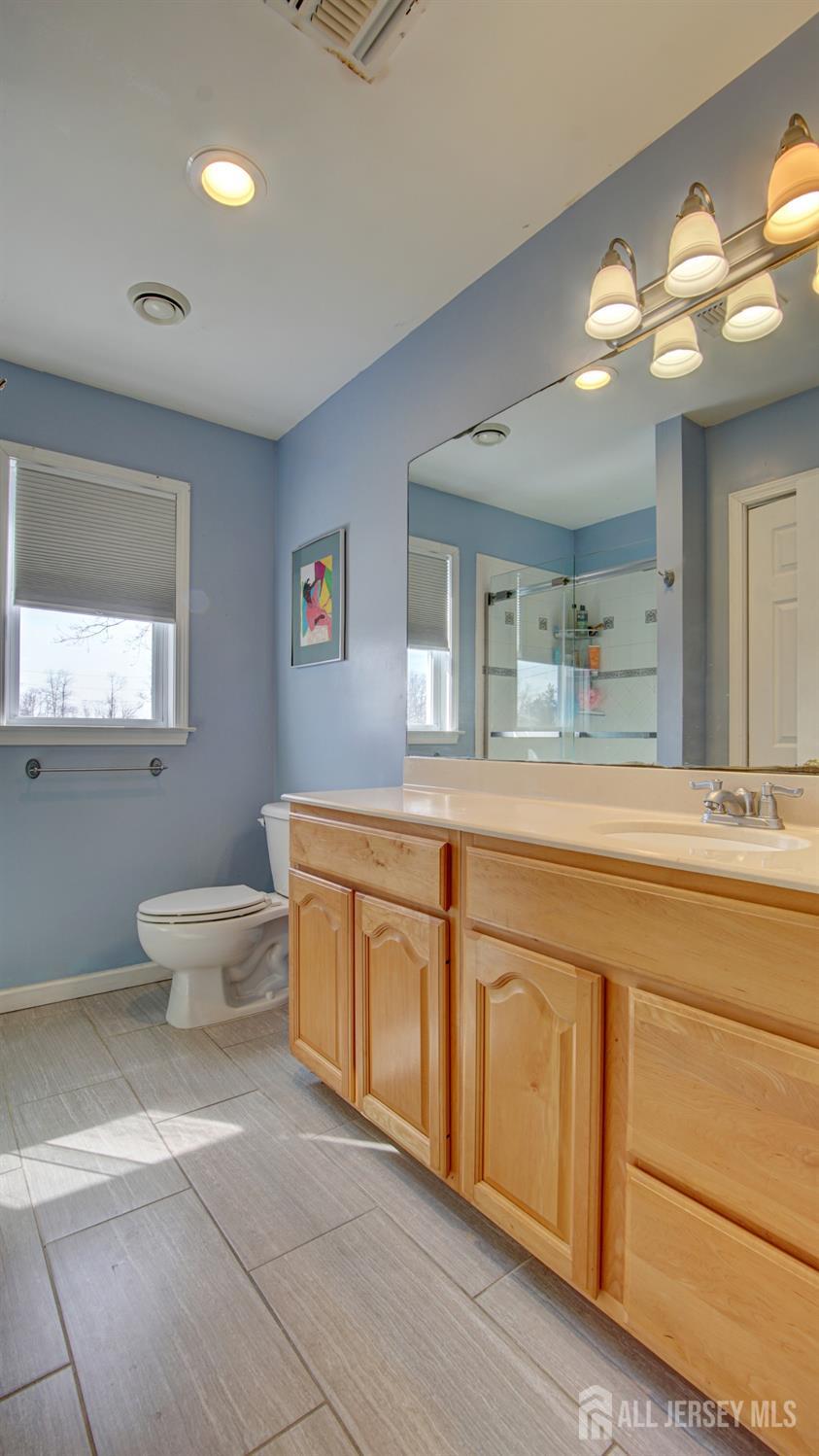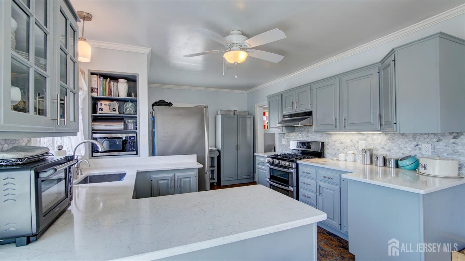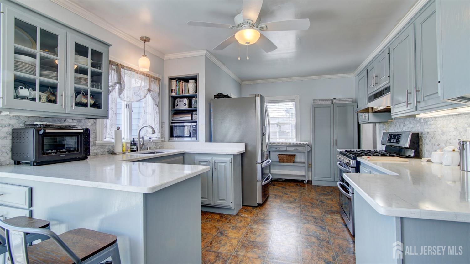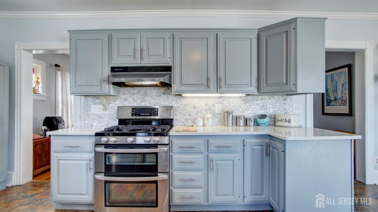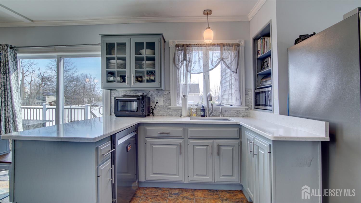 Welcome to this beautifully designed 3 bedrm 2.5 bath Colonial featuring a mix of modern updates & classic charm. Upon entering, step into the foyer w/elegant hardwood floors, leading into the formal living room, w/HW floors. This space is illuminated by side windows, overhead lighting, & finished w/crown molding, creating a sophisticated atmosphere. The spacious family room boasts HW floors, crown molding & decorative molding around the doorways. With light pouring in from windows on either side, this room is perfect for both relaxation & entertaining. The kitchen has been thoughtfully renovated & offers stunning quartz countertops, wood cabinets & a stylish tile backsplash. The newer SS appliances include a double oven, overhead fan & DW. The kitchen also features an undermount sink, casement windows over the sink, & see-through cabinets for additional appeal. A brand new refrigerator, ceiling fan, & a sliding glass door leading to the backyard completes this kitchen. The dining area also has decorative molding & an abundance of natural light, w/windows on either side. Adjacent to the kitchen, the laundry room offers its own dedicated space w/tile floors, overhead lighting, & window. It also features a pantry/storage closet. A door from the laundry room leads to a covered deck that leads down to the driveway. Upstairs, you'll find a continuation of the HW floors in the foyer. Bedrm 2 is outfitted w/laminate flooring & 3 windows, offering ample natural light. This room also features a WIC, crown molding, & overhead lighting. Bedrm 3 is similarly equipped w/ laminate flooring, overhead lighting, a closet, & a built-in desk area. The full bath has tile floors, recessed lighting & tub-shower combo. The primary suite,(a 400 sq ft addition), is an impressive retreat w/vaulted ceilings, recessed lighting & speaker system for surround sound. 2 windows bring in natural light, & the suite also features double closets w/ built-in organizers. The primary bath has a maple vanity, tile floors, & a step-in shower w/clear glass doors. A spacious linen closet adds to the bathroom's functionality. The unfinished basement offers plenty of storage w/ an area for the furnace & HWH (5 yrs). Outside, you'll find a beautifully landscaped fenced yard w/ a 2-tier deck, paver pathways near the garage, & a vinyl fence. The garage, which has barn doors & electric, offers ample space & includes a side entry door. Both the garage roof & siding are new. Additional outdoor features include a new shed w/ electric & dusk-to-dawn lighting, as well as a greenhouse w/electric. The home also features a lovely covered sitting porch w/ recessed lighting, concrete walkways to the driveway & sidewalk, and an asphalt driveway w/ room for up to 4 cars. The property includes an underground sprinkler system for easy lawn maintenance.Located near shopping, restaurants,major roadways,and NJ bus stops. Pier Village a short distant away.