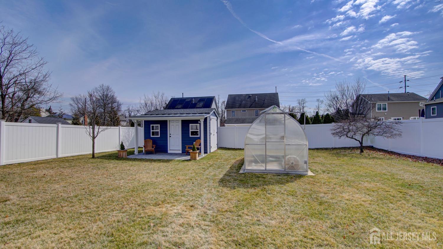 Exterior Features: Lawn Sprinklers, Open Porch(es), Curbs, Deck, Fencing/Wall, Storage Shed, Greenhouse Type Room, Yard