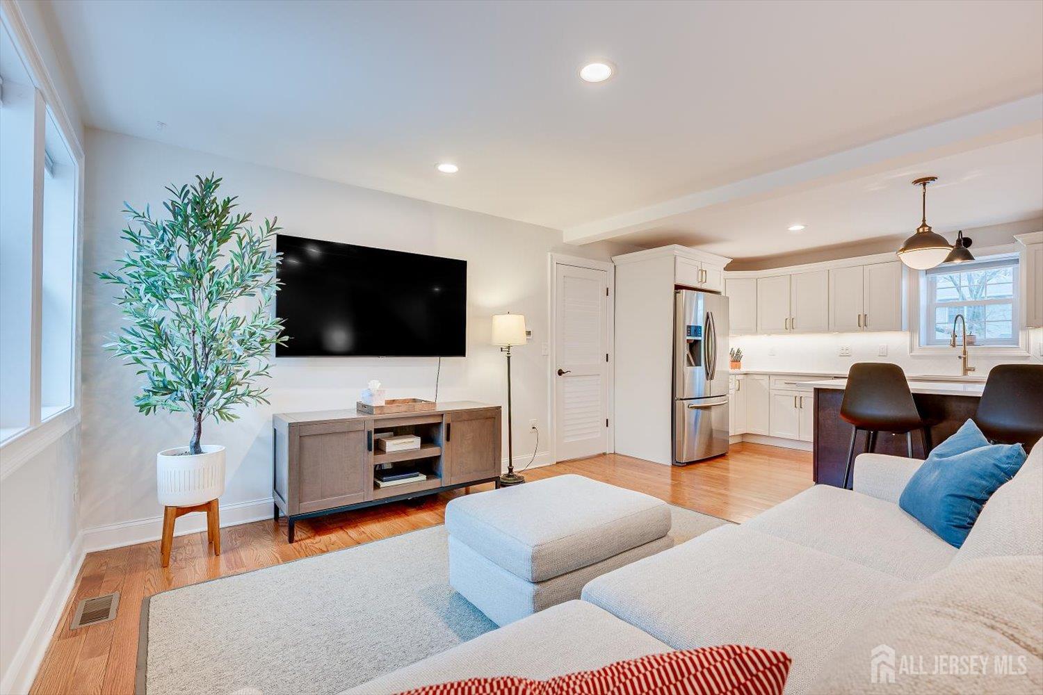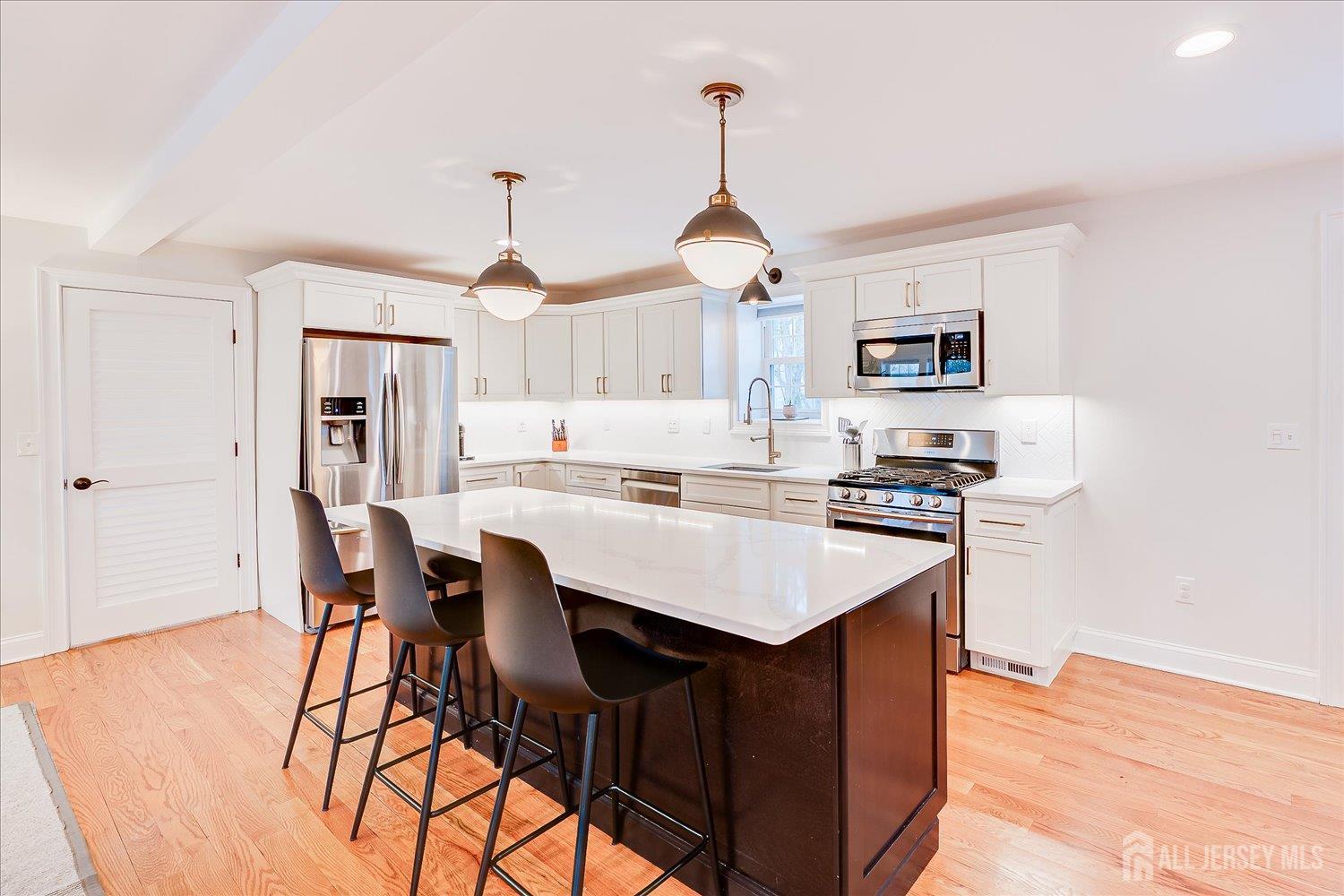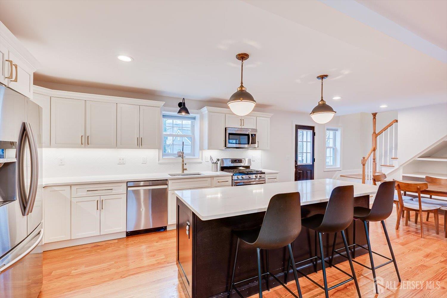 Welcome to 152 4th St, a beautifully renovated 3-bedroom, 2.5-bath home in Clara Barton. Completely updated in 2023, this turn-key home combines modern comfort with a prime location just minutes from downtown Metuchen and train station with direct service to NYC. The open floor plan is bright and inviting, perfect for everyday living and entertaining. The updated kitchen features modern appliances, ample cabinet space, and a large center island ideal for casual dining and hosting. Hardwood floors and recessed lighting enhance the home's warm, modern feel, while multi-zone heating and cooling ensure year-round comfort and energy efficiency. Upstairs, three spacious bedrooms include a primary suite with a walkin closet and full bath, complemented by a second full bath. A convenient half bath on the main level adds practicality. The finished basement offers valuable additional living spaceperfect for a family room, home office, or gym. Outside, enjoy a private backyard ideal for relaxation or gatherings, along with a sprinkler system for easy lawn maintenance. An oversized 2-car detached garage offers ample space for vehicles, storage, or a workshop. With thoughtful updates, flexible living space, and a location close to transit, parks, and a vibrant downtown, 152 4th St is a move-in-ready home in one of Edison's most desirable neighborhoods.
