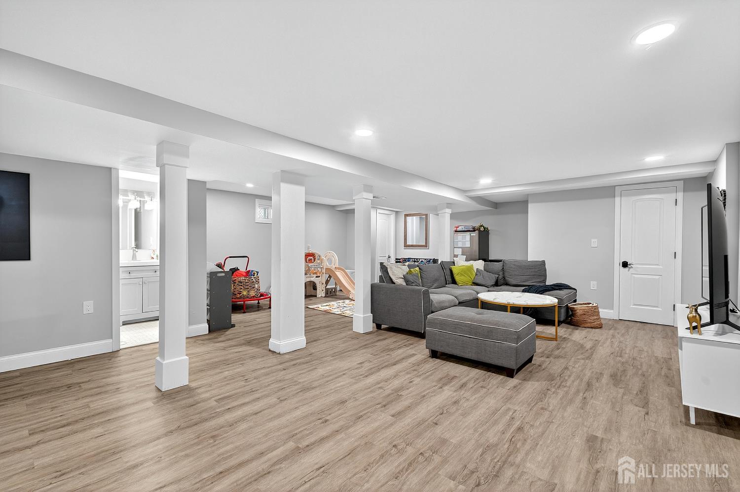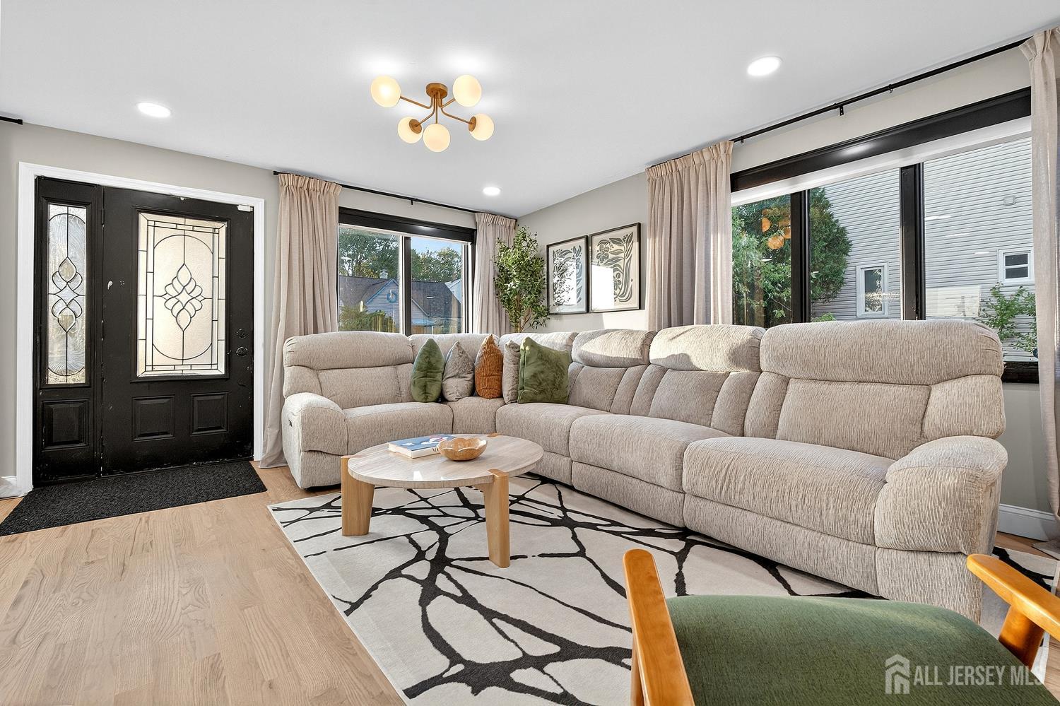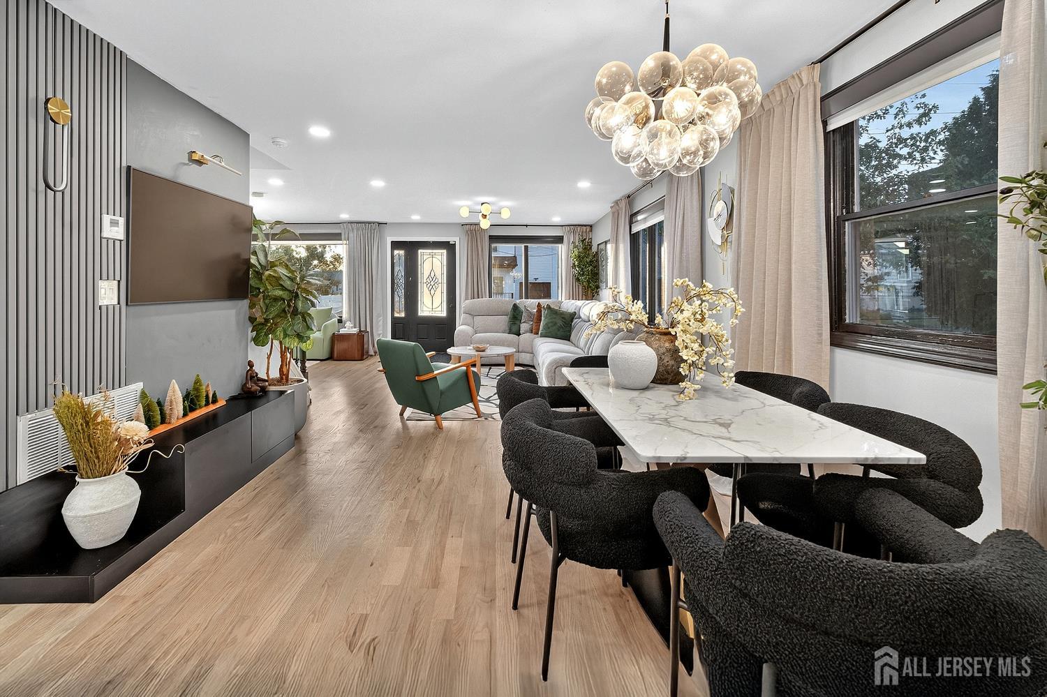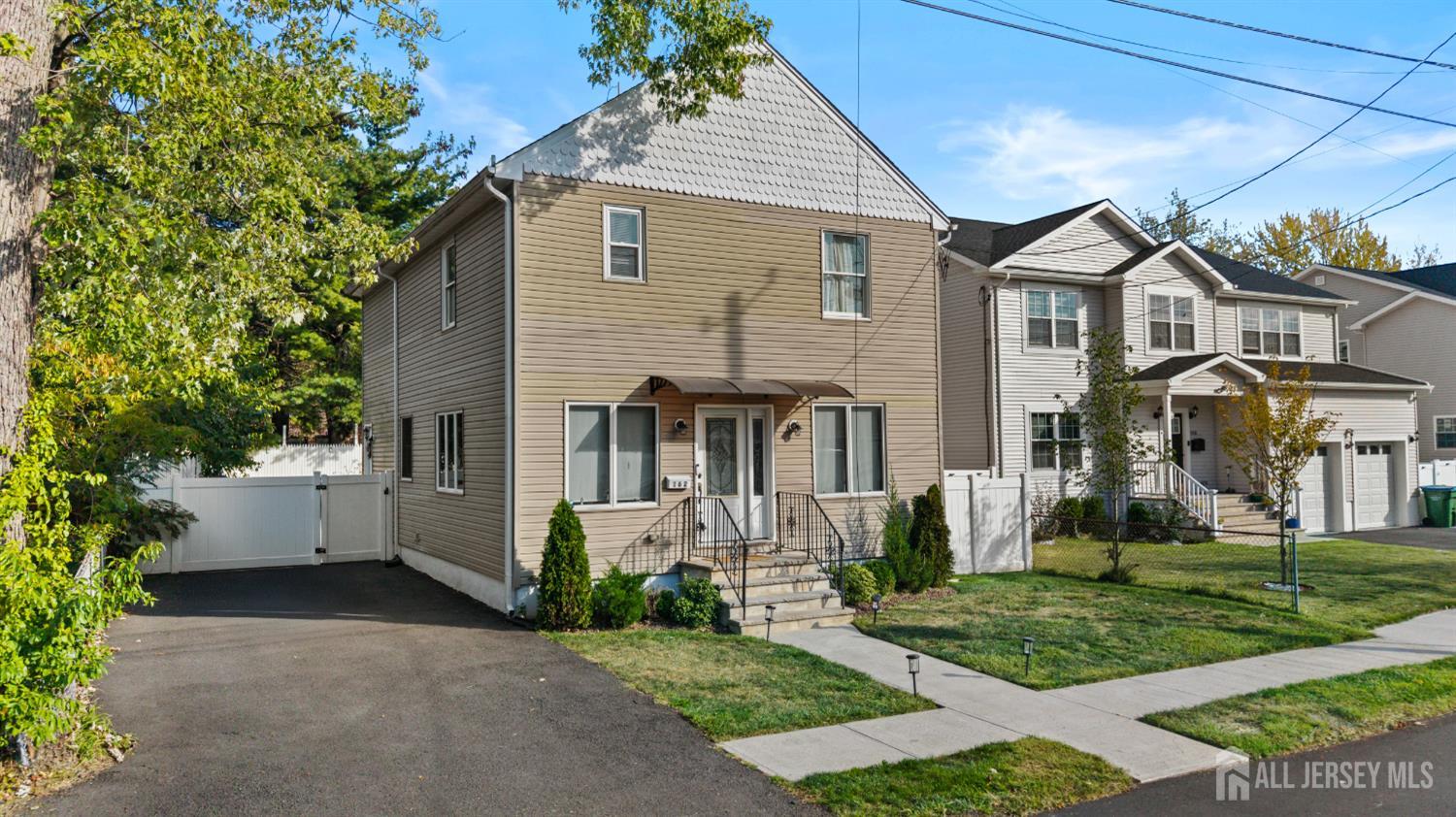Prime location meets turn-key luxury enjoy effortless access to public transportation and a vibrant downtown scene filled with shopping, dining, and everyday conveniences. Welcome to this stunning Colonial, fully upgraded in 2022, where modern finishes and timeless design come together beautifully. Inside, the main level shines with an open-concept layout, luxury vinyl flooring, and recessed lighting throughout. The spacious living room flows seamlessly into the dining area and a true chef's kitchen complete with a center island, breakfast bar, and a sleek pull-out microwave drawer. You'll love the 42 shaker cabinetry with crown molding, gold hardware, subway tile backsplash, undermount sink, and premium stainless steel appliances including a French-door refrigerator, 5-burner gas range with overhead vent fan, dishwasher, and the built-in microwave drawer on the island. Sliding doors lead to the deck perfect for indoor-outdoor entertaining. A full first-floor bath with a tiled stall shower adds flexibility and convenience. Upstairs offers four generously sized bedrooms and two full baths including a private primary suite with a spa-like bath featuring custom tilework. The beautifully finished basement expands your living space with a large recreation area, a full bath with stall shower, and a dedicated laundry room with custom shelving ideal for movie nights, a home gym, play space, or guests. Step outside to your fully fenced backyard oasis designed for unforgettable summers. Enjoy the deck, paver walkways, and an in-ground pool complete with a waterfall and diving board perfect for entertaining, relaxing, and making memories. Additional highlights include dual-zone HVAC and stylish lighting selections throughout. Move-in ready and packed with upgrades, this home truly checks every box close to NYC-bound bus service, trains, downtown shopping and restaurants, and major roadways including 287, 1&9, GSP, and the NJ Turnpike.