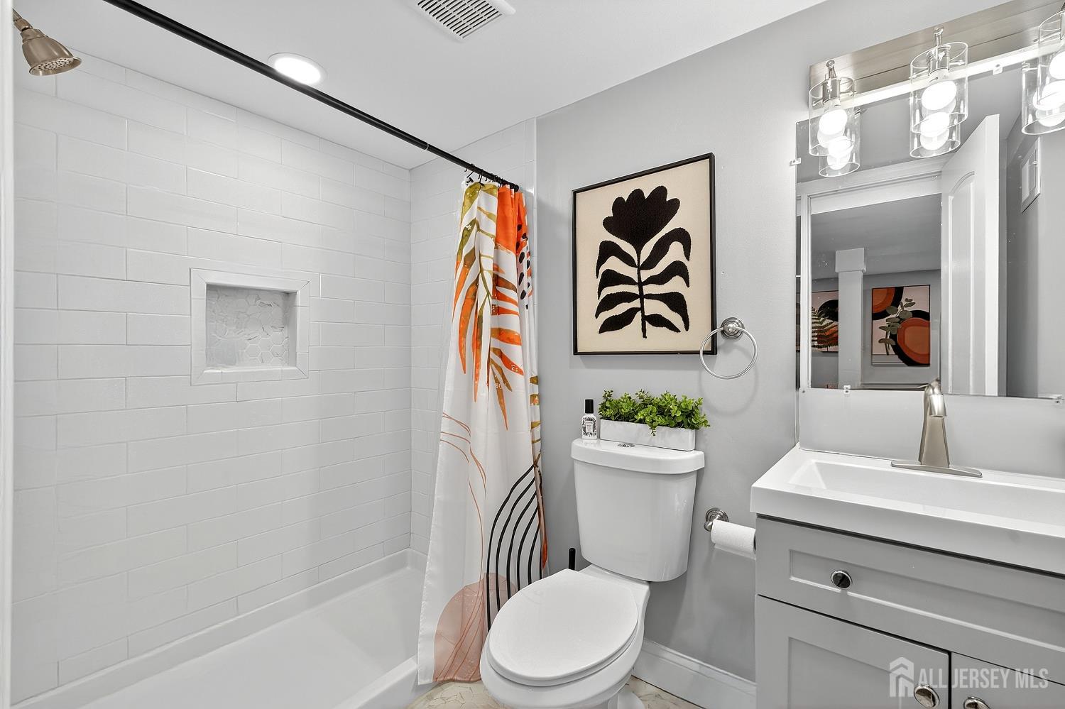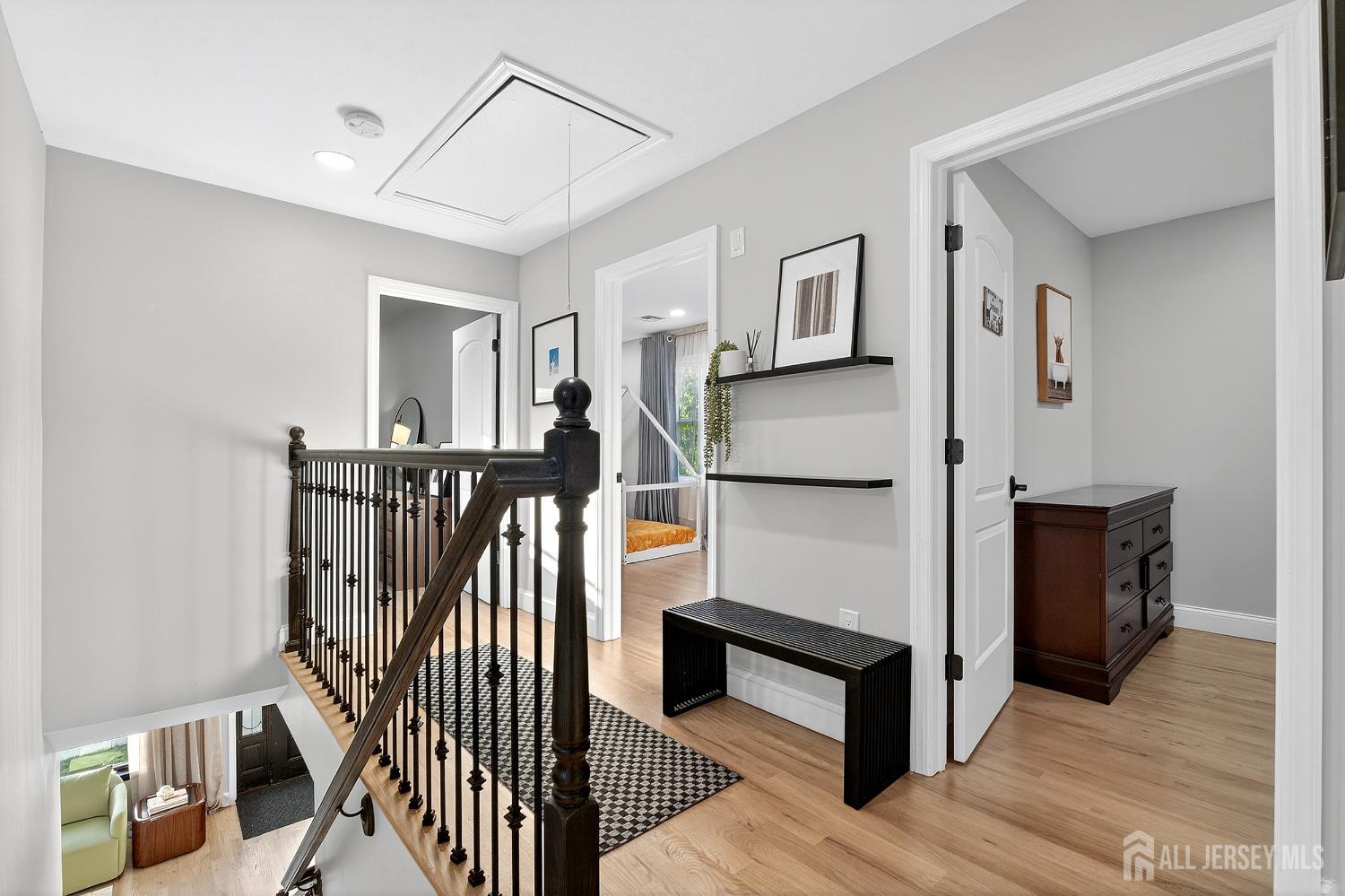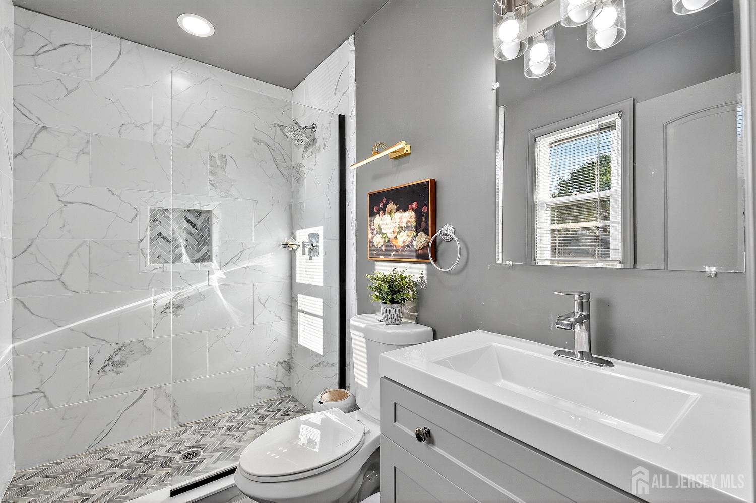 Prime location meets turn-key luxury enjoy effortless access to public transportation and a vibrant downtown scene filled with shopping, dining, and everyday conveniences. Welcome to this stunning Colonial, fully upgraded in 2022, where modern finishes and timeless design come together beautifully. Inside, the main level shines with an open-concept layout, luxury vinyl flooring, and recessed lighting throughout. The spacious living room flows seamlessly into the dining area and a true chef's kitchen complete with a center island, breakfast bar, and a sleek pull-out microwave drawer. You'll love the 42 shaker cabinetry with crown molding, gold hardware, subway tile backsplash, undermount sink, and premium stainless steel appliances including a French-door refrigerator, 5-burner gas range with overhead vent fan, dishwasher, and the built-in microwave drawer on the island. Sliding doors lead to the deck perfect for indoor-outdoor entertaining. A full first-floor bath with a tiled stall shower adds flexibility and convenience. Upstairs offers four generously sized bedrooms and two full baths including a private primary suite with a spa-like bath featuring custom tilework. The beautifully finished basement expands your living space with a large recreation area, a full bath with stall shower, and a dedicated laundry room with custom shelving ideal for movie nights, a home gym, play space, or guests. Step outside to your fully fenced backyard oasis designed for unforgettable summers. Enjoy the deck, paver walkways, and an in-ground pool complete with a waterfall and diving board perfect for entertaining, relaxing, and making memories. Additional highlights include dual-zone HVAC and stylish lighting selections throughout. Move-in ready and packed with upgrades, this home truly checks every box close to NYC-bound bus service, trains, downtown shopping and restaurants, and major roadways including 287, 1&9, GSP, and the NJ Turnpike.