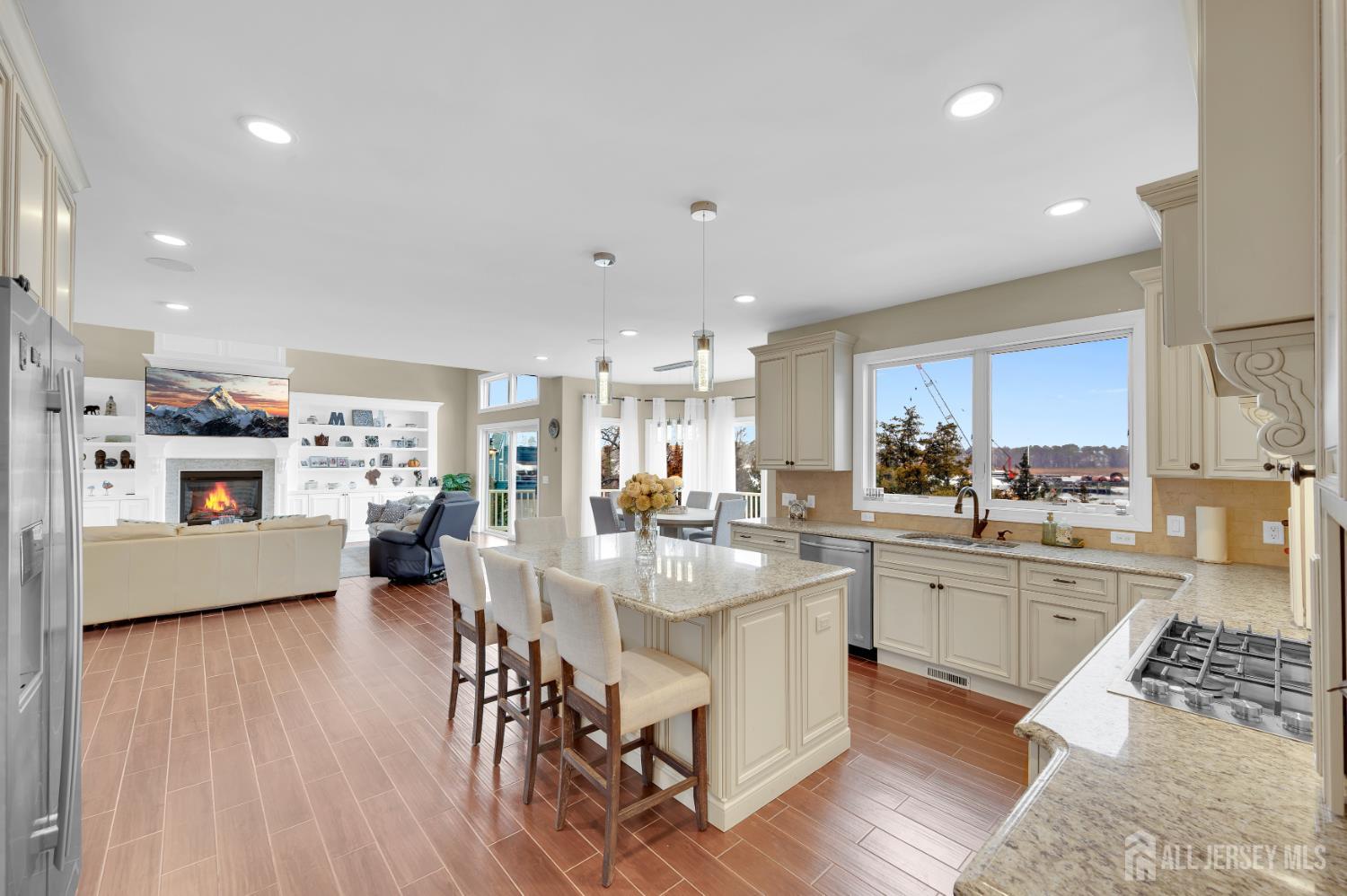 Welcome to your waterfront oasis in Snug Harbor! This spacious 5-bedroom, 3.5-bath home offers approx. 4,000 sq ft of bright, open living space designed for comfort and entertaining. The first floor features a vaulted living room with gas fireplace flowing into a custom kitchen with stainless steel appliances and a large pantry. A first-floor bedroom and full bath add flexibility. Enjoy a wraparound deck, private balcony off the primary suite, and a finished third floor for office, gym, or playroom. Outside, relax by the saltwater pool and patio with direct access to the open bay--boater's dream living near shopping, dining, and more.