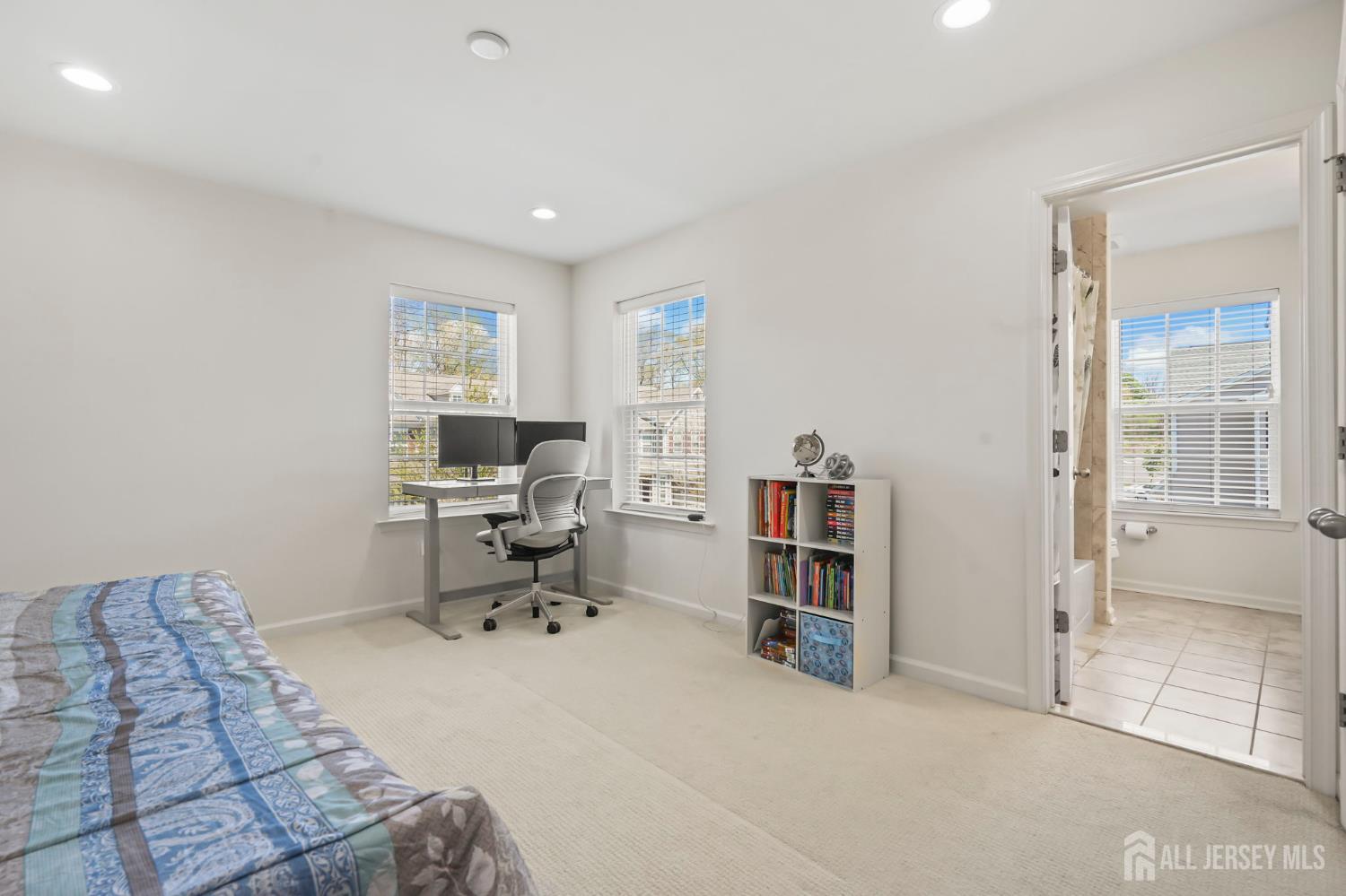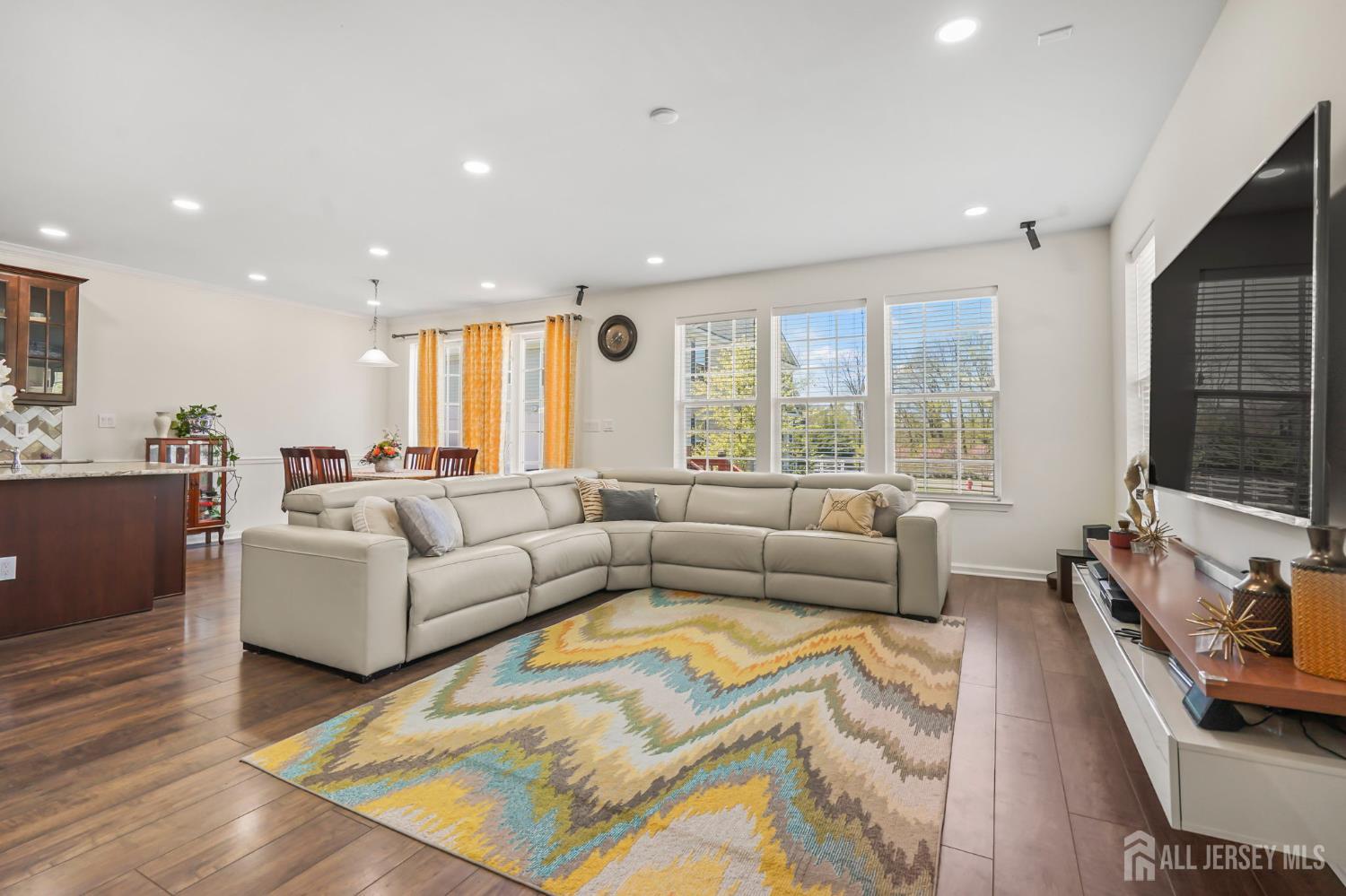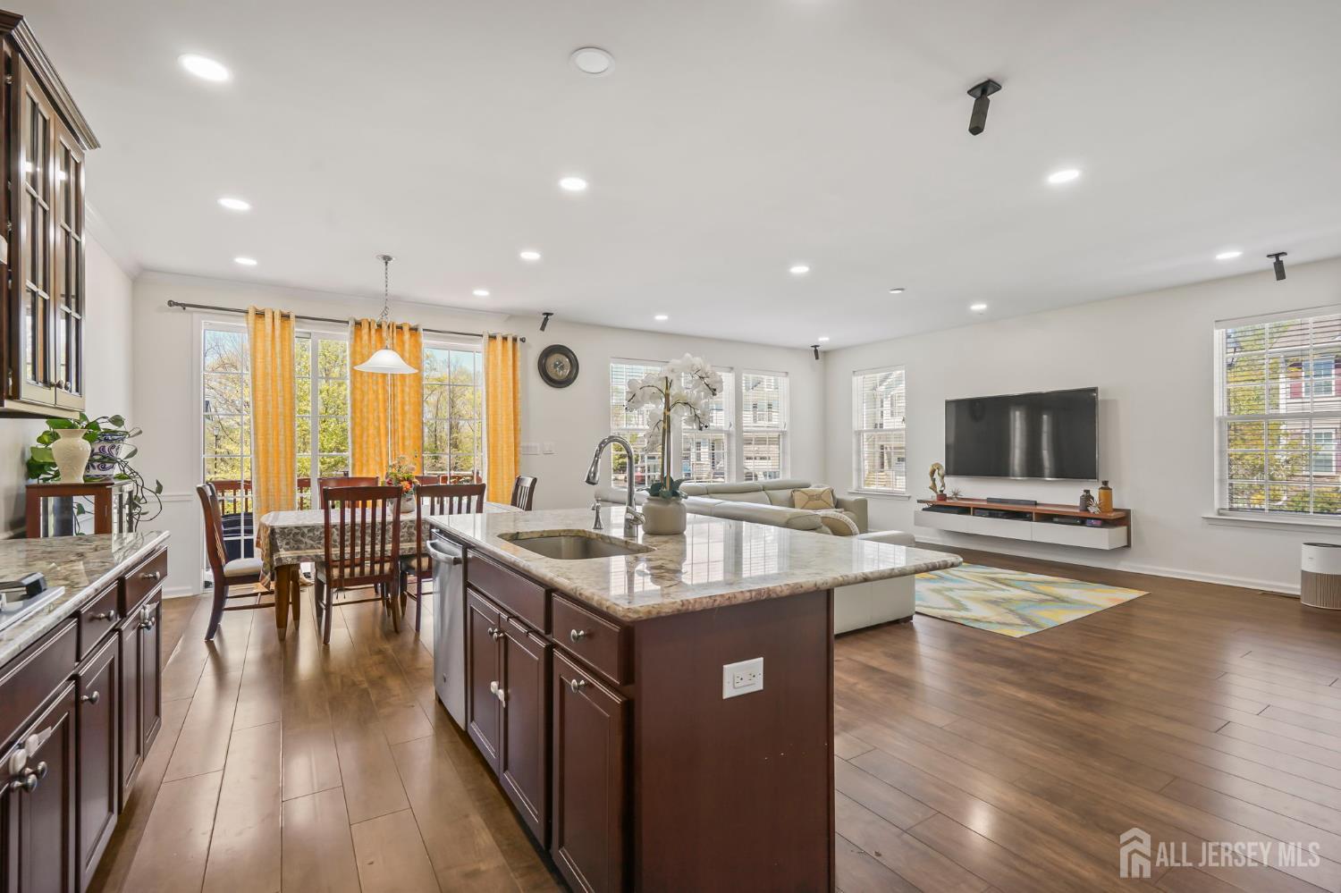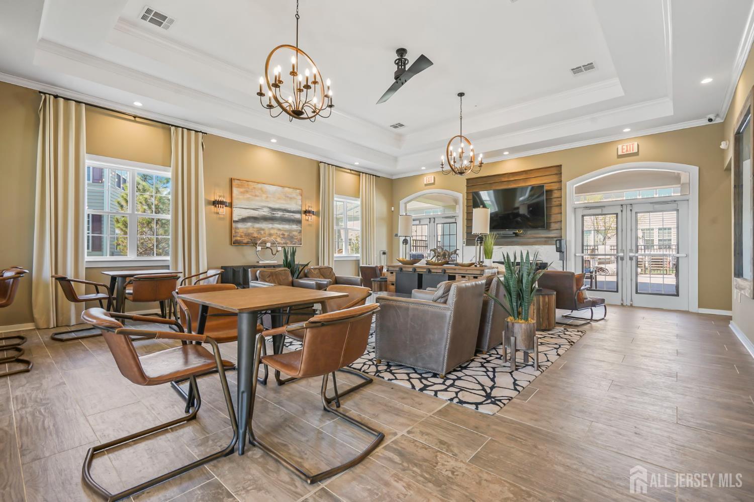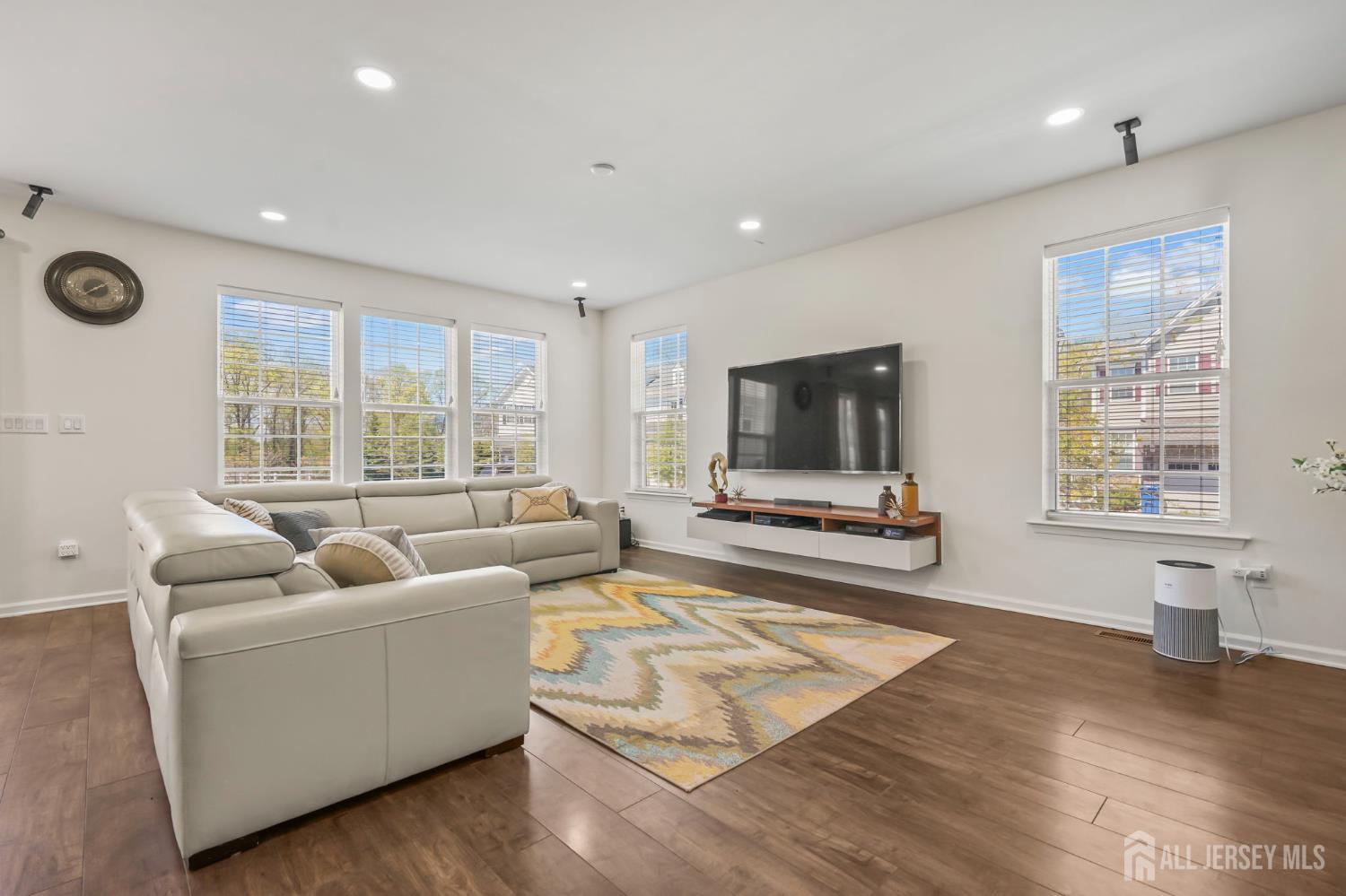 Welcome to the super desirable Arbors community of luxury townhomes located in Monroe Township. This bright and airy 3-bedroom, 3.5-bath end unit townhome features a grand open floor plan with a gourmet kitchen equipped with granite countertops, upgraded cabinets, premium stainless steel appliances, and a spacious island, plus generous living and dining areas. The living room also includes a full Bose surround sound system. Wood floors cover the main level, and sliding doors from the dining room lead to a custom deck for relaxing on those warm sunny days. The second floor has a large main bedroom with a walk-in closet and a custom bathroom with a whirlpool tub and a separate shower along with double sinks. In addition, there are two extra bedrooms for guests or family, another full bathroom offers double sinks with a tub/shower and a bonus den provides space for TV or reading. The finished basement features a 3rd full bathroom and built-in speakers, great for hosting guests or movie nights. The two-car garage has an electric car charger. Community perks feature a clubhouse, pool, fitness center, top schools, a direct NYC bus stop, and quick access to Rt 33, restaurants, and shopping.