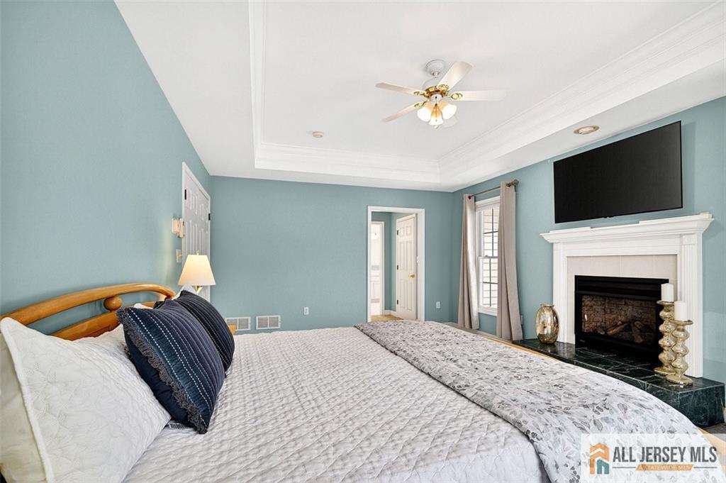 Tucked away on a quiet cul-de-sac, this beautifully appointed five-bedroom home offers exceptional space, thoughtful updates, and remarkable flexibility. With three full and two half baths, it's designed for both comfortable everyday living and effortless entertaining. A dramatic two-story foyer sets an impressive tone, opening to the sun-filled living and formal dining rooms, each enhanced by bay windows. A dedicated office, inviting family room, bright sunroom with its own bay window, and a charming two-season room provide multiple spaces to gather, work, or unwind. Three fireplaces throughout the home add warmth and character. The updated kitchen serves as the heart of the home, featuring granite countertops, a sleek back-painted glass backsplash, induction cooktop,wine frig, venting hood, and a combination convection/microwave oven. Ample cabinetry and a pantry with pull-out shelving offer excellent storage. The kitchen flows seamlessly into the family room, where a striking floor-to-ceiling brick fireplace creates a dramatic focal point. From the kitchen and family room, step into the two-season rooman ideal transition space for relaxing or entertainingand continue out to the Trex deck with aluminum railings. This thoughtful indoor-outdoor connection makes it easy to enjoy the fenced backyard and peaceful surroundings. Upstairs, the expansive primary suite includes a fireplace, dual walk-in closets, and a spacious ensuite bath with soaking tub and stall shower. Four additional bedrooms and two full baths complete the second floor, including a private bedroom with its own staircase and full bathperfect for guests, an au pair, or multigenerational living. A three-car garage provides abundant storage and convenience. The lower level offers exceptional versatility with a finished walk-out portion that opens directly to the yard, ideal for recreation or additional living space, alongside a sizable unfinished area perfect for storage, hobbies, or future expansion. A first-floor laundry room adds everyday ease. Additional highlights include a newer roof, leased solar panels, and a driveway replaced just two years ago. Students attend the highly regarded Cranbury School (K-8) and Princeton High School. Residents also benefit from Cranbury's exceptionally low property taxesthe lowest in New Jersey. Commuters enjoy easy access to Route 130, the NJ Turnpike, and the Princeton Junction train station.