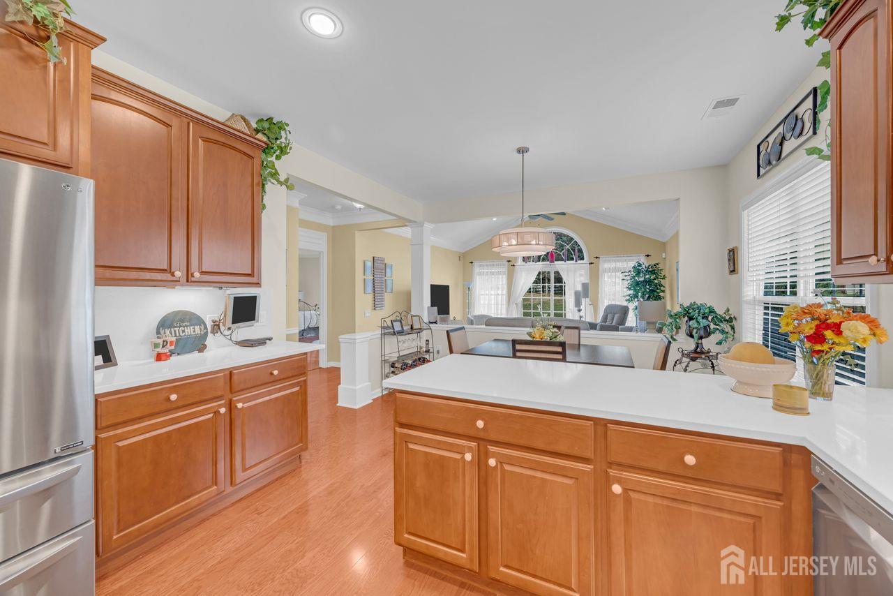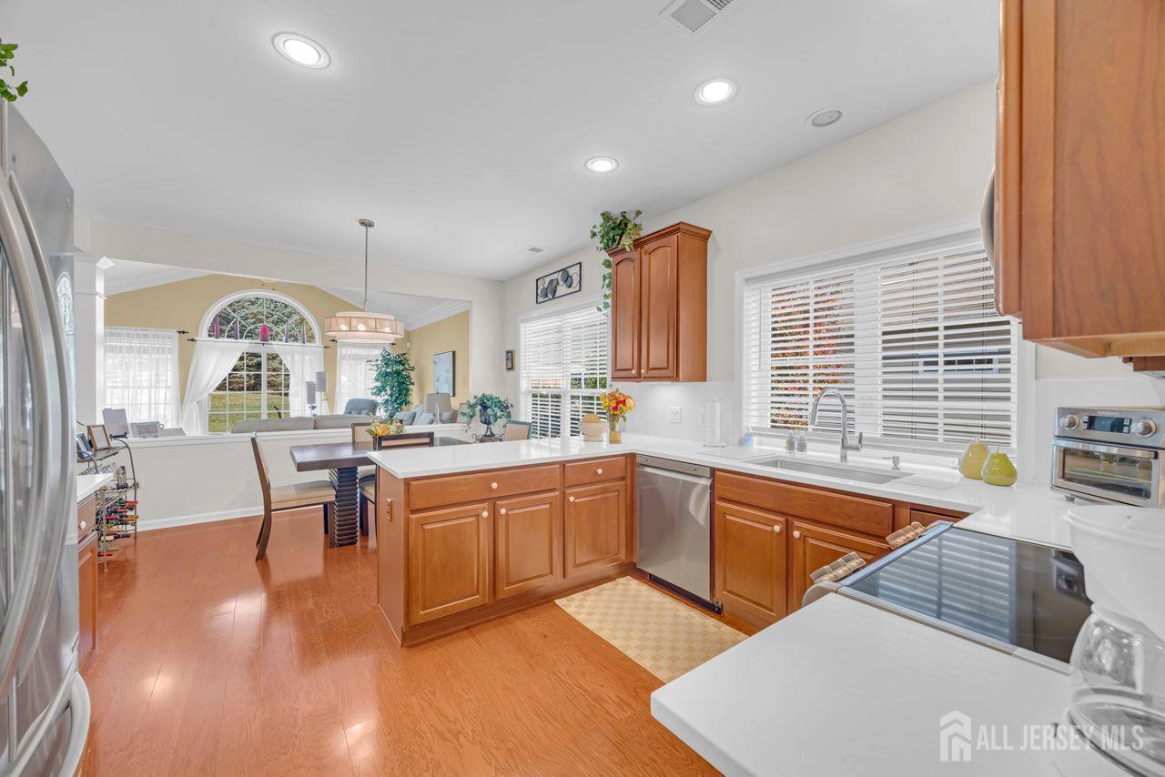 Beautiful Brighton Model. As you enter, you'll be greeted by sparkling wood floors that flow throughout the elegant living room and formal dining room. This home offers a large primary bedroom suite, including a spacious bathroom with soaking tub and an extensive closet with plenty of shelving to maximize organization. The updated kitchen boasts 42 cabinets, a custom backsplash and beautiful Quartz counter tops. Newer stainless appliances(5 yrs old) The family room with sliding doors leading to an oversized paver patio with tasteful landscaping and a private wooded backyard. Beautiful paver walkway and Front porch. Newly resurfaced driveway. This Pulte built home has decorative columns and interior trim package including crown/neck molding, chair rail and 9' ceilings. Step into luxury living with this stunning Brighton model home, offering an inviting blend of comfort and style. Somerset Run is a 55+ Adult Community with a Spectacular 25,000 SF Clubhouse, featuring both outdoor & indoor pools, a hot tub, saunas and showers for year-round enjoyment. The community boasts pickle ball, tennis, and bocce courts, a well-equipped gym, game rooms, and a large ballroom. In addition to a full-time lifestyle coordinator, there is an extensive network of clubs and activities. Somerset Run features relaxing gazebos and beautiful ponds all within a secure gated community.