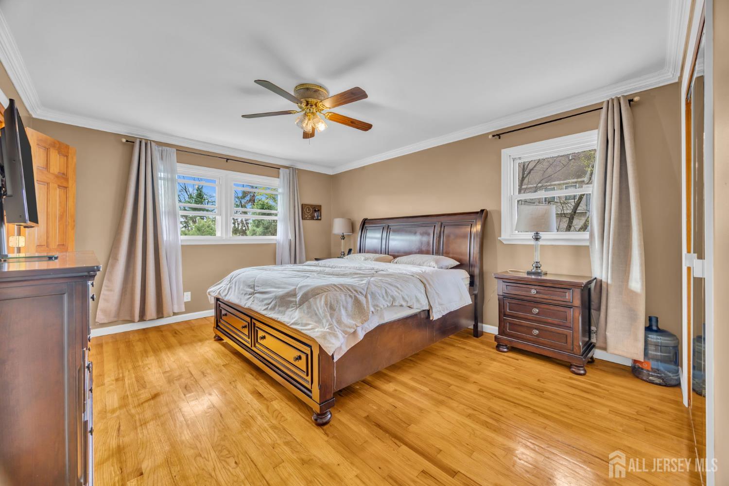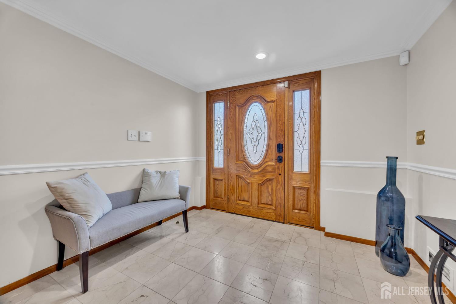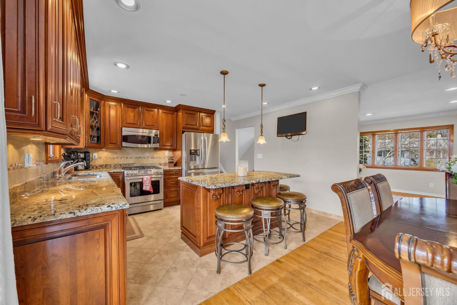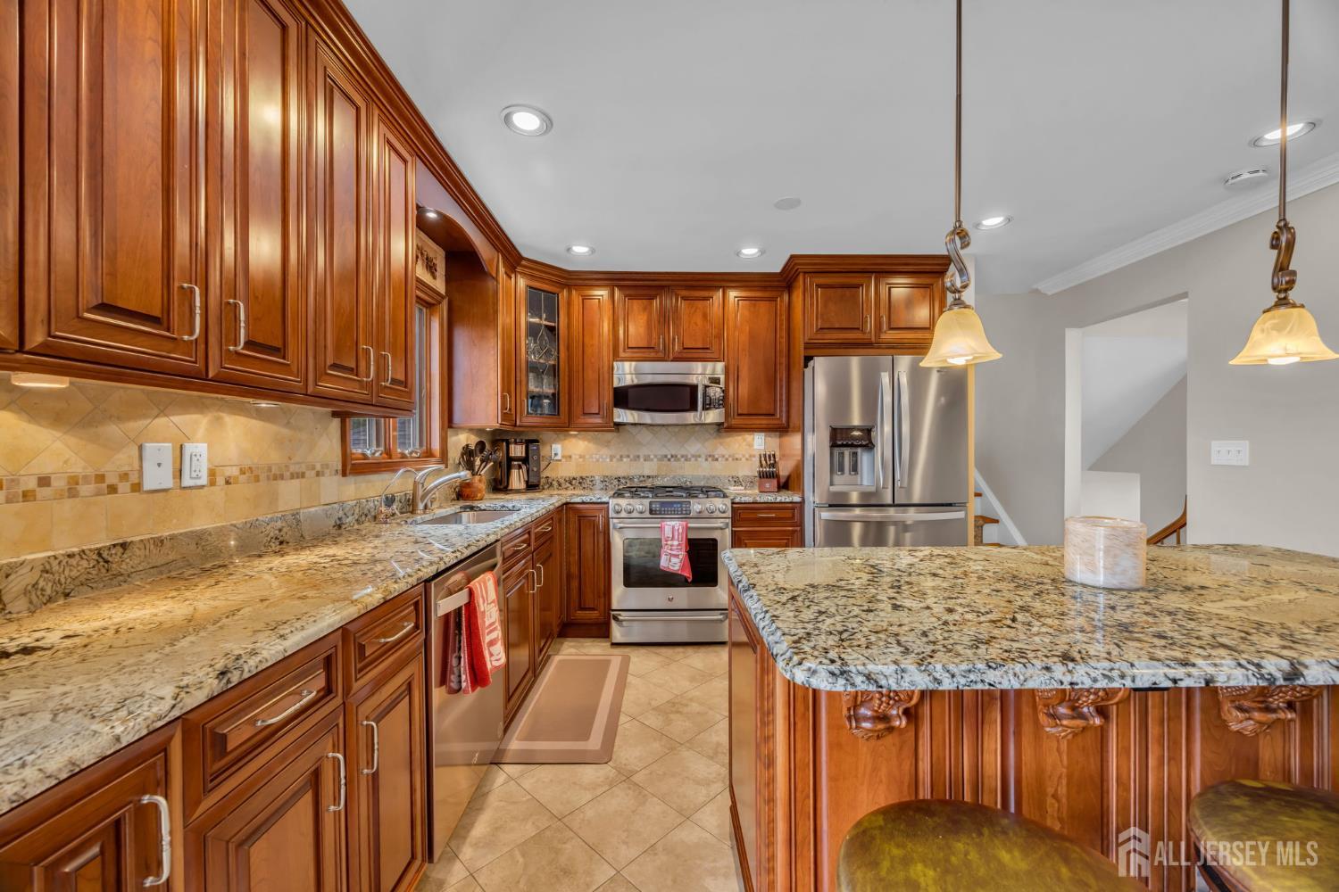 Welcome to this beautifully maintained 4 bedroom, 2.5 bath home nestled on a premium lot in a quiet dead-end street in Spotswood. Offering both privacy and space, this home combines comfort, style, and functionality in a desirable setting. Step inside to a stunning foyer featuring elegant marble flooring, leading into a home with rich wood floors throughout and freshly painted interiors. The updated kitchen boasts granite countertops and stainless steel appliances, perfect for both everyday living and entertaining. Recessed lighting enhances the bright, modern feel, while a built-in bar creates the perfect space for hosting guests. The thoughtfully designed layout includes a convenient first-floor bedroom, ideal for guests or multi-generational living. Additional highlights include a newer roof, a full home security system, and an irrigation system for easy lawn maintenance. Outside, your private backyard oasis awaits complete with an in-ground pool featuring a newer liner, a spacious deck, and a charming pavilion, perfect for relaxing or hosting gatherings. The oversized driveway and updated garage with new flooring provide ample parking and storage. Located as the last home on a peaceful dead-end street, this property offers a rare combination of tranquility and convenience. Don't miss the opportunity to make this exceptional home yours!