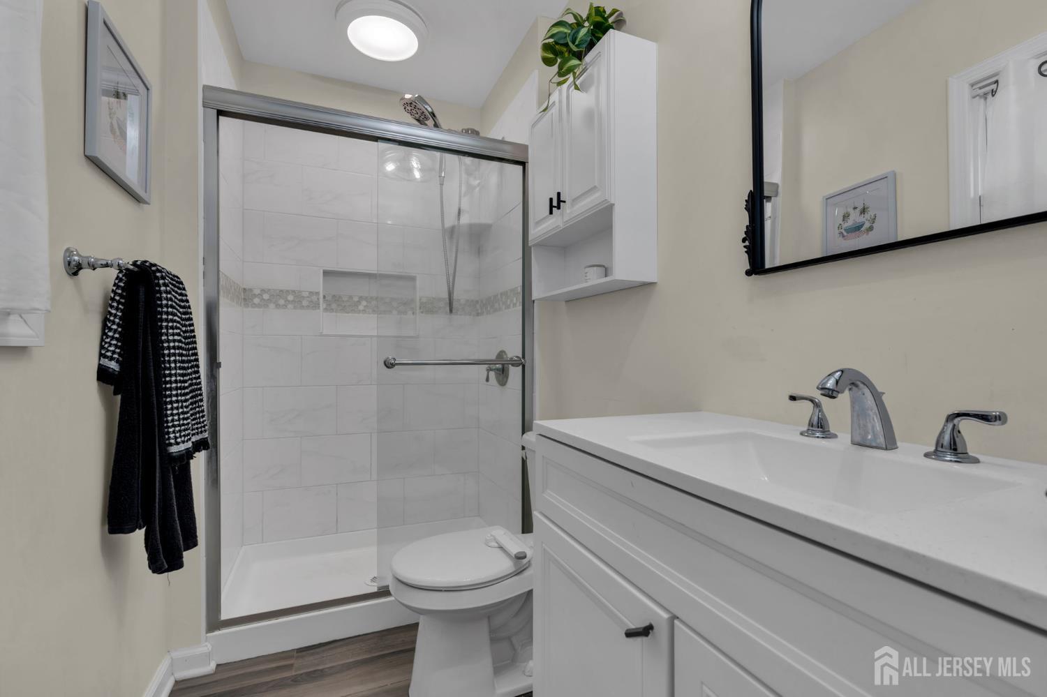 Beautiful 3BR,2 Bath Ranch located in the highly sought-after Strathmore section of Aberdeen/Matawan. Move right into this beautifully maintained and thoughtfully updated home. The spacious kitchen features quartz countertops/S appliances, & ample cabinetry. The large living and dining areas are ideal for entertaining. Vinyl plank flooring runs throughout, complemented by radiant heated floors for cozy winters. Recent upgrades provide peace of mind, including a new Timberline roof (Spring 2025) with warranty, multi-zone baseboard heating system, updated lighting fixtures, keyless entry, and a security system with exterior cameras (with ability to expand). All bedrooms feature custom closet systems, and new heating. The playroom has been updated and offers a flexible space for a den, office, or additional living area. Exterior includes professionally landscaped grounds with paver patio & a large fenced in yard perfect for relaxing or entertaining. Enjoy the convenience of the newly renovated Northland Park located at the end of the street. Commuters will love the proximity to trains and buses to NYC, major highways, shopping, and Jersey Shore beaches. A true move-in ready home in an unbeatable location!