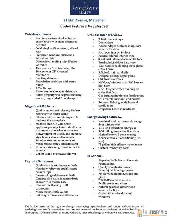 Stunning new construction in one of Metuchen's most desirable neighborhoods! Welcome to 31 Elm Avenue, a beautifully crafted custom Colonial offering luxury finishes, thoughtful design, and modern comfort throughout. The heart of the home is a gourmet chef's kitchen featuring self-closing cabinetry, a spacious center island, Silestone countertops, designer tile backsplash, and a premium GE Caf Series stainless steel appliance package including a slide-in gas range, dishwasher, microwave drawer, and chimney-style hood vented to the exterior. A flexible floor plan includes a first-floor bedroom with a private en-suite bath, perfect for guests, extended family, or a private home office. Elegant details continue throughout with hardwood flooring, 9-foot ceilings, crown molding, and a gas fireplace with marble surround creating a warm and inviting family room. Additional highlights include beautifully appointed bathrooms with Silestone countertops and ceramic tile, a one-car garage, blacktop driveway, paver walkway, and professionally landscaped grounds. Energy-efficient features include two-zone heating and central air, R-15 wall insulation, R-38 ceiling insulation, and a 75-gallon high-efficiency water heater. A rare opportunity to own a brand-new custom home in a prime Metuchen location with exceptional craftsmanship and timeless style. Buyers still have the opportunity to select most finishes and personalize the home to match their style. Contact me today for more information, questions, or to schedule a private showing!