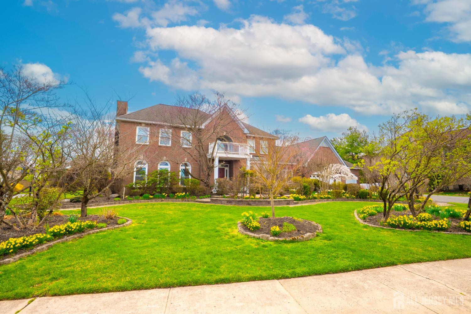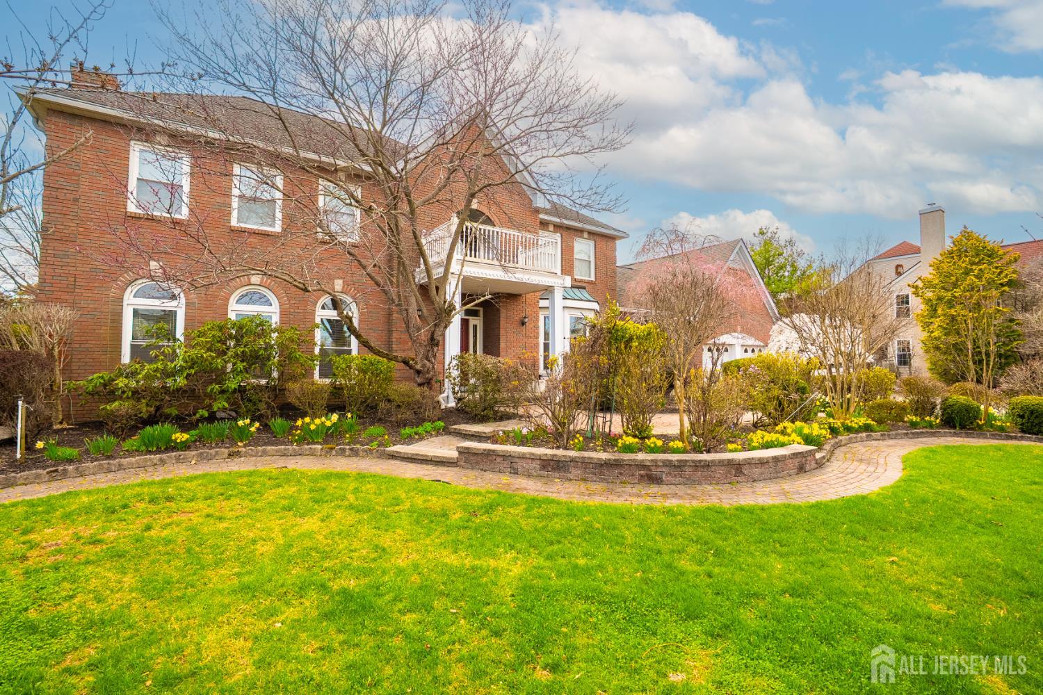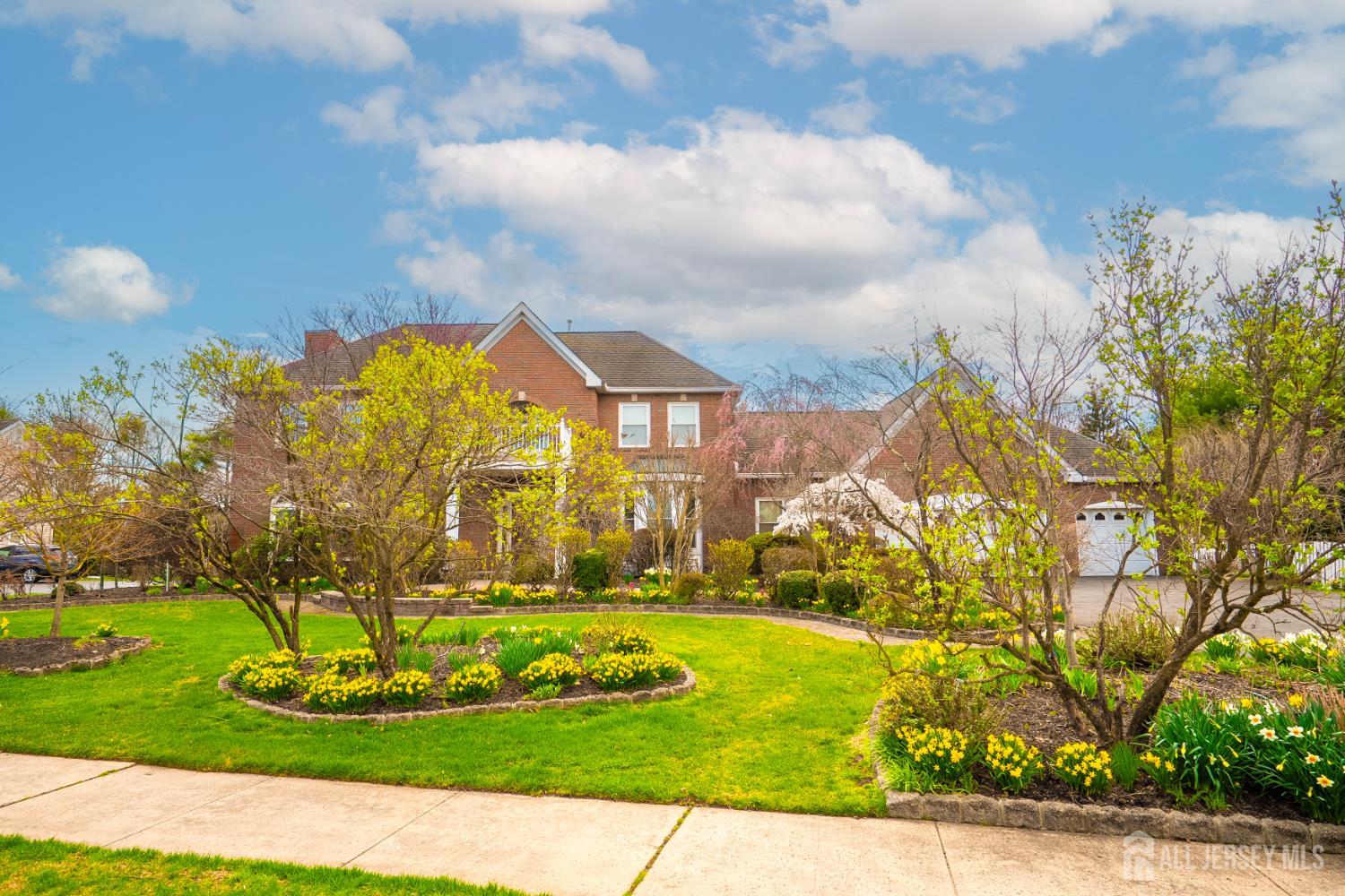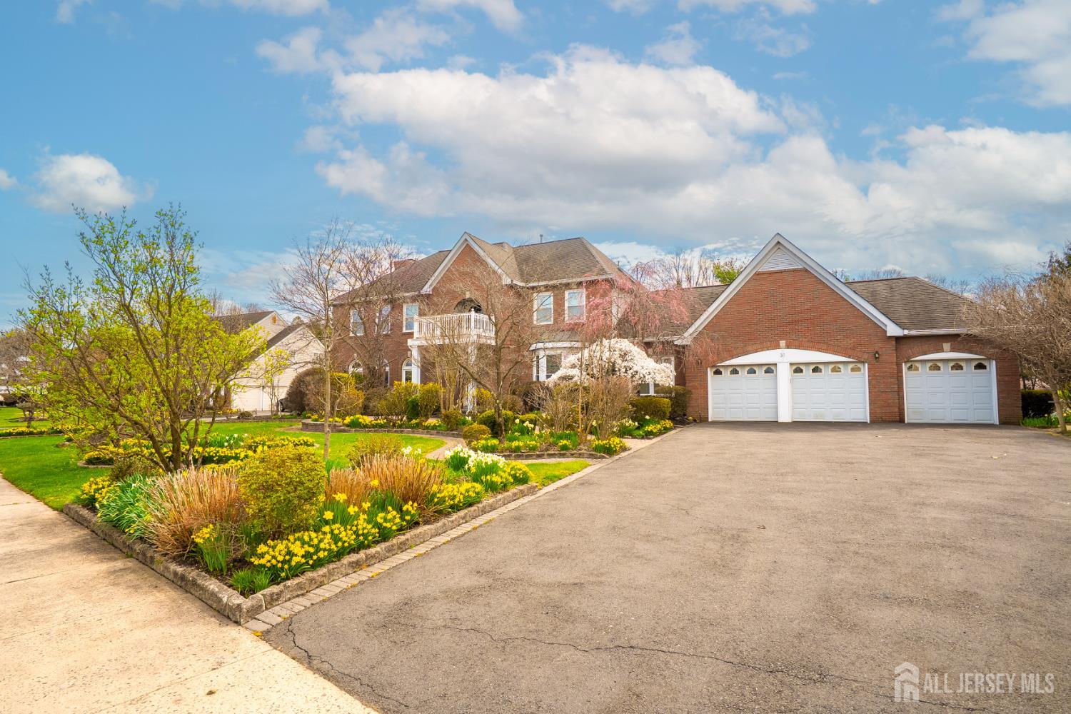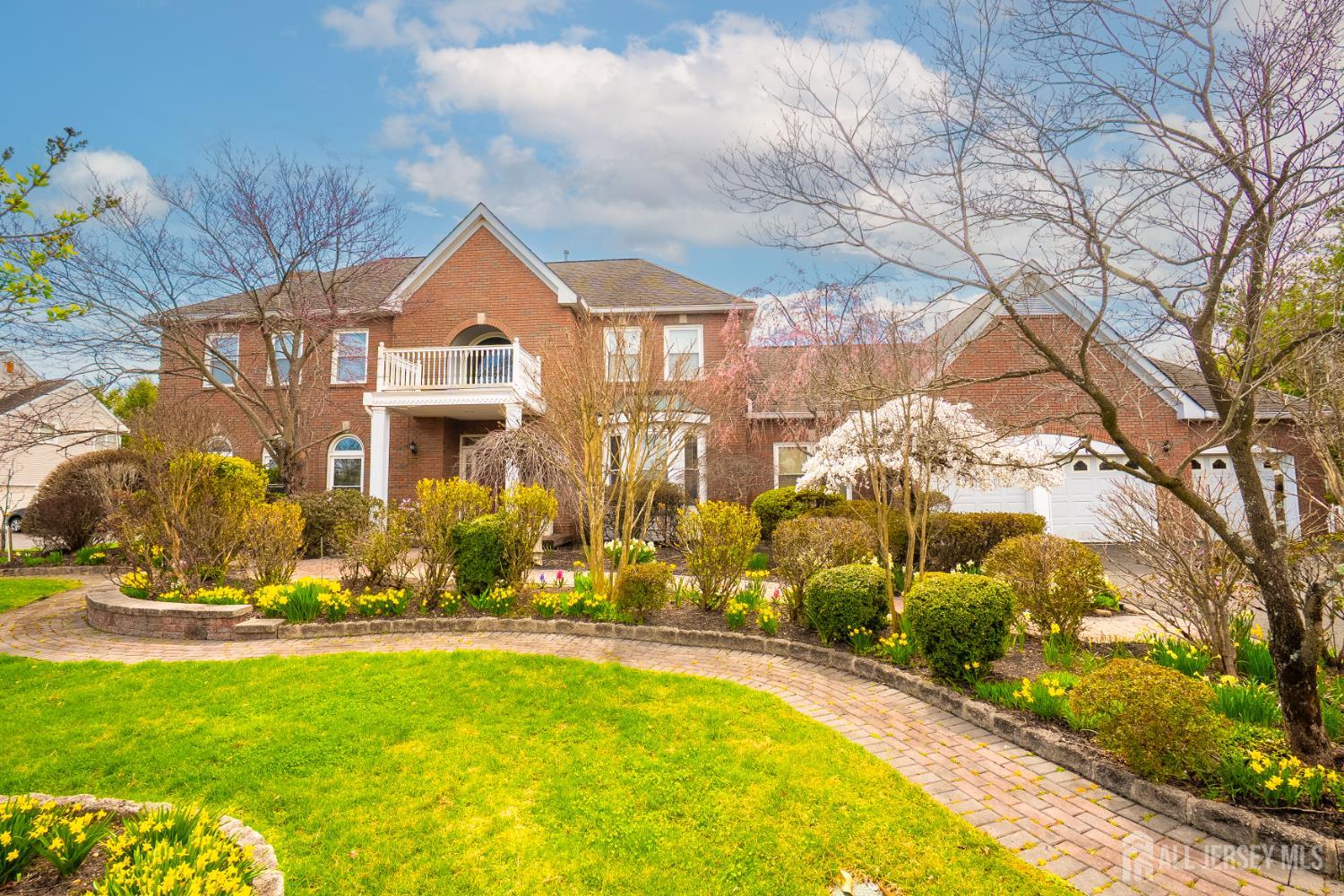 Welcome to this beautifully appointed 5-bedroom, 3.5-bath home in the desirable Windsor Park Estates of Princeton Junction, where elegant upgrades and thoughtful details shine throughout including an additional rear staircase. A two-story foyer with a beveled glass entry door and side lites. A sparkling crystal chandelier sets the tone, opening to main-level cherry hardwood floors and a graceful step-down family room with fireplace. The gourmet kitchen impresses with granite flooring, quartz countertops and island, custom self-close cabinetry, a five-burner stove, double dishwasher, butler's pantry, stainless steel refrigerator, custom tile backsplash, and both under-cabinet and pendant lighting. The first floor offers a private bedroom with a beautifully updated full bath, along with a powder room featuring ceramic tile. Upstairs, four bedrooms feature ceiling fans and custom lighting, while the renovated hall bath boasts floor-to-ceiling tile, double sinks, updated faucets, and ceramic flooring. The luxurious primary suite includes a tray ceiling, two large closets, and a spa-like bath with a floor-to-ceiling shower and jetted soaking tub. A convenient second-floor laundry room includes a laundry tub. The finished basement is perfect for entertaining with Pergo floors, recessed lighting, game room, and media room with marble-inlaid built-ins. Outdoor living is equally impressive with a 40' x 20' brick paver patio with retaining walls, lush landscaping, and a 12-zone sprinkler system. Additional highlights include a 1.5-year-old roof, two-car garage with keypads and new opener, garage motion detectors, and abundant recessed lighting throughout the living spaces. This exceptional home blends luxurious finishes and modern updates for a move-in-ready lifestyle in a premier Princeton Junction location.