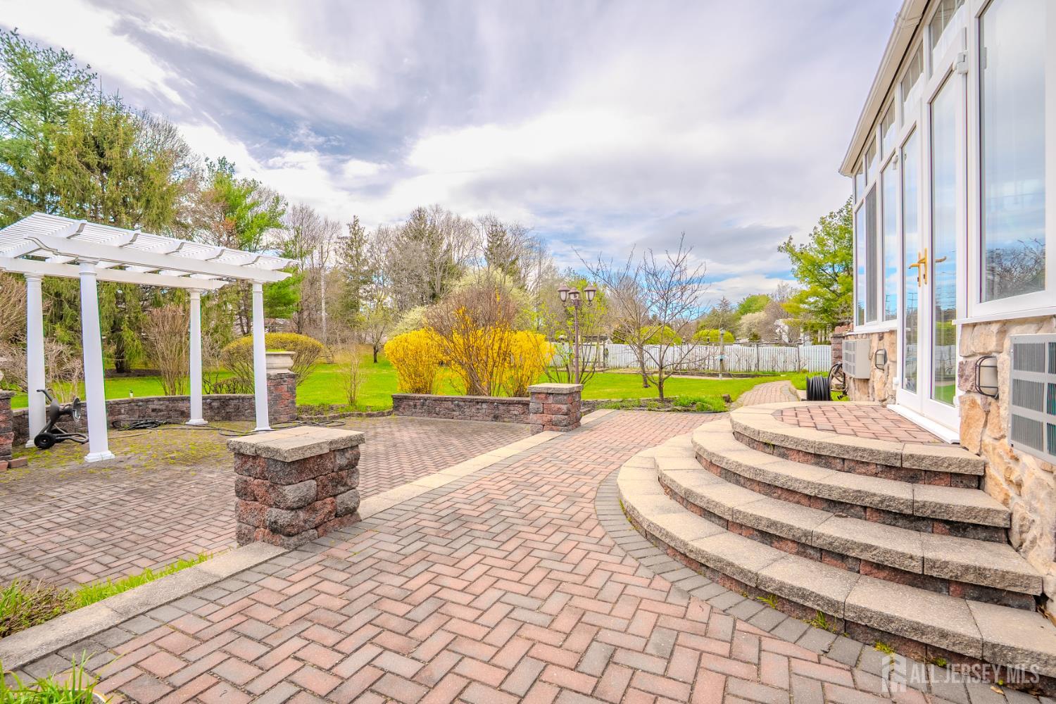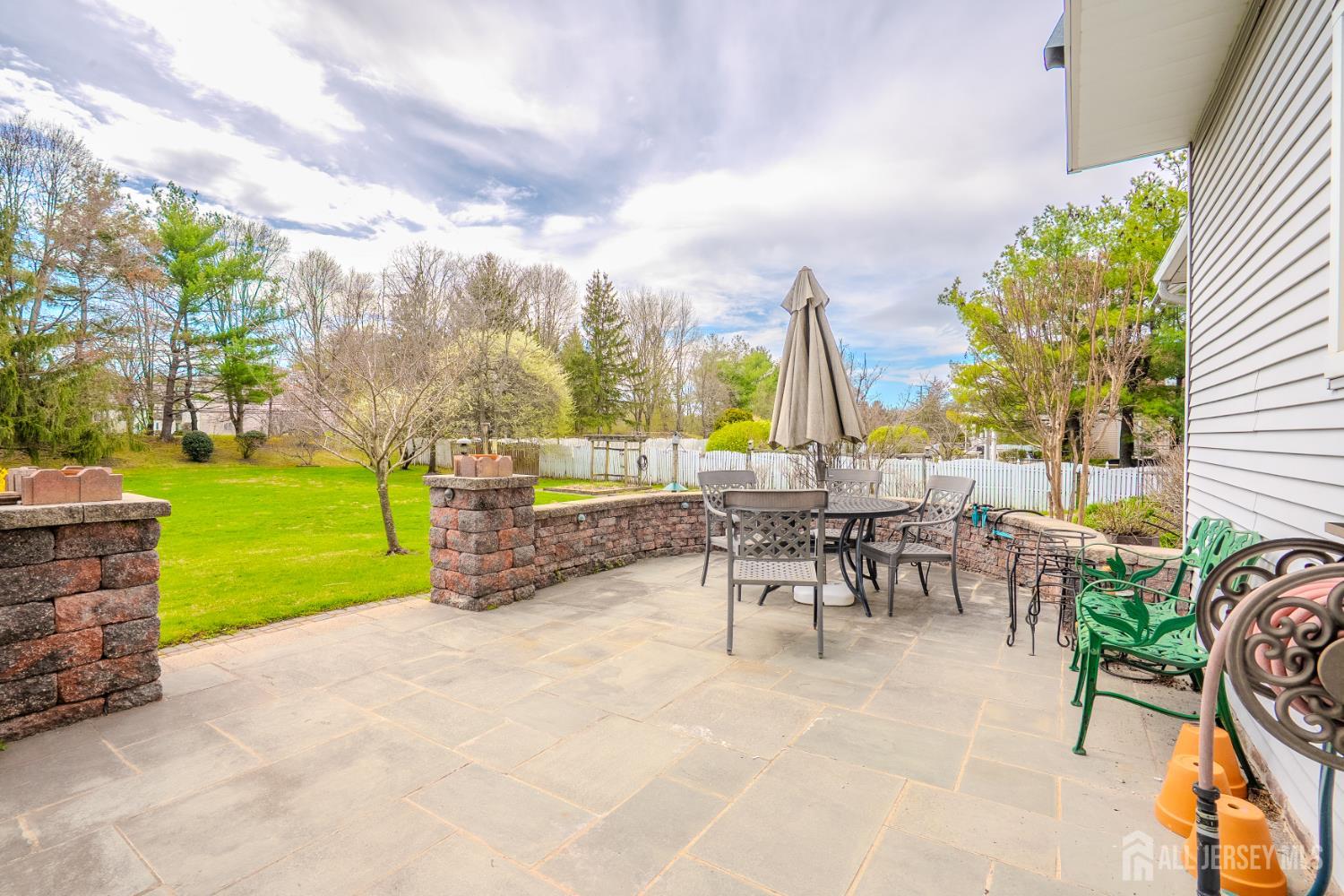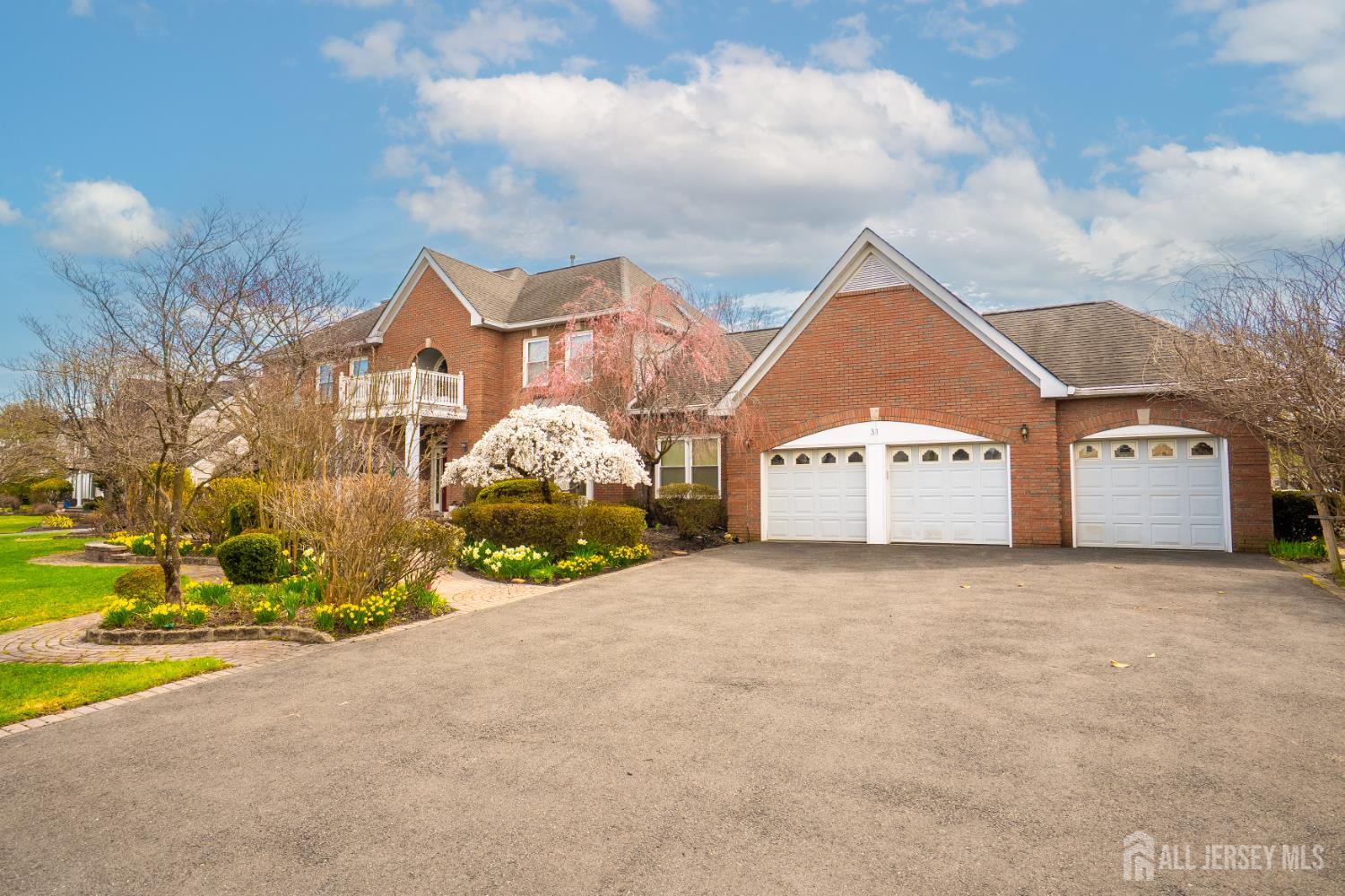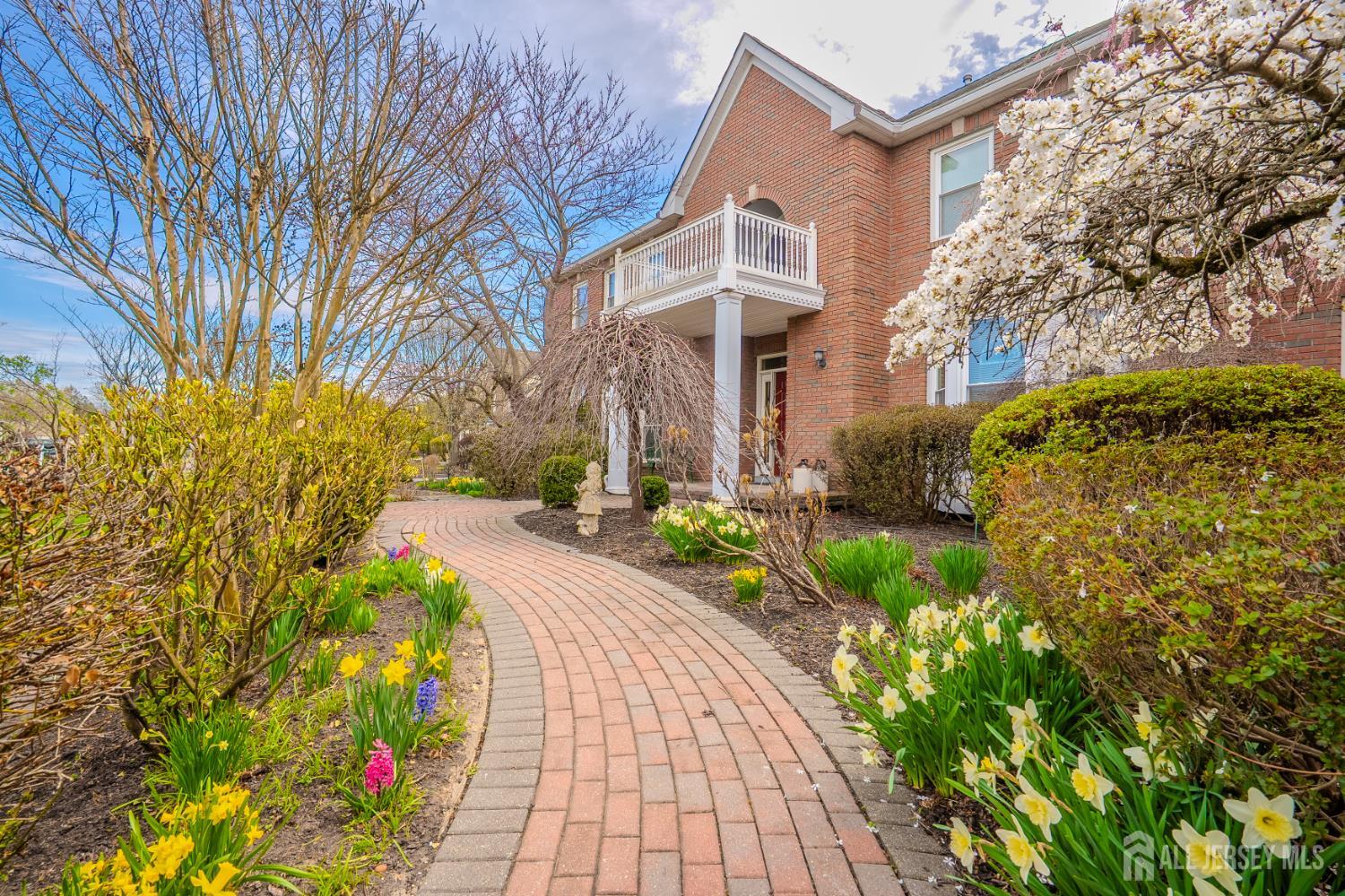 Welcome to this beautifully appointed 5-bedroom, 3.5-bath home in the desirable Windsor Park Estates of Princeton Junction, where elegant upgrades and thoughtful details shine throughout including an additional rear staircase. A two-story foyer with a beveled glass entry door and side lites. A sparkling crystal chandelier sets the tone, opening to main-level cherry hardwood floors and a graceful step-down family room with fireplace. The gourmet kitchen impresses with granite flooring, quartz countertops and island, custom self-close cabinetry, a five-burner stove, double dishwasher, butler's pantry, stainless steel refrigerator, custom tile backsplash, and both under-cabinet and pendant lighting. The first floor offers a private bedroom with a beautifully updated full bath, along with a powder room featuring ceramic tile. Upstairs, four bedrooms feature ceiling fans and custom lighting, while the renovated hall bath boasts floor-to-ceiling tile, double sinks, updated faucets, and ceramic flooring. The luxurious primary suite includes a tray ceiling, two large closets, and a spa-like bath with a floor-to-ceiling shower and jetted soaking tub. A convenient second-floor laundry room includes a laundry tub. The finished basement is perfect for entertaining with Pergo floors, recessed lighting, game room, and media room with marble-inlaid built-ins. Outdoor living is equally impressive with a 40' x 20' brick paver patio with retaining walls, lush landscaping, and a 12-zone sprinkler system. Additional highlights include a 1.5-year-old roof, two-car garage with keypads and new opener, garage motion detectors, and abundant recessed lighting throughout the living spaces. This exceptional home blends luxurious finishes and modern updates for a move-in-ready lifestyle in a premier Princeton Junction location.