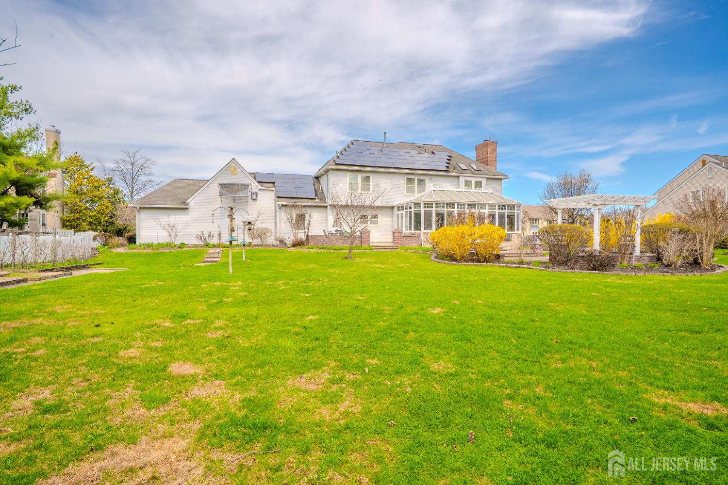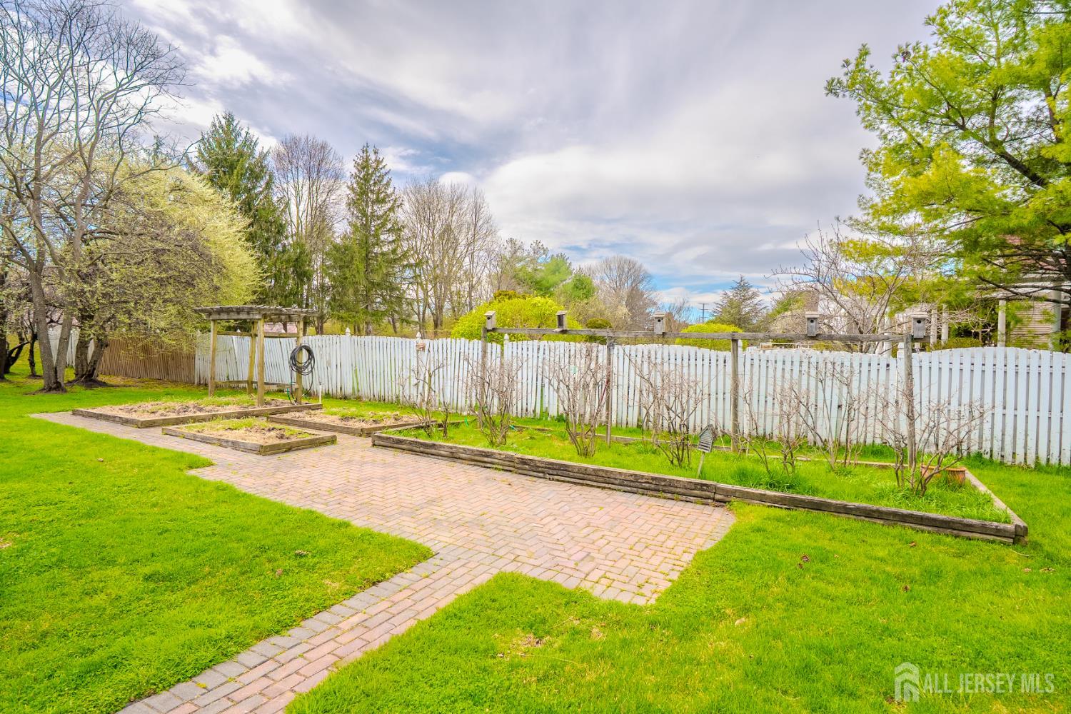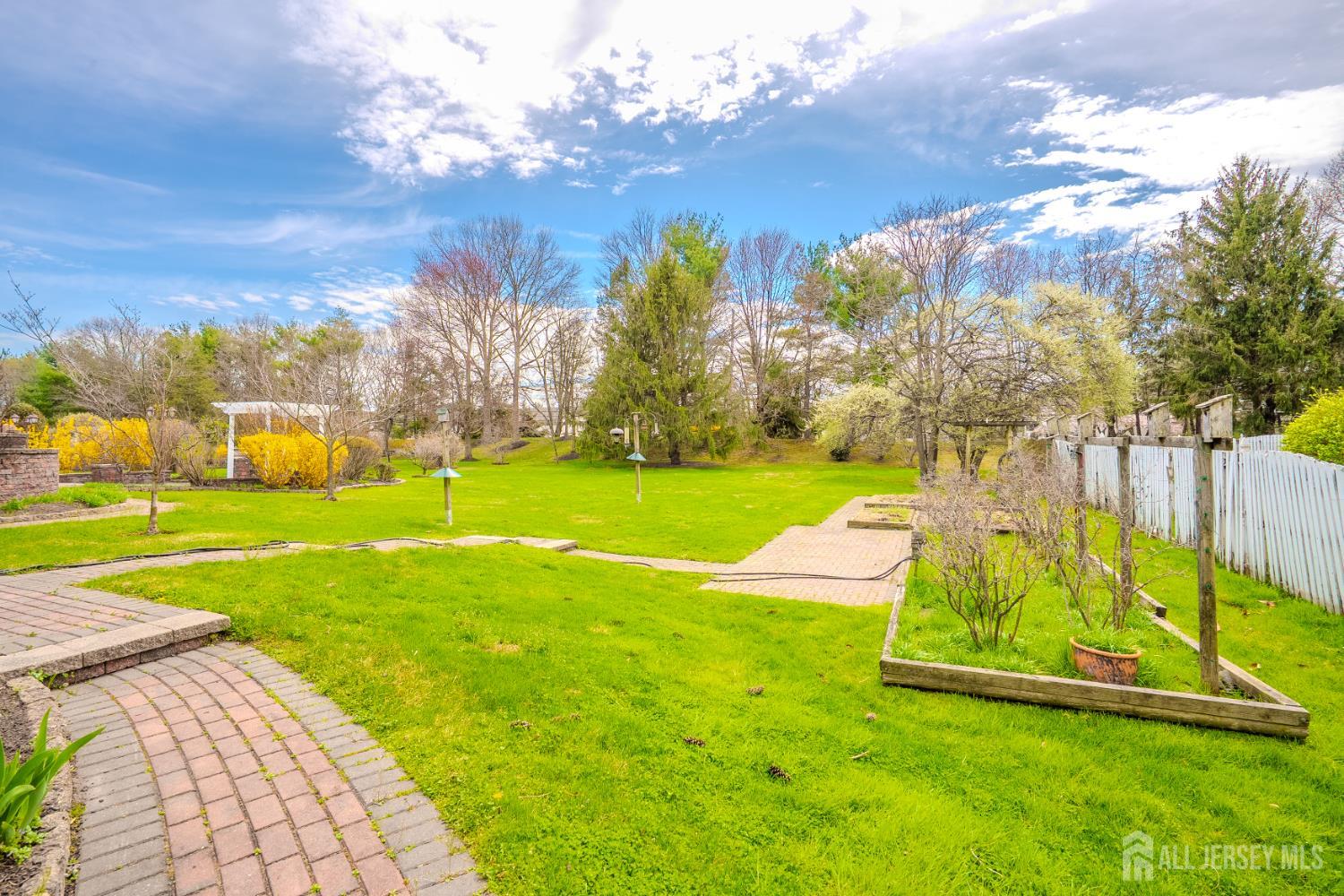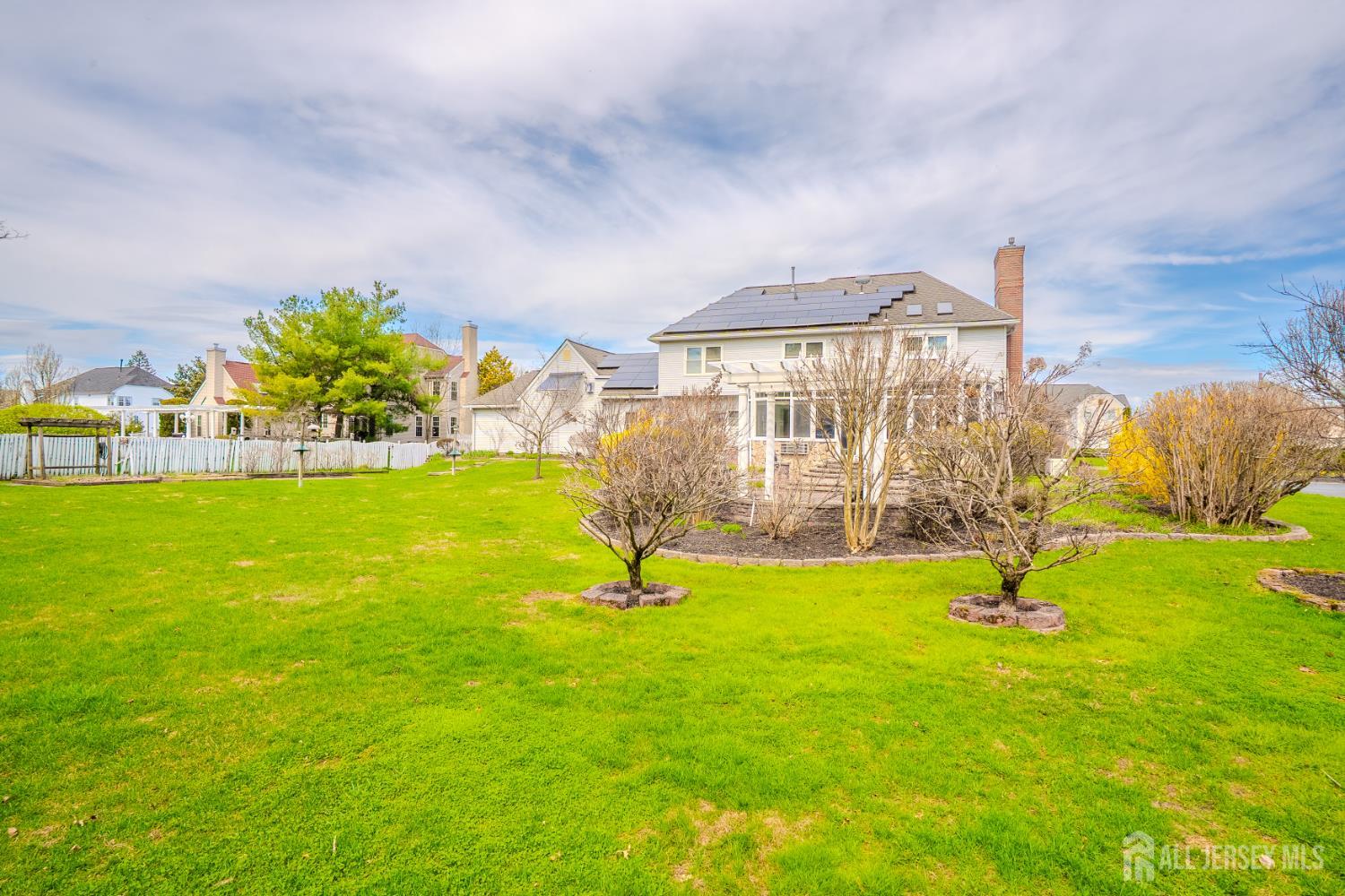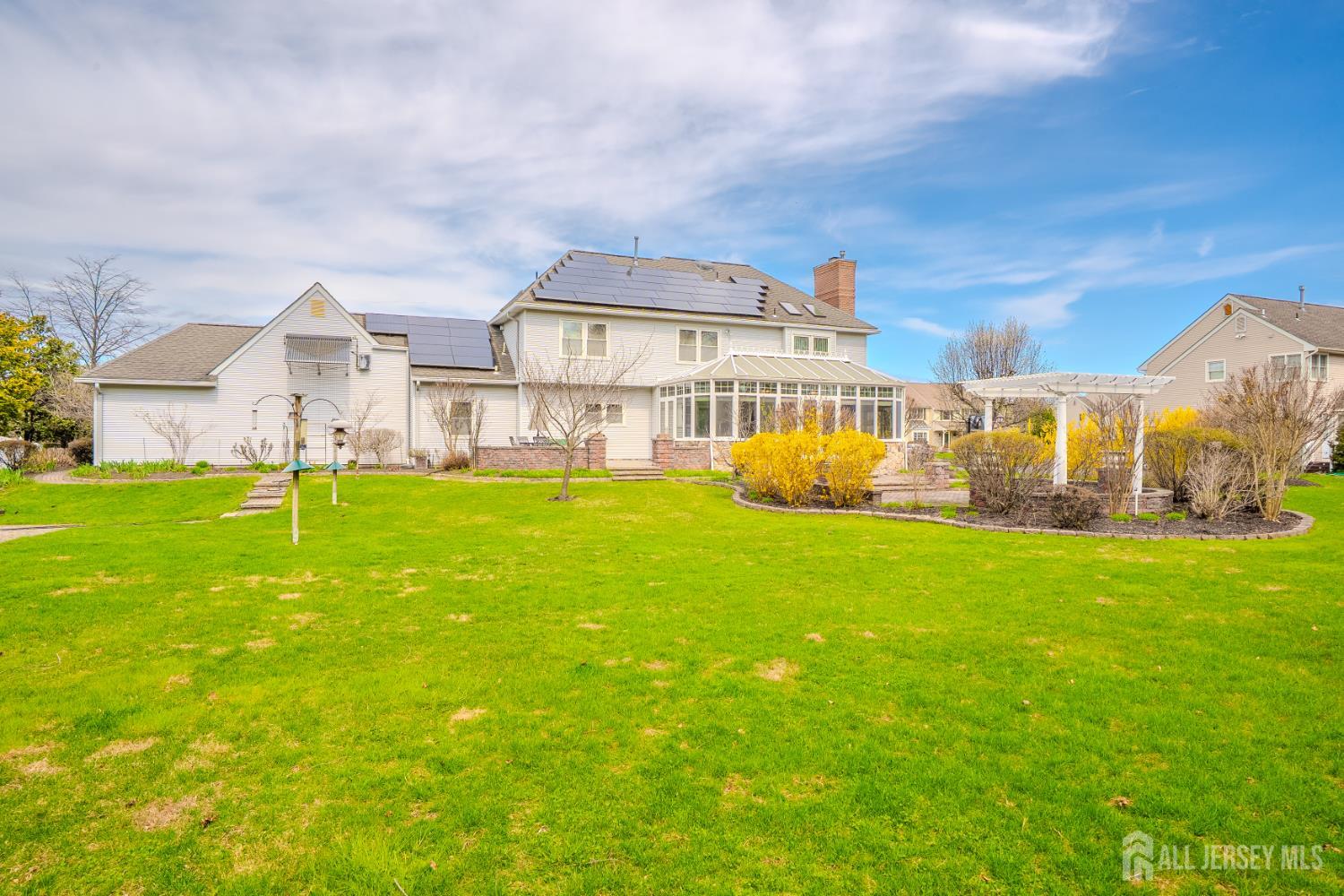 Welcome to this beautifully appointed 5-bedroom, 3.5-bath home in the desirable Windsor Park Estates of Princeton Junction, where elegant upgrades and thoughtful details shine throughout including an additional rear staircase. A two-story foyer with a beveled glass entry door and side lites. A sparkling crystal chandelier sets the tone, opening to main-level cherry hardwood floors and a graceful step-down family room with fireplace. The gourmet kitchen impresses with granite flooring, quartz countertops and island, custom self-close cabinetry, a five-burner stove, double dishwasher, butler's pantry, stainless steel refrigerator, custom tile backsplash, and both under-cabinet and pendant lighting. The first floor offers a private bedroom with a beautifully updated full bath, along with a powder room featuring ceramic tile. Upstairs, four bedrooms feature ceiling fans and custom lighting, while the renovated hall bath boasts floor-to-ceiling tile, double sinks, updated faucets, and ceramic flooring. The luxurious primary suite includes a tray ceiling, two large closets, and a spa-like bath with a floor-to-ceiling shower and jetted soaking tub. A convenient second-floor laundry room includes a laundry tub. The finished basement is perfect for entertaining with Pergo floors, recessed lighting, game room, and media room with marble-inlaid built-ins. Outdoor living is equally impressive with a 40' x 20' brick paver patio with retaining walls, lush landscaping, and a 12-zone sprinkler system. Additional highlights include a 1.5-year-old roof, two-car garage with keypads and new opener, garage motion detectors, and abundant recessed lighting throughout the living spaces. This exceptional home blends luxurious finishes and modern updates for a move-in-ready lifestyle in a premier Princeton Junction location.