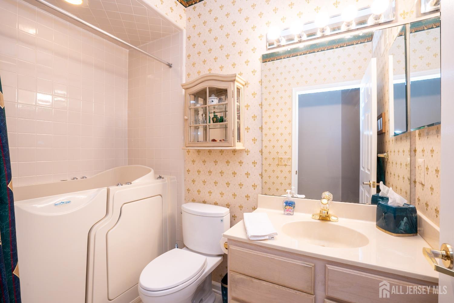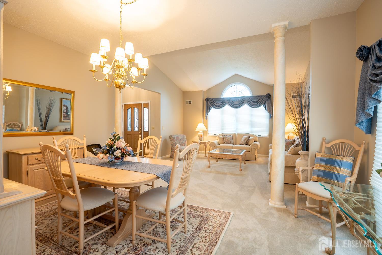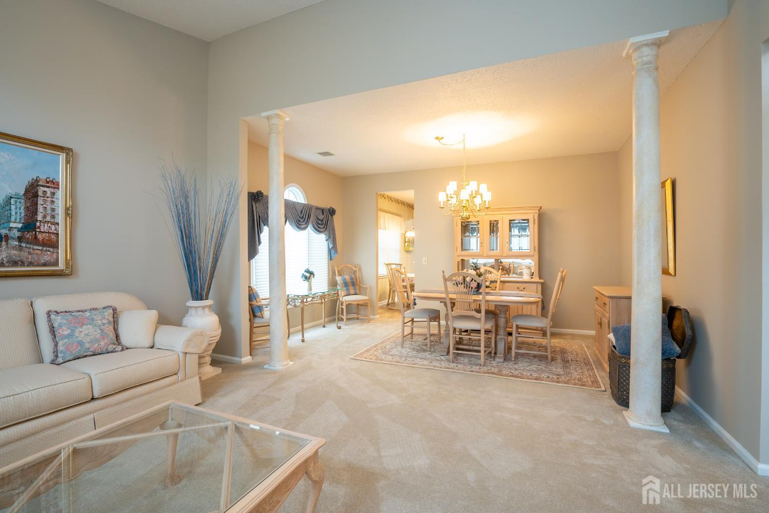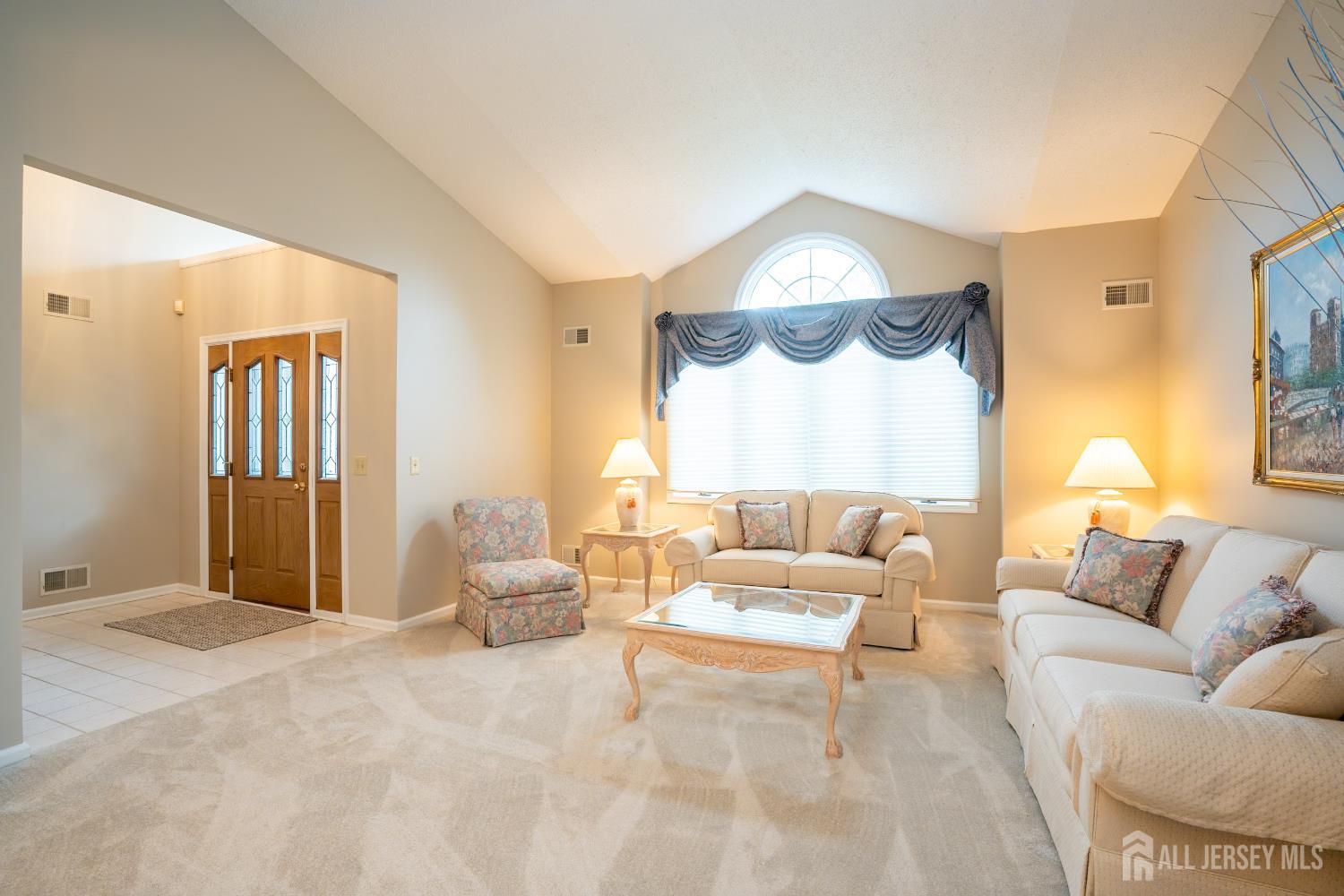Welcome to 4 Aberdeen Way, a distinguished residence nestled within the vibrant Greenbriar Whittingham adult community in Monroe Township. This elegantly designed home boasts three bedrooms and three full baths, providing an exquisite blend of space and style for those seeking a serene lifestyle. Upon entering, you are greeted by a tiled foyer and lofty ceilings that enhance the brightness of this completely Freshly Painted home. New Carpeting sets a welcoming tone throughout, inviting you to explore further. The living and dining room area is a masterpiece of design, featuring architectural columns and a vaulted ceiling, all illuminated by a magnificent palladium window that floods the space with natural light. The chef's eat-in kitchen is a central highlight, equipped with modern wood cabinetry, creating a stylish space for culinary pursuits and entertaining. The adjoining family room, adorned with new carpeting and paint, opens to a charming paver patio for outdoor enjoyment. The spacious primary bedroom suite serves as a personal sanctuary, offering ample closet space and an en suite bathroom complete with a double sink vanity, soaking tub, and stall shower. Another versatile downstairs room can function as a second bedroom or a home office. Upstairs, a loft and an additional bedroom with a full bath provide an ideal guest quarters, along with a large storage closet for convenience. Residing in Greenbriar Whittingham offers access to premium amenities, including nursing services, a 9-hole golf course, a clubhouse with a billiard room, and a fitness center. A restaurant, indoor and outdoor pools, various sports courts, and engaging social events enrich community living. Enjoy peace of mind with 24-hour security and easy transportation to shopping and commuter stations in this sought-after locale.