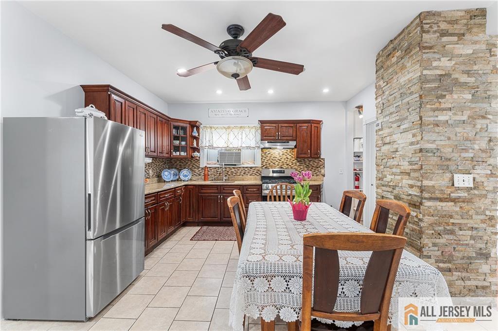Rare mother/daughter opportunity ideal for multi-generational living, offering space, privacy, and thoughtful updates throughout. Lovingly owned and meticulously maintained, this home features a desirable mother/daughter layout with a second kitchen and separate entrances, providing flexibility for extended living arrangements. The main level offers laminate flooring, a large living room, and a spacious eat-in kitchen with cherry cabinets, stainless steel appliances and tiled flooring. Additional highlights include a generously sized bedroom, full bathroom, bonus room, and an enclosed front porch, creating a bright, functional living space. The second floor includes laminate flooring, an eat-in kitchen, three well-proportioned bedrooms with ceiling fans and full closets, a full bathroom, and a private entrance, ideal for multi-generational living or guest use. Additional features include a separate entrance to the basement, which offers a full bathroom, multiple rooms, and existing plumbing for future possibilities. Outside, enjoy a large driveway that can accommodate multiple vehicles or work trucks. Multiple garage areas provide excellent storage for all your needs. The expansive paver patio offers flexibility for additional parking or can be transformed into a backyard oasis with plenty of space for seating and entertaining. This home also features a newer roof and a beautiful garden with apple, pear, and fig trees, along with grapevines, creating a unique and inviting outdoor setting. Conveniently located just blocks from bus transportation and close to major roads, shopping, dining, and more, this home offers both comfort and accessibility.