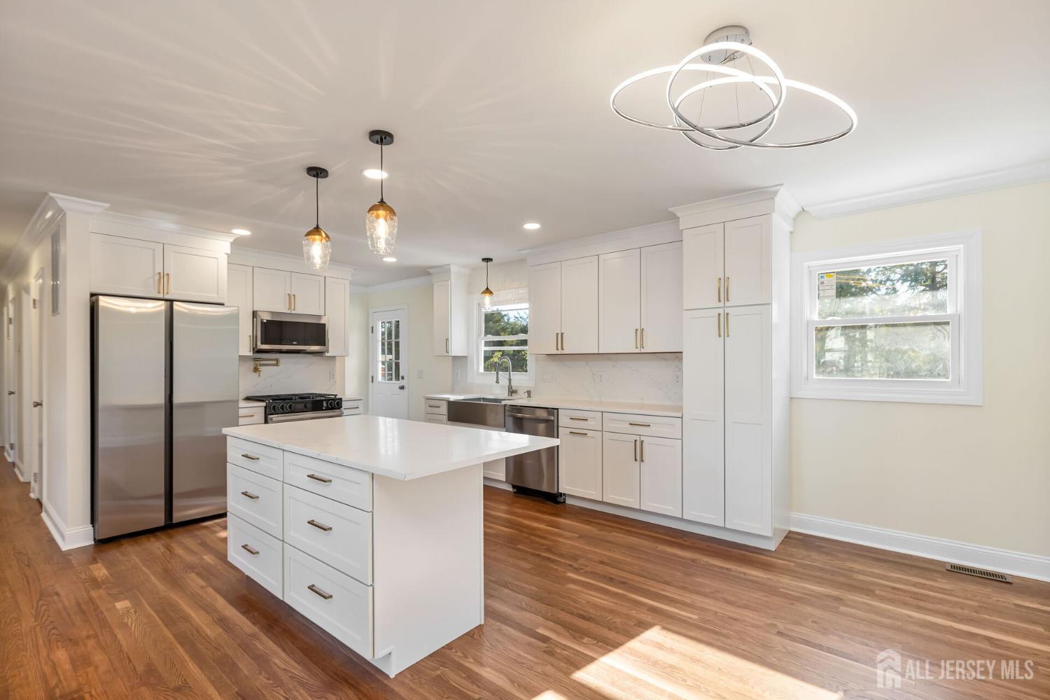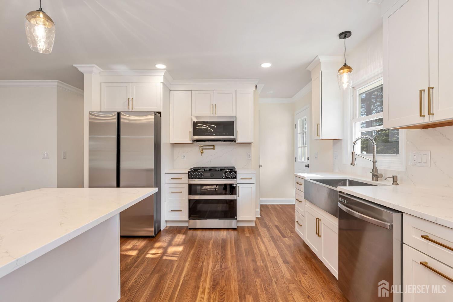 Located on a Quiet Dead-end Street with a country setting vibe, this five-bedroom, three full bathrooms Spectacular Home was Exquisite Fully Renovated from top to bottom. This exceptional home offers a blend of luxury, comfort, and convenience. Every detail has been thoughtfully curated with high-end finishes & modern elegance. Custom gourmet kitchen with quartz countertop, center island, new high-end appliances, stainless steel farm sink, Samsung gas convection double oven with air fryer, pot filler and built in microwave. Continuous flow of hot water gas hot water heater. Recessed LED lighting. All 3 bathrooms feature custom tile design and Noan low profile ultra quiet exhaust fans. Primary bedroom has a full bath and Toto Washlet. Living room has an electric fireplace with heat. Finished basement has luxury flooring and features an office with French doors, family room, exercise room and custom designed laundry room with cabinets, and separate entrance. New water treatment system. Custom paver patio front and back. New driveway. This home has easy access for parks, and the scenic Canal tow path. Convenient to major highways, Route 287, 95, and the Jersey Avenue/New Brunswick train station for daily commutes to NYC or Princeton NJ. Proximity to top-tier public charter and private schools, pharmaceutical & Research centers, and world-class medical hospitals. A vibrant array of shopping, dining, theaters, and recreation are just minutes away. Step into this tranquil and inviting home and make it yours.