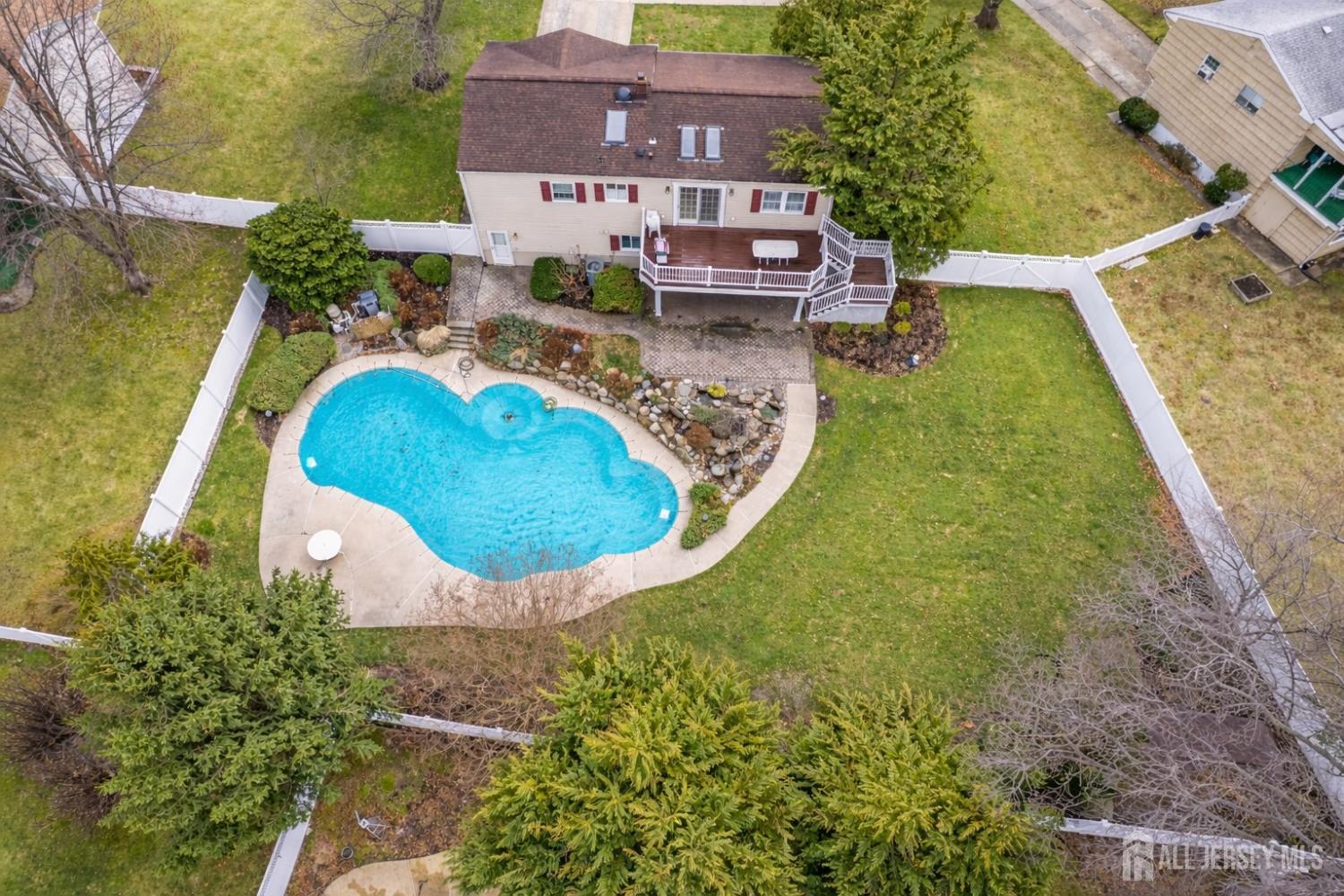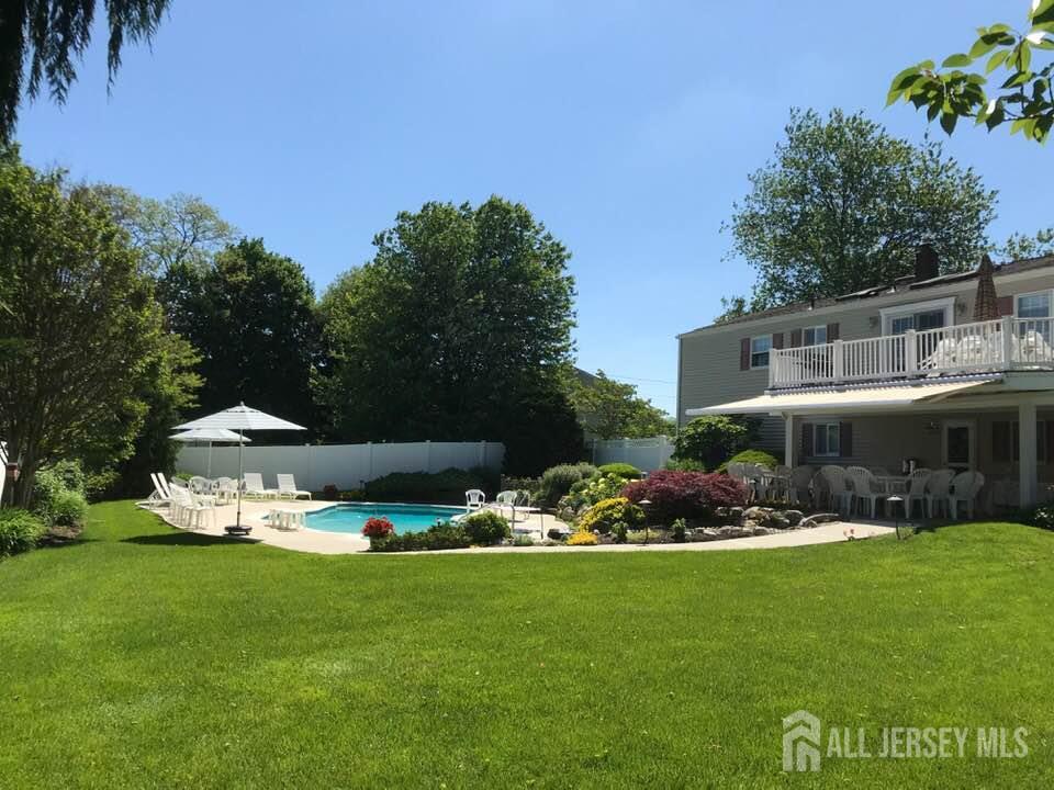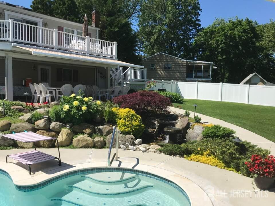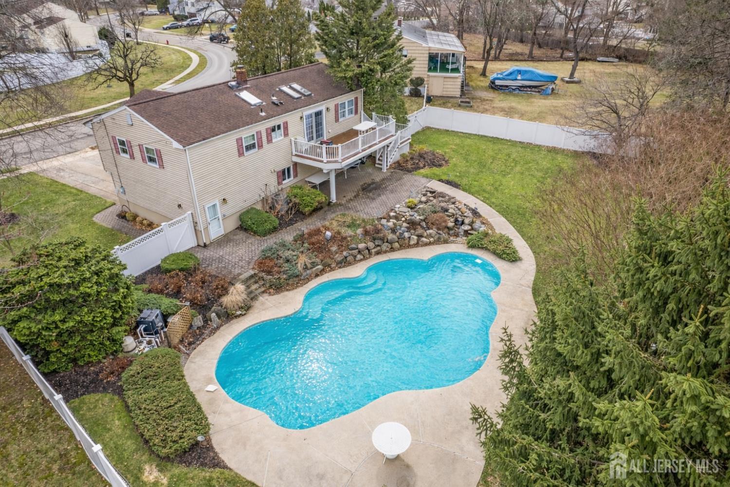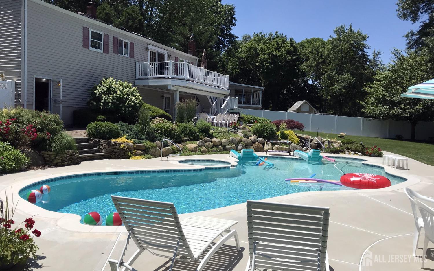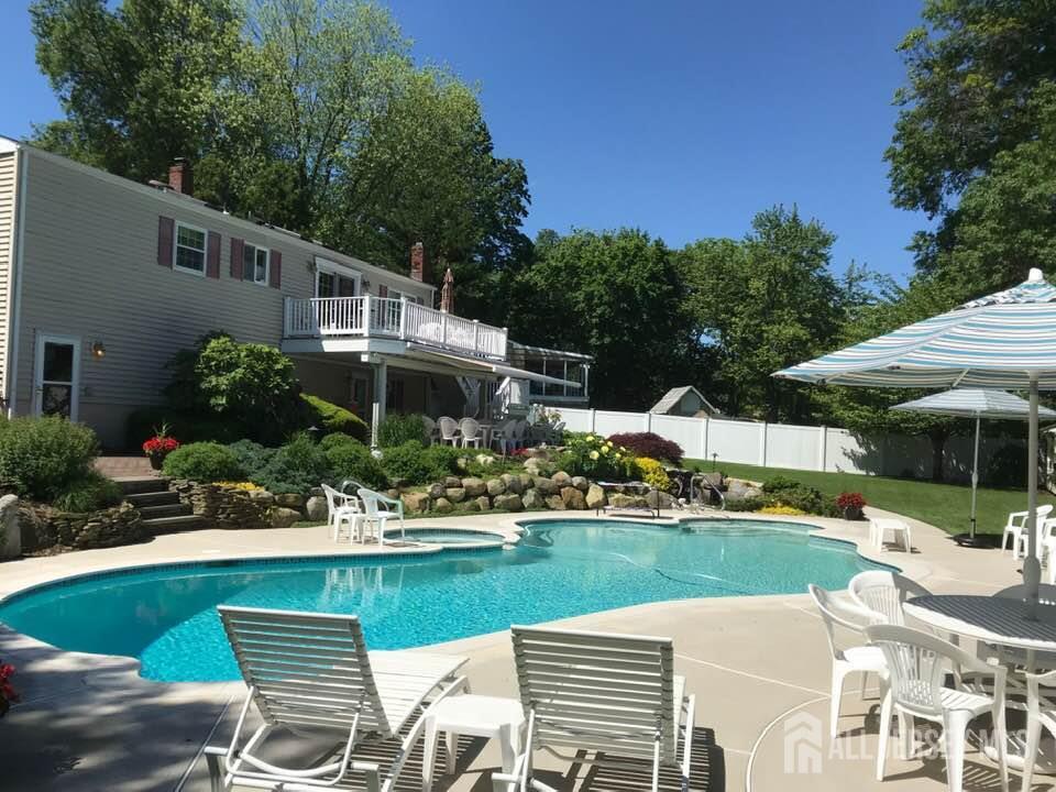 Welcome into this beautifully maintained home featuring a bright living room with large windows, recessed lighting, and elegant upgraded crown and base moldings that add architectural detail and craftsmanship. The spacious dining room provides an ideal setting for both everyday meals and entertaining, offering ample room for gatherings with family and friends. The dining area flows seamlessly into the kitchen, creating a comfortable and functional layout for hosting and daily living. The kitchen features granite countertops, stainless steel appliances, and sliders leading to a second floor composite deck overlooking the yardperfect for outdoor dining and gatherings. Motorized skylights in the kitchen and bathroom allow natural sunlight to pour into the spaces while also providing additional ventilation. The main level offers three bedrooms with generous closet space. Refinished hardwood floors throughout this level add warmth and timeless appeal. The ground level offers the potential for multi-generational living and includes a bedroom currently being used as an office with built-in cabinetry, a spacious family room with gas fireplace, full bathroom, laundry room, and convenient access to the garage and backyard. Step outside to beautifully professionally landscaped grounds featuring landscape lighting and a sprinkler system that keeps the lawn and gardens vibrant. The backyard is designed for relaxation and entertaining with a heated concrete pool and hot tub, along with an automatic pool vacuum for easy maintenance. The second floor composite deck includes a retractable awning and an under-deck drainage system that keeps the patio below dry. A paver patio provides additional space to relax or entertain. This exceptional home combines comfort, functionality, and outstanding indoor and outdoor living. Convenient access to schools and major highways.