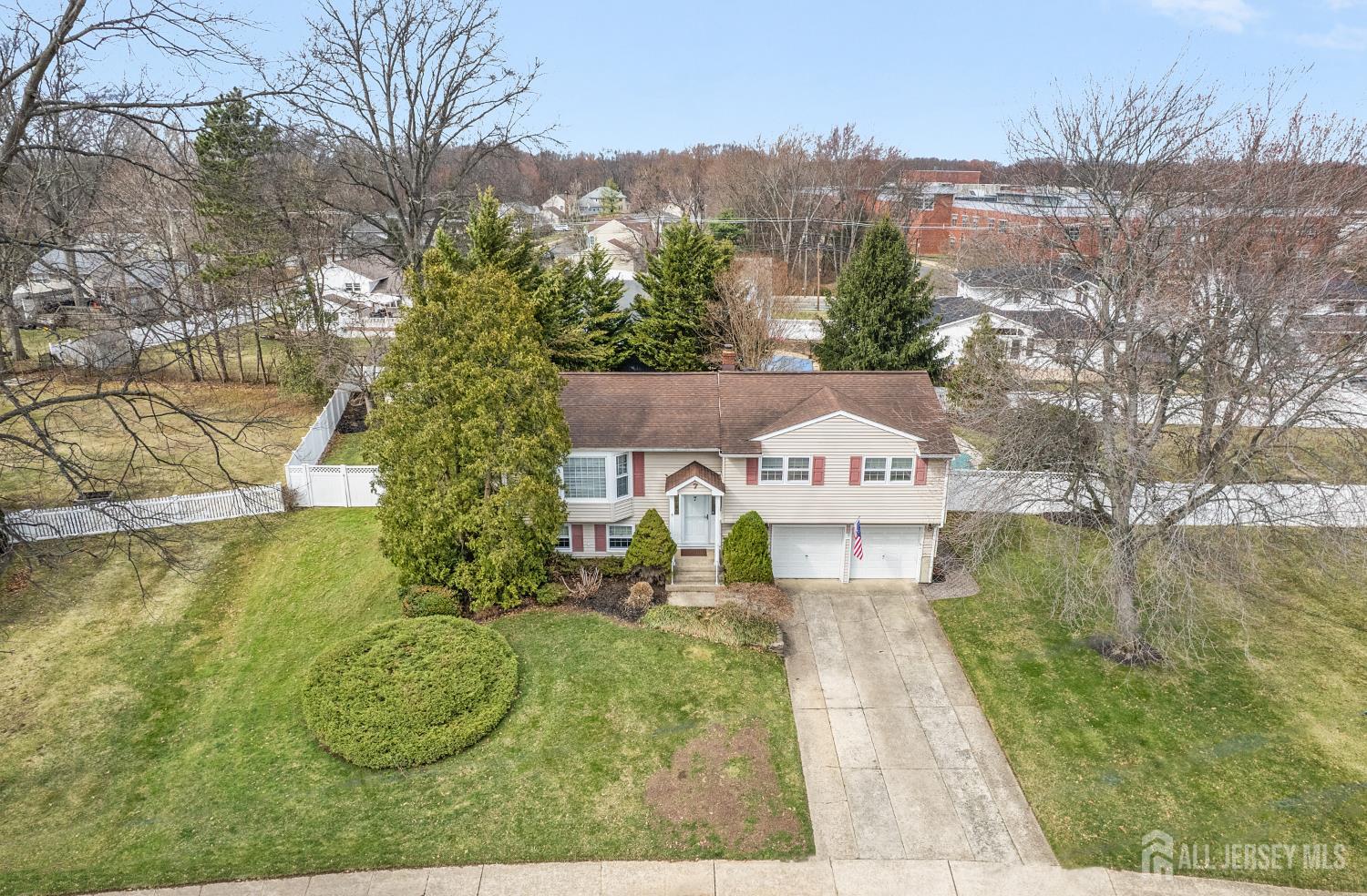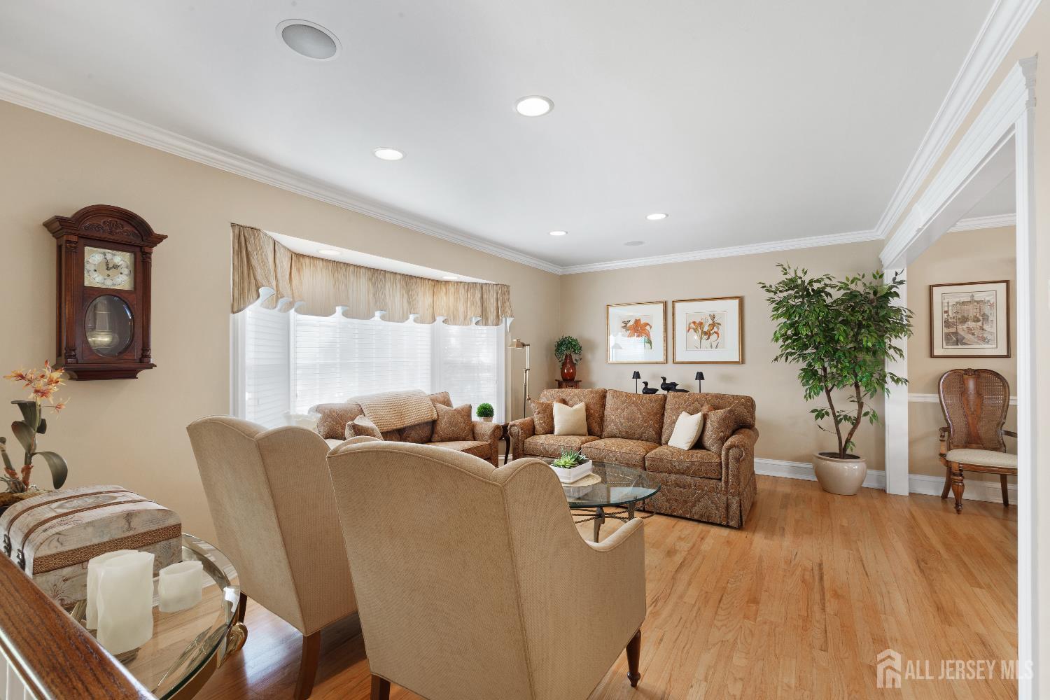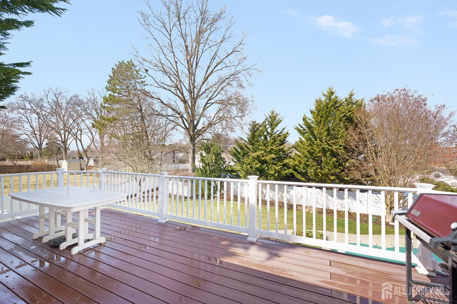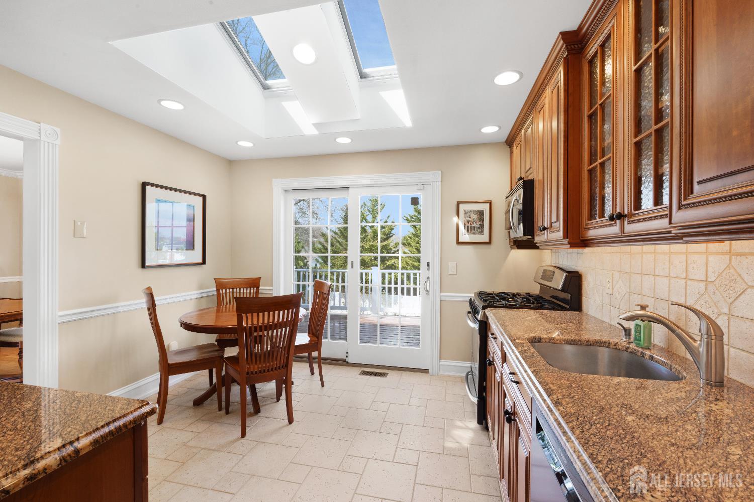 Welcome into this beautifully maintained home featuring a bright living room with large windows, recessed lighting, and elegant upgraded crown and base moldings that add architectural detail and craftsmanship. The spacious dining room provides an ideal setting for both everyday meals and entertaining, offering ample room for gatherings with family and friends. The dining area flows seamlessly into the kitchen, creating a comfortable and functional layout for hosting and daily living. The kitchen features granite countertops, stainless steel appliances, and sliders leading to a second floor composite deck overlooking the yardperfect for outdoor dining and gatherings. Motorized skylights in the kitchen and bathroom allow natural sunlight to pour into the spaces while also providing additional ventilation. The main level offers three bedrooms with generous closet space. Refinished hardwood floors throughout this level add warmth and timeless appeal. The ground level offers the potential for multi-generational living and includes a bedroom currently being used as an office with built-in cabinetry, a spacious family room with gas fireplace, full bathroom, laundry room, and convenient access to the garage and backyard. Step outside to beautifully professionally landscaped grounds featuring landscape lighting and a sprinkler system that keeps the lawn and gardens vibrant. The backyard is designed for relaxation and entertaining with a heated concrete pool and hot tub, along with an automatic pool vacuum for easy maintenance. The second floor composite deck includes a retractable awning and an under-deck drainage system that keeps the patio below dry. A paver patio provides additional space to relax or entertain. This exceptional home combines comfort, functionality, and outstanding indoor and outdoor living. Convenient access to schools and major highways.