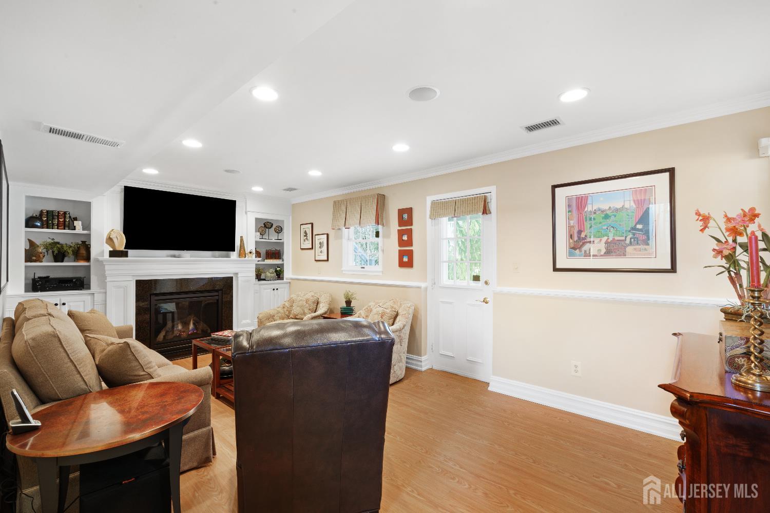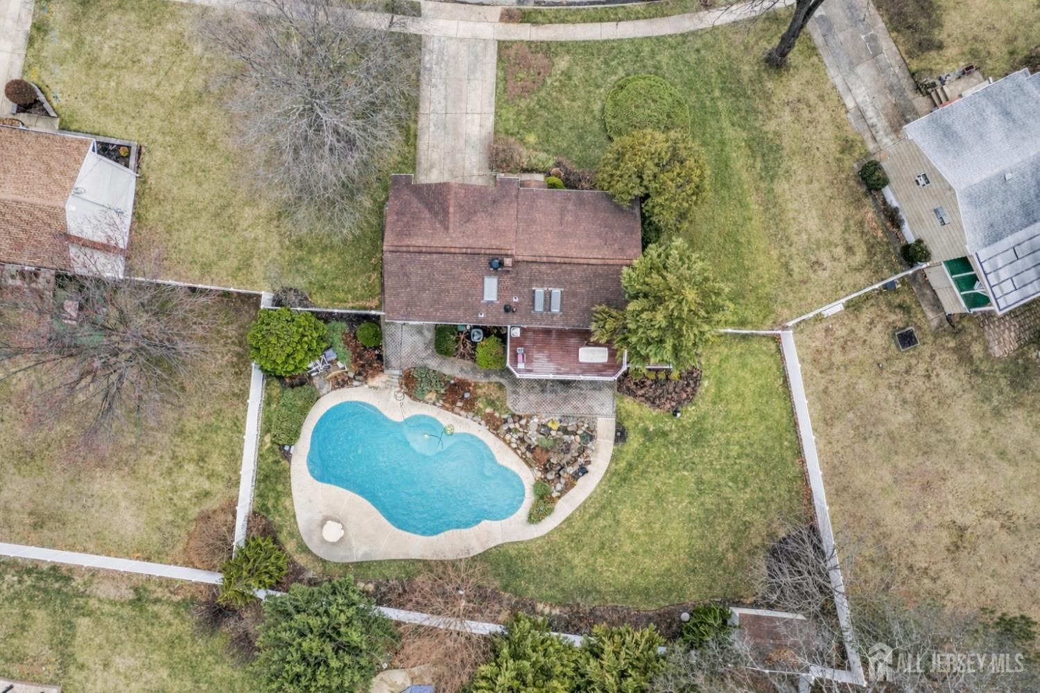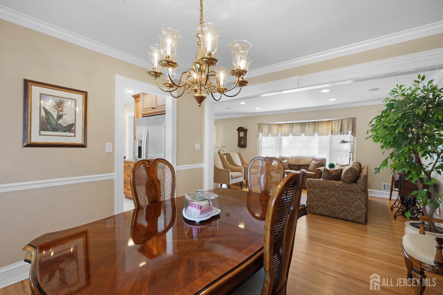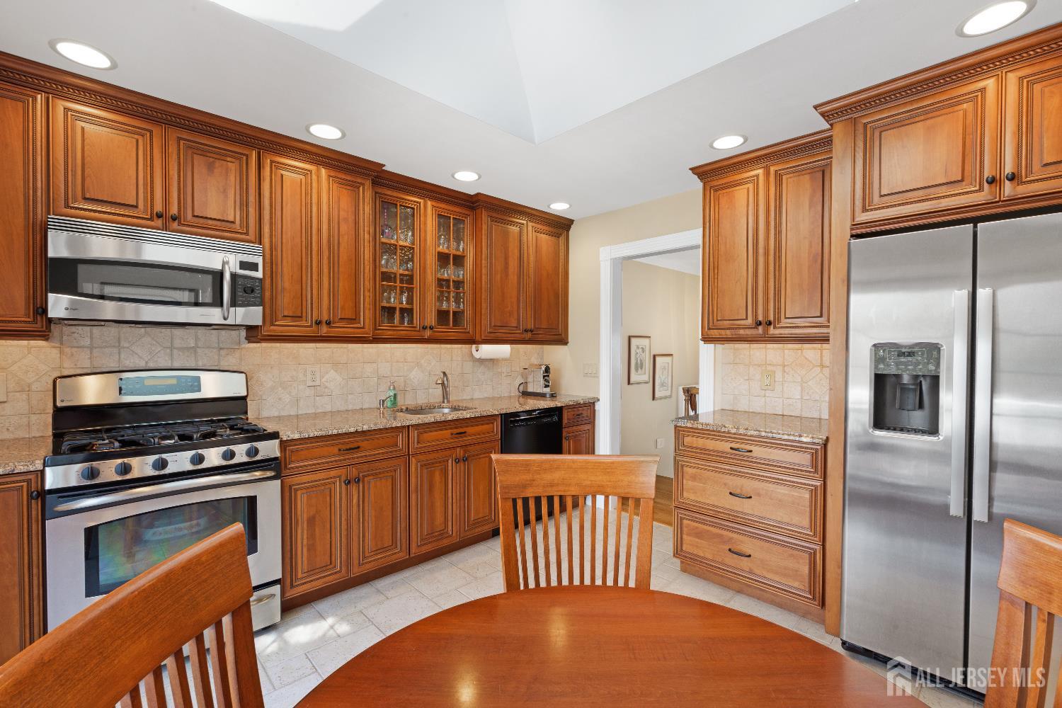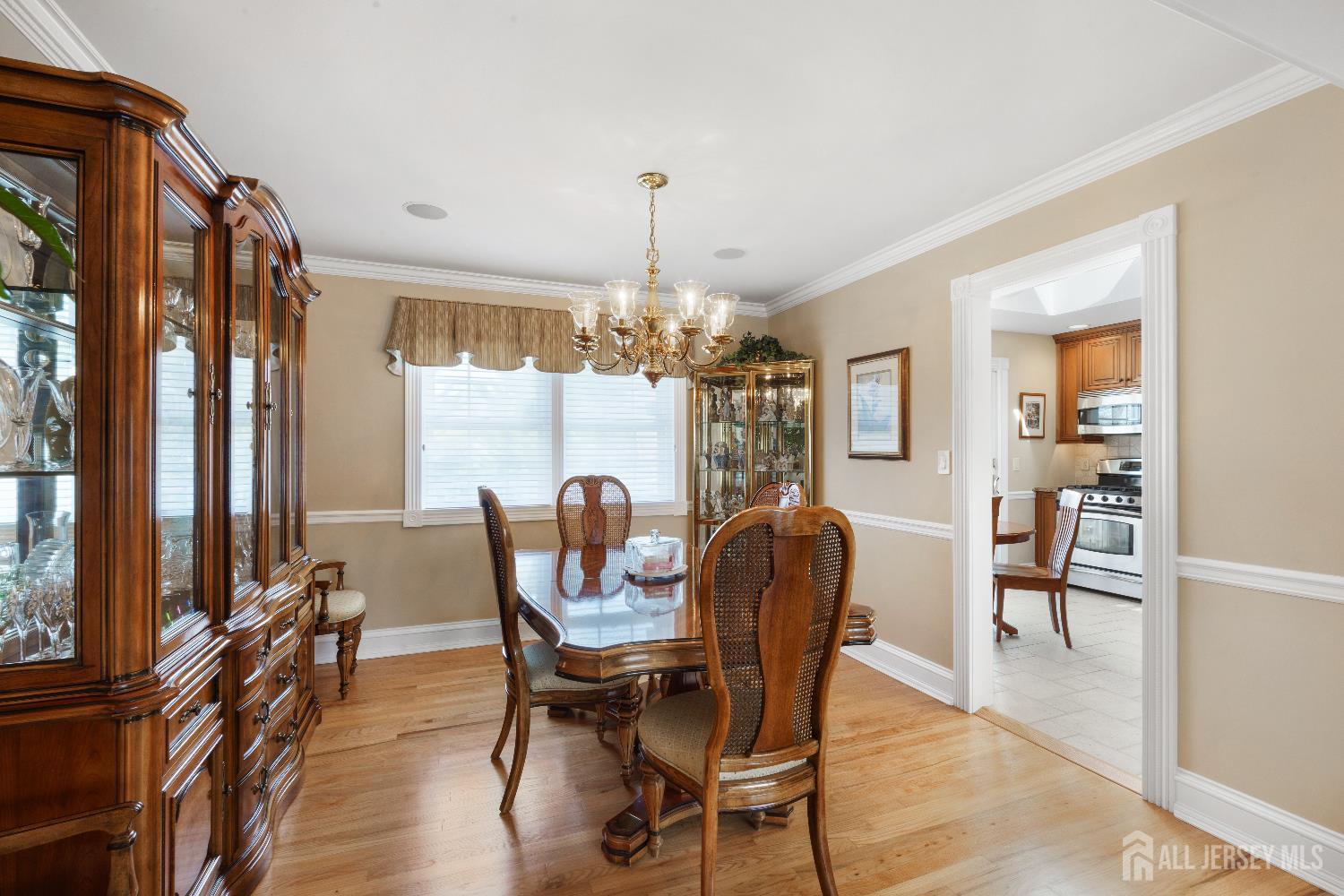 Welcome into this beautifully maintained home featuring a bright living room with large windows, recessed lighting, and elegant upgraded crown and base moldings that add architectural detail and craftsmanship. The spacious dining room provides an ideal setting for both everyday meals and entertaining, offering ample room for gatherings with family and friends. The dining area flows seamlessly into the kitchen, creating a comfortable and functional layout for hosting and daily living. The kitchen features granite countertops, stainless steel appliances, and sliders leading to a second floor composite deck overlooking the yardperfect for outdoor dining and gatherings. Motorized skylights in the kitchen and bathroom allow natural sunlight to pour into the spaces while also providing additional ventilation. The main level offers three bedrooms with generous closet space. Refinished hardwood floors throughout this level add warmth and timeless appeal. The ground level offers the potential for multi-generational living and includes a bedroom currently being used as an office with built-in cabinetry, a spacious family room with gas fireplace, full bathroom, laundry room, and convenient access to the garage and backyard. Step outside to beautifully professionally landscaped grounds featuring landscape lighting and a sprinkler system that keeps the lawn and gardens vibrant. The backyard is designed for relaxation and entertaining with a heated concrete pool and hot tub, along with an automatic pool vacuum for easy maintenance. The second floor composite deck includes a retractable awning and an under-deck drainage system that keeps the patio below dry. A paver patio provides additional space to relax or entertain. This exceptional home combines comfort, functionality, and outstanding indoor and outdoor living. Convenient access to schools and major highways.