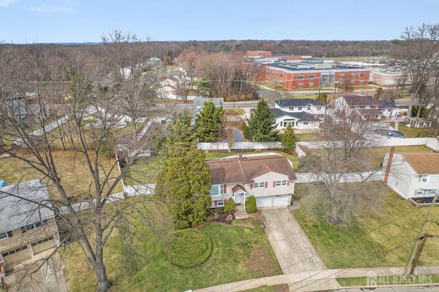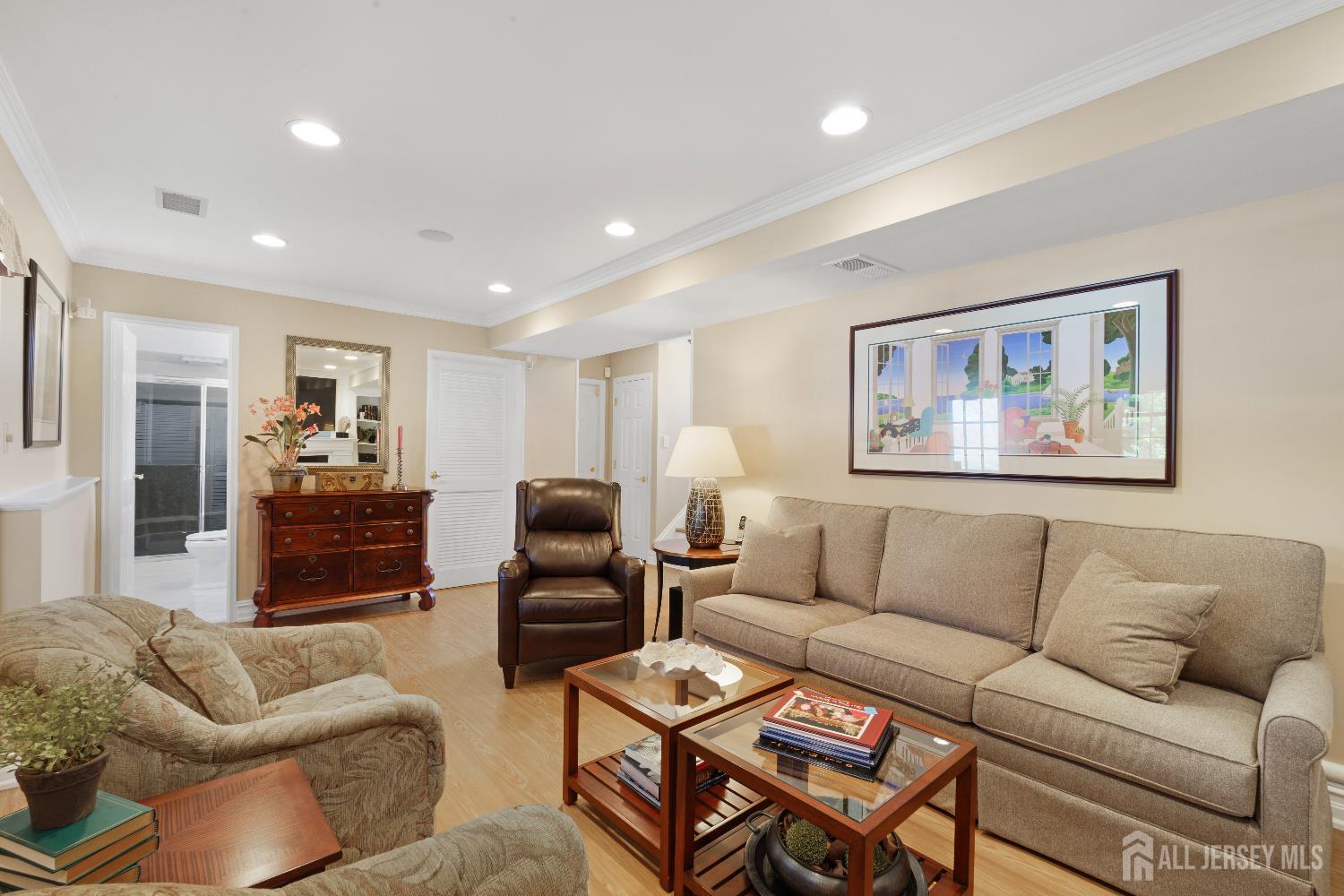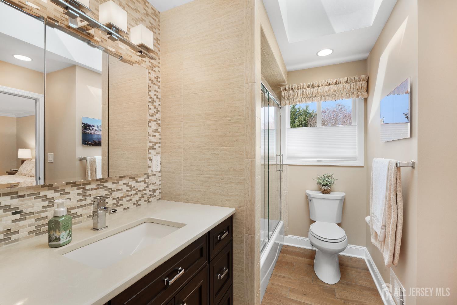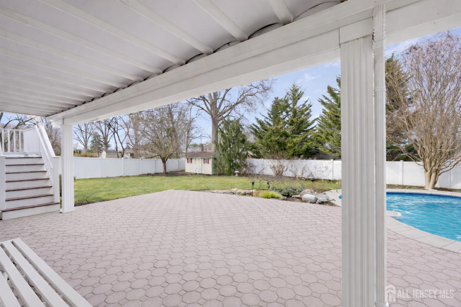 Welcome into this beautifully maintained home featuring a bright living room with large windows, recessed lighting, and elegant upgraded crown and base moldings that add architectural detail and craftsmanship. The spacious dining room provides an ideal setting for both everyday meals and entertaining, offering ample room for gatherings with family and friends. The dining area flows seamlessly into the kitchen, creating a comfortable and functional layout for hosting and daily living. The kitchen features granite countertops, stainless steel appliances, and sliders leading to a second floor composite deck overlooking the yardperfect for outdoor dining and gatherings. Motorized skylights in the kitchen and bathroom allow natural sunlight to pour into the spaces while also providing additional ventilation. The main level offers three bedrooms with generous closet space. Refinished hardwood floors throughout this level add warmth and timeless appeal. The ground level offers the potential for multi-generational living and includes a bedroom currently being used as an office with built-in cabinetry, a spacious family room with gas fireplace, full bathroom, laundry room, and convenient access to the garage and backyard. Step outside to beautifully professionally landscaped grounds featuring landscape lighting and a sprinkler system that keeps the lawn and gardens vibrant. The backyard is designed for relaxation and entertaining with a heated concrete pool and hot tub, along with an automatic pool vacuum for easy maintenance. The second floor composite deck includes a retractable awning and an under-deck drainage system that keeps the patio below dry. A paver patio provides additional space to relax or entertain. This exceptional home combines comfort, functionality, and outstanding indoor and outdoor living. Convenient access to schools and major highways.
