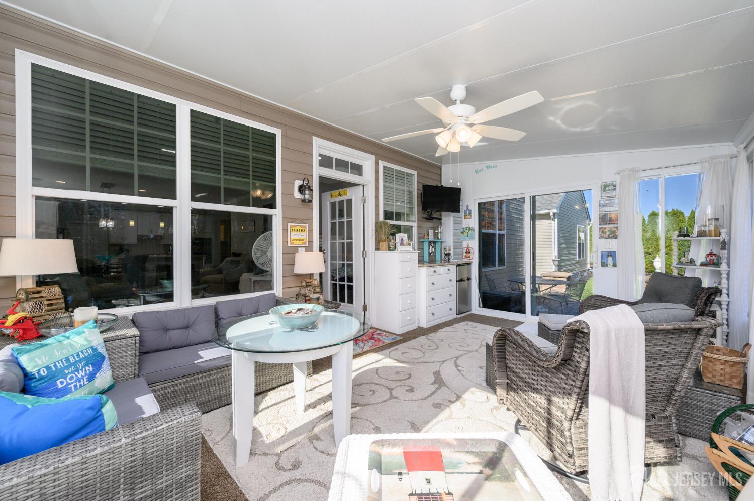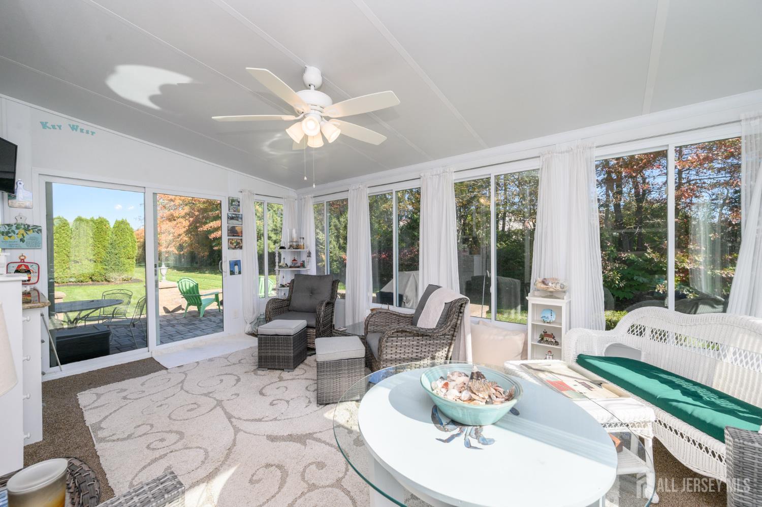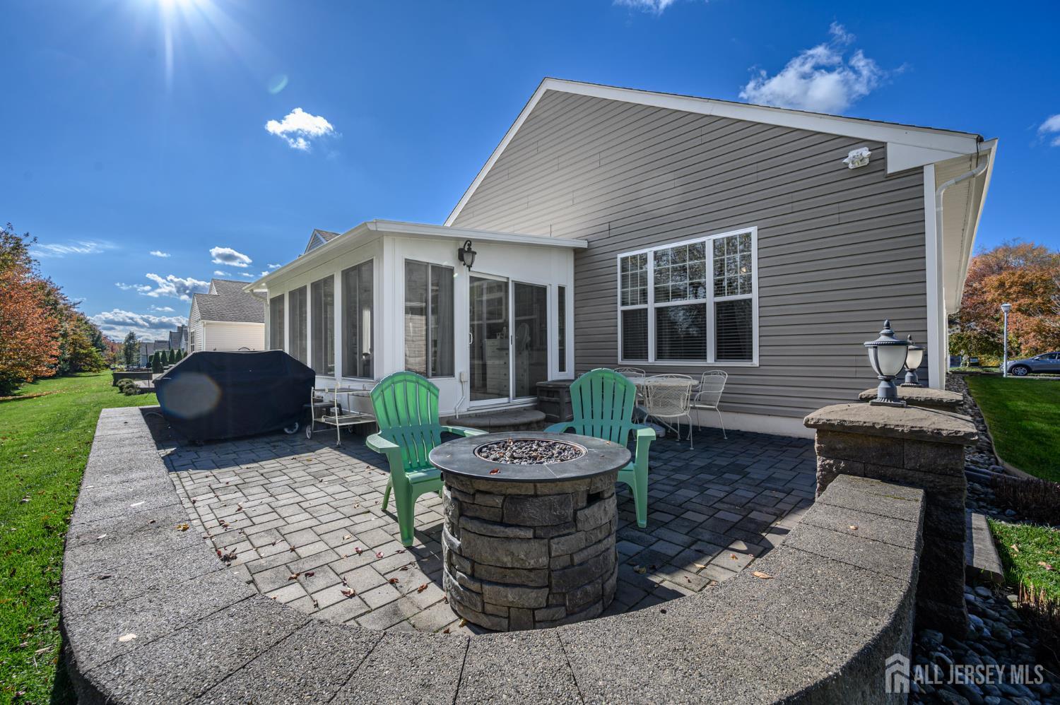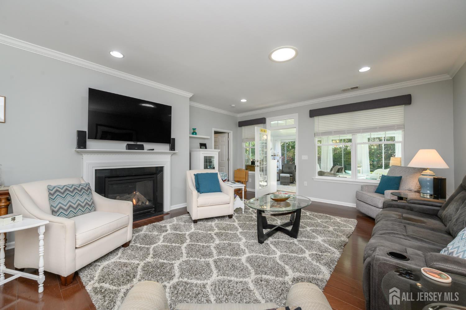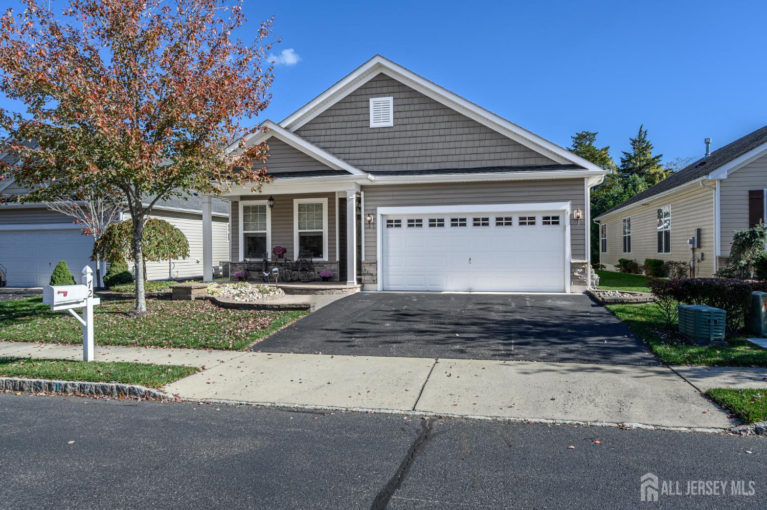 South Knolls at Jackson's 55+ Community premieres this stunning 2 Bed 2 Bath San Marcos model with Master Suite, blissful 3 Season Room, and 2 Car Garage on one of the larger lots with a 4' extension at build, sure to impress! Meticulously maintained inside and out with curb appeal in a sought after community with plenty of amenities to indulge, just pack your bags and move right in. Charming custom covered front porch welcomes you in to find a spacious, freshly painted, accessible interior offering easy one level living, featuring generous room sizes, hardwood floors that shine, elegant custom moldings, custom closets, and plenty of natural light all through. An accessible open layout makes for seamless living and entertaining. Lovely living room with cozy fireplace is perfect for the season, flowing right into the gourmet eat-in-kitchen. Newly renovated eat-in-kitchen will delight any home chef, offering sleek SS appliances, gleaming quartz counters, ample new cabinetry and drawers, an upgraded pantry, recessed lighting, sun soaked dinette space, and a large center island that is ideal for gathering. French door off the living room opens to your blissful 12x18 3 season room, cable equipped, offering walls of windows with peaceful, panoramic views, the perfect spot to enjoy your morning coffee or a good book. Down the hall, find the convenient in-unit laundry, main full bath, and 2 generous bedrooms, inc the Master Suite. MBR boasts its own walk-in closet and private full ensuite bath with dual sinks, vanity, and accessible stall shower. Plush outdoor area holds a 12x16 paver patio that backs to peaceful, park-like views with no neighbors for added privacy, along with a natural gas line to the patio, perfect for al fresco dining and grilling. 2 car garage with double wide drive offers plenty of parking, along with walk-up loft storage, an added bonus. Network wired, attic fans, central air/forced heat, the list goes on! Enjoy endless amenities such as clubhouse events, the outdoor pool, bocce, shuffleboard, tennis courts, pickleball courts, basketball courts, exercise facilities, and more! All conveniently located to shopping, dining, and major roads for an easy commute. Don't miss out! Truly a Move-in-Ready MUST SEE!!