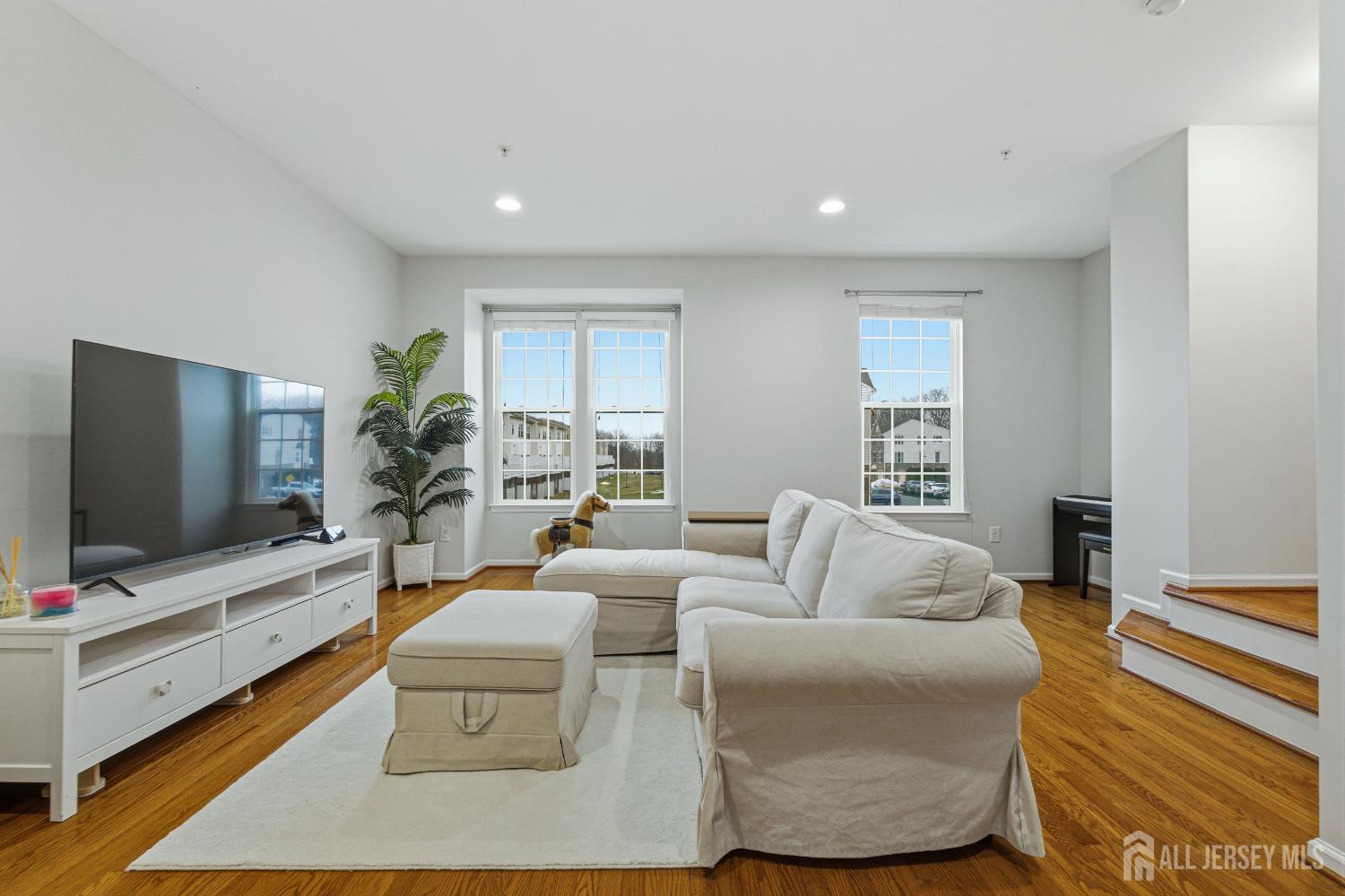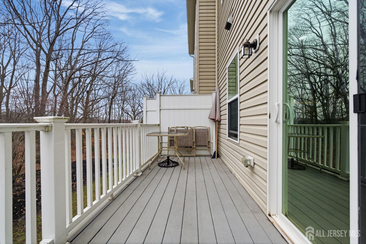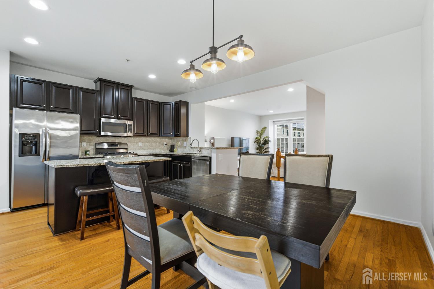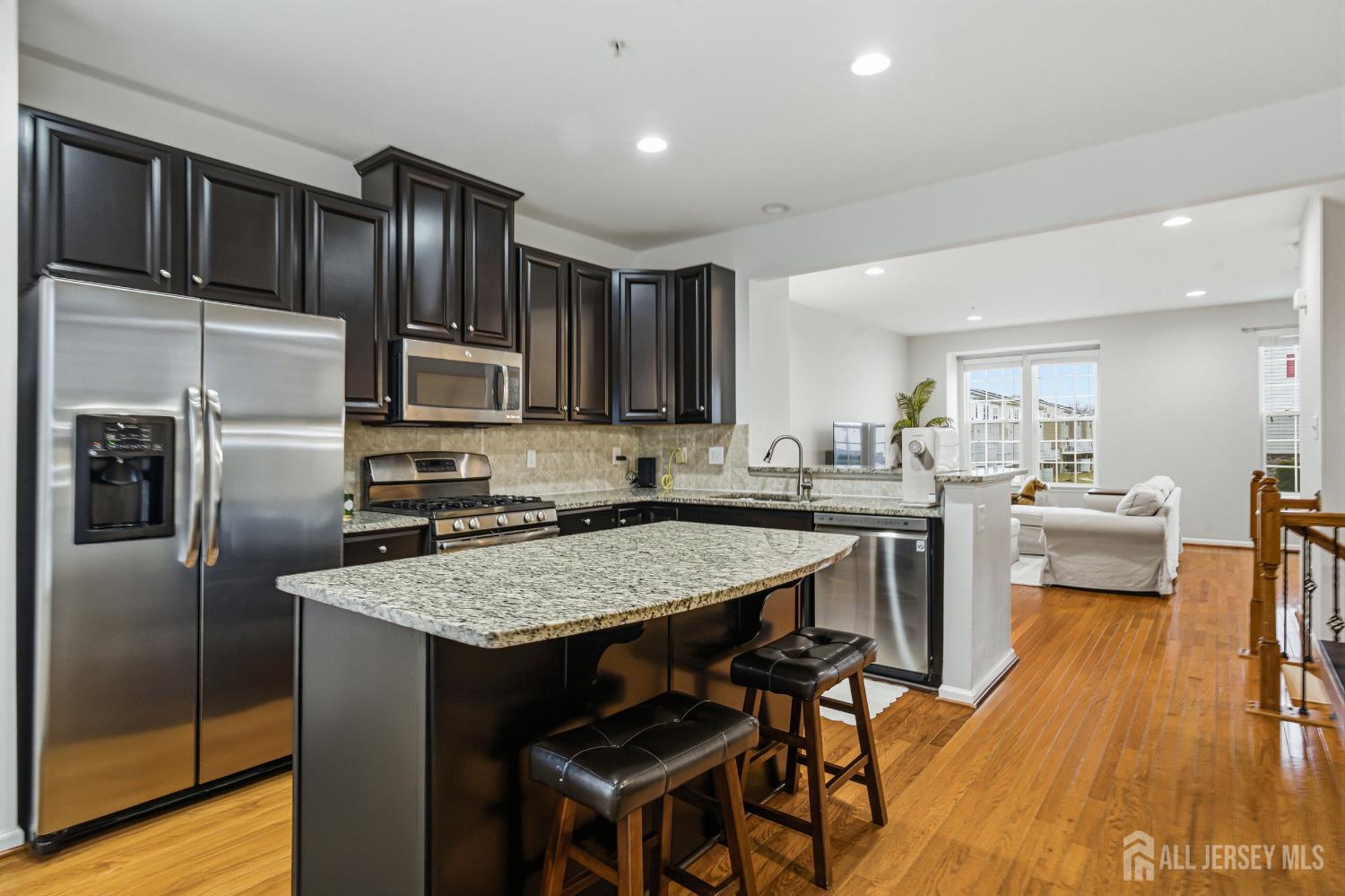 Welcome to this beautifully updated and move-in ready townhome offering 3 bedrooms and 3 full baths. Perfectly designed for modern living, this home blends style, space, and functionality across three finished levels. Step into the welcoming foyer featuring tile flooring, a convenient coat closet, and a separate shoe closet. The fully finished one-car garage provides excellent storage. The first floor showcases durable laminate flooring and offers incredible flexibility. A spacious room with walk-in closet, lighted ceiling fan, and full bath can easily function as a family room, guest suite, or fourth bedroom. The full bath is beautifully finished with tile flooring, granite countertop vanity, tiled tub/shower, recessed lighting, and window for natural light. Sliding doors lead to the backyard where you'll enjoy a paver patio beneath the deck and peaceful wooded views perfect for relaxing or entertaining. Upstairs on the second level, hardwood floors flow throughout the open concept living and dining areas, highlighted by recessed lighting and abundant natural light. The stunning kitchen features granite countertops, 42'' coffee-colored cabinets, stainless steel appliances, (new LG dishwasher) tile backsplash, pantry closet, and a center island with breakfast bar, drawers, and additional cabinetry. A slider off the dining area leads to a Trex deck, creating the perfect indoor-outdoor entertaining space. The third floor offers comfortable living with updated laminate flooring throughout. The primary suite impresses with a vaulted tray ceiling with accent lighting, lighted ceiling fan, walk-in closet, and a beautifully appointed ensuite bath featuring tile floors, double sink granite vanity, and a fully tiled glass-enclosed shower. Two additional bedrooms offer ample closets and ceiling fans, while the hall bath includes tile flooring, granite vanity, and tiled tub/shower with decorative border. A convenient laundry closet with newer LG front-loading washer and dryer completes this level. Outside, the home features a one-car driveway, concrete walkway, charming front porch with balcony above, and attractive stone and vinyl exterior. Additional guest parking is available nearby. Close to trains, bus line, shopping & all major roadways. 6 mins to beaches. This modern, stylish townhome with flexible living space and numerous updates is truly a must-see!